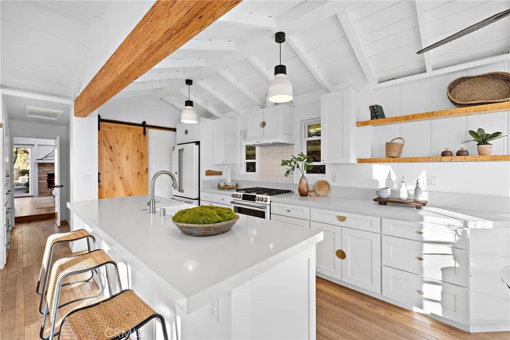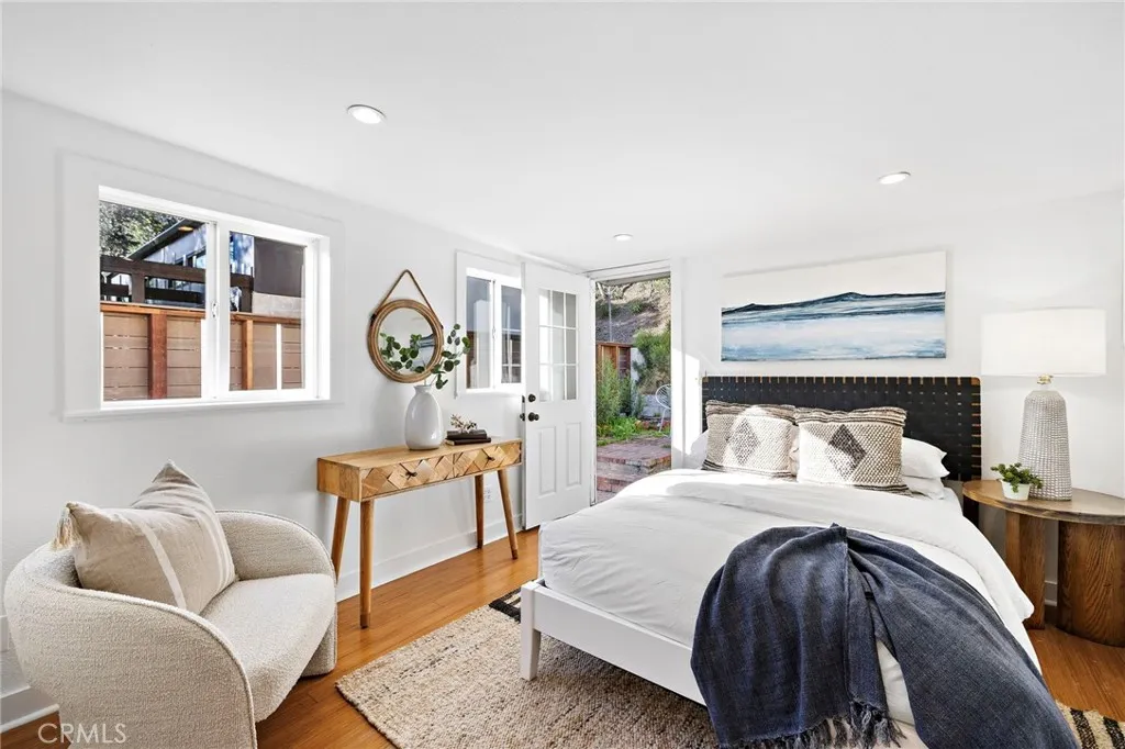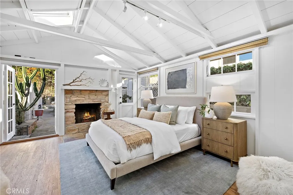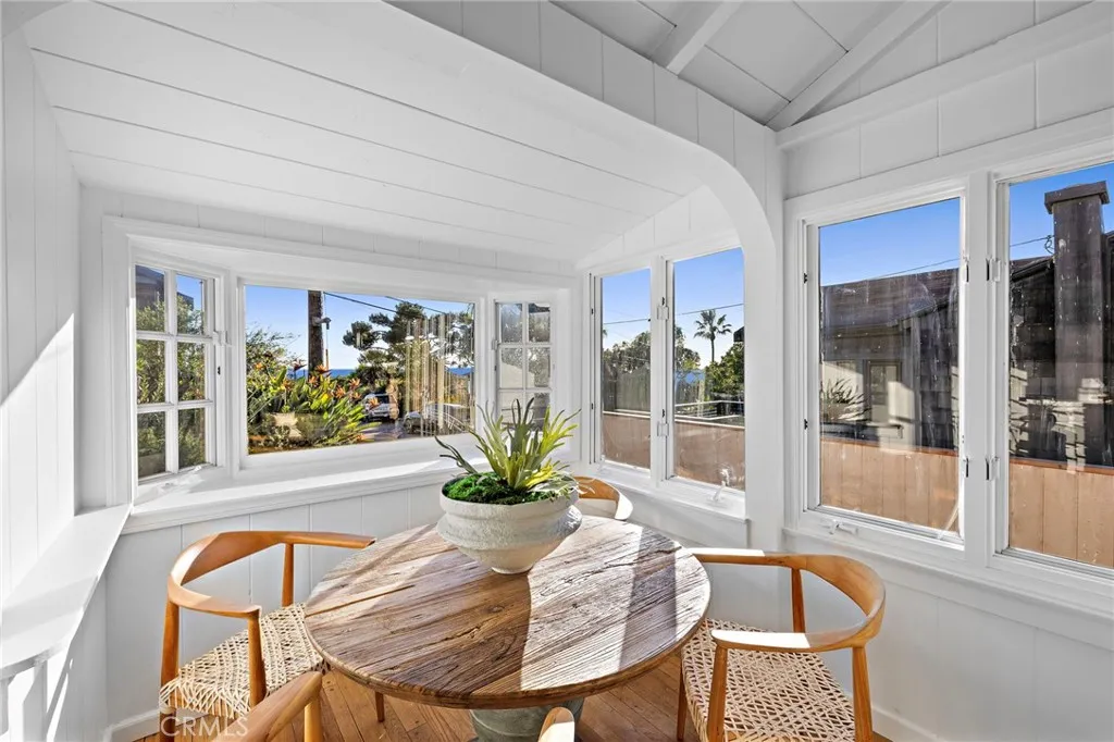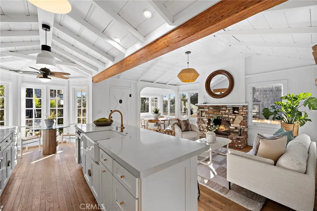 Classic 1938 ocean view cottage with guest house. The single level main residence presents two large bedrooms, two bathrooms and sunlit great room with remodeled kitchen, ocean view dining area, breakfast nook and a spacious living room with large fireplace. Accents include traditional beamed ceilings, oak flooring, custom lighting, an oversized kitchen island, French doors, dual-glazed windows, skylights, two art-crafted fireplaces and direct access to spacious professionally landscaped patios. The guest house has a 3/4 bath and ample space as the third bedroom, home office, media room or guest quarters. The primary rear patio offers a magical environment accented by an artistic outdoor fireplace - perfect for dining Al fresco. The 125 deep parcel rewards with four distinct patios, three garden areas, a small detached cabin, covered storage/workshop area and a long, gated driveway providing 3-4 off street parking spaces. The rear of the parcel backs up to SCWD open space giving a private buffer of natural greenbelt. This wonderful property is located three blocks to picturesque south coast beaches such as Table Rock Beach as well as shops, the community garden, Catalina Park and and the convenient trolley to town. For hiking, the Valido Trail commences around the corner. Come for a visit and stay for a lifetime.