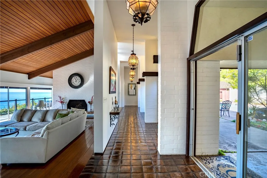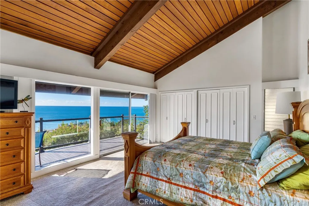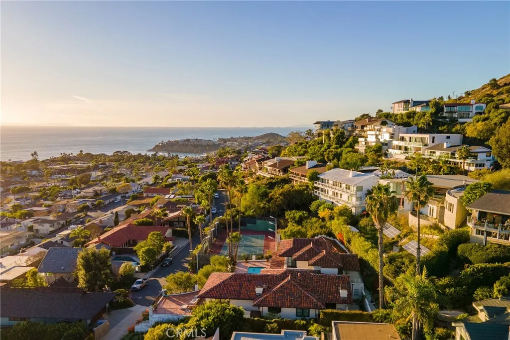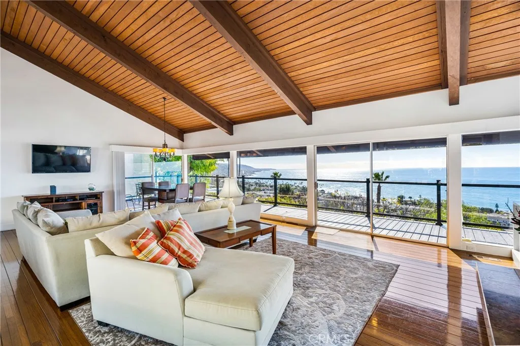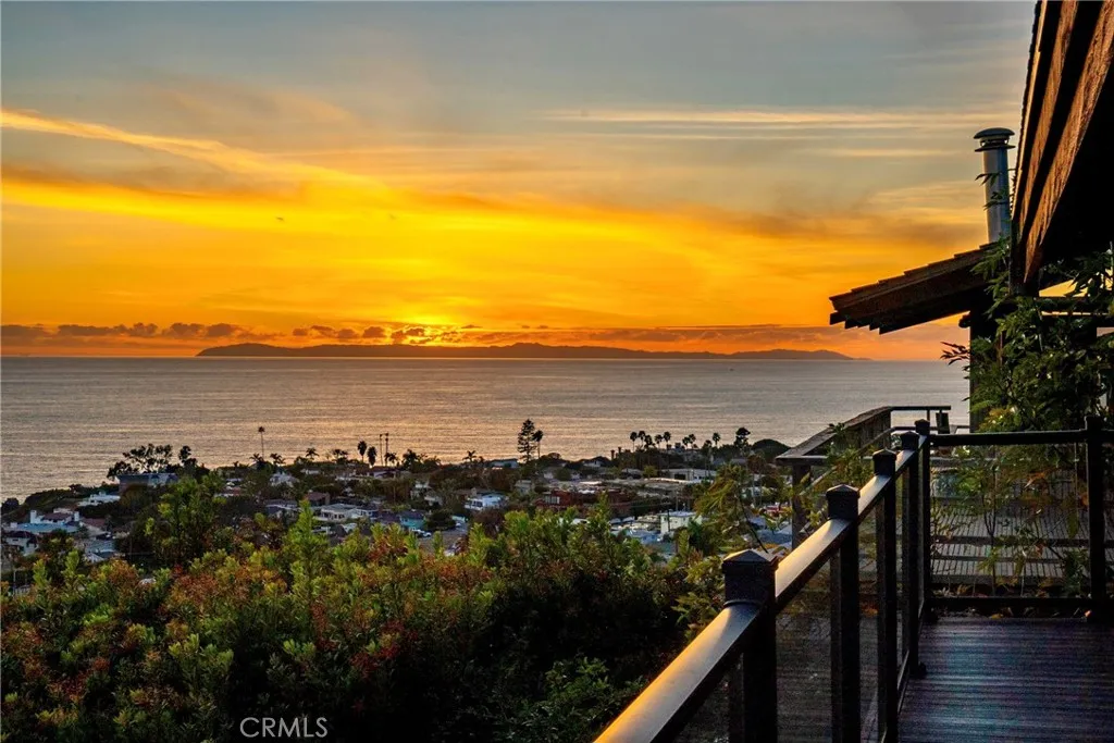 Awe-inspiring, panoramic Coastline, Catalina Island, and City light views from this gated Mid-Century Modern pool home in prestigious Crown Point. Enter the Private Interior courtyard patio which features a large pool (in-ground) surrounded by lush landscaping and a serene fountain. The open floor plan has walls of windows to the expansive ocean views, and a wrap-around patio/deck to lounge or dine alfresco. The Living Room has high-beamed ceilings, a large fireplace, and multiple seating areas from which you can enjoy sunrises over the sweeping Coastline to the south, and golden sunsets over Catalina Island to the north. This Mid-Century Style Charmer has soaring Redwood ceilings, Beautiful original wood floors, and Spanish tiles throughout. Most rooms feature floor-to-ceiling windows and glass doors that access the courtyard or 180-degree ocean-view deck. Three large bedrooms with panoramic views and a den/library (Could be 4th Bdrm) with a fireplace overlooking the patio/pool area offer ample space to enjoy the indoor/outdoor California lifestyle. The main floor primary bedroom suite has floor-to-ceiling windows overlooking Laguna Village, yet is completely private. The two bedrooms on the lower level are separated by a Family Room with another cozy fireplace. This property is situated on a huge street-to-street lot. Enjoy secluded sunbathing by the pool or wander down to Crescent Bay Beach and Village shops/restaurants - all just blocks away. Inquire for more details.