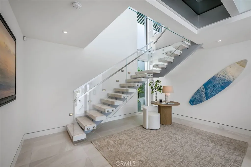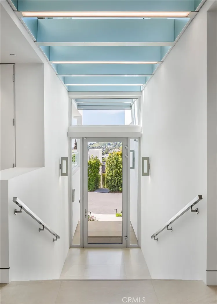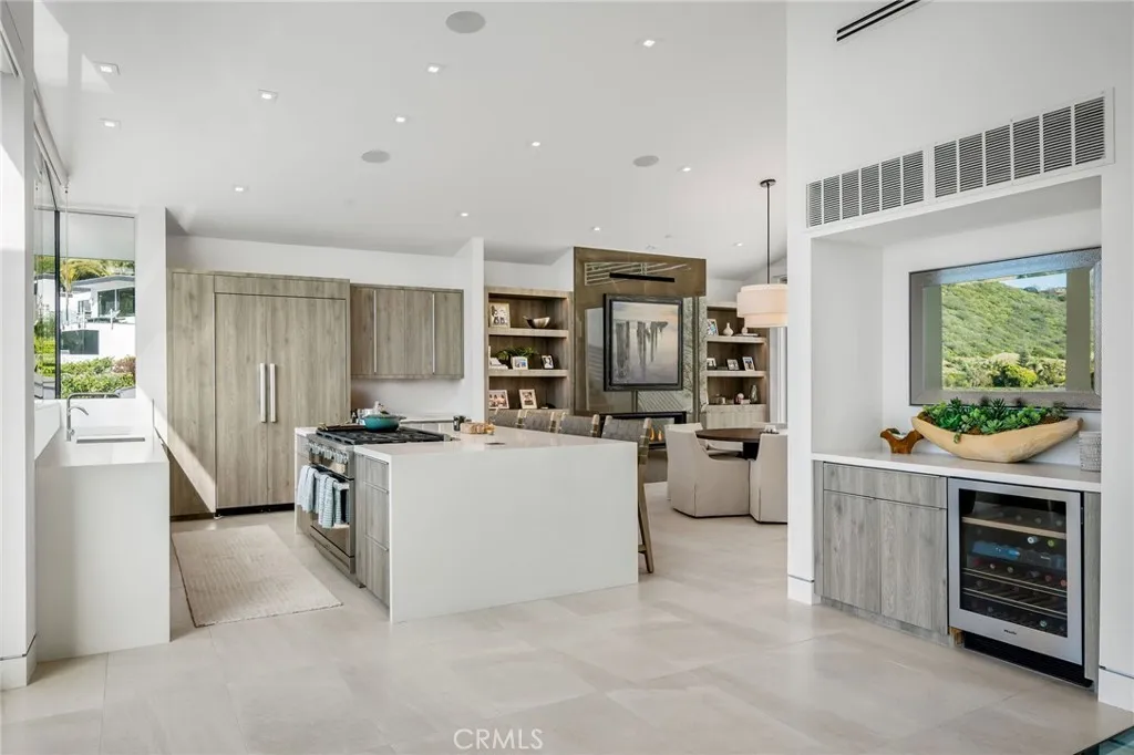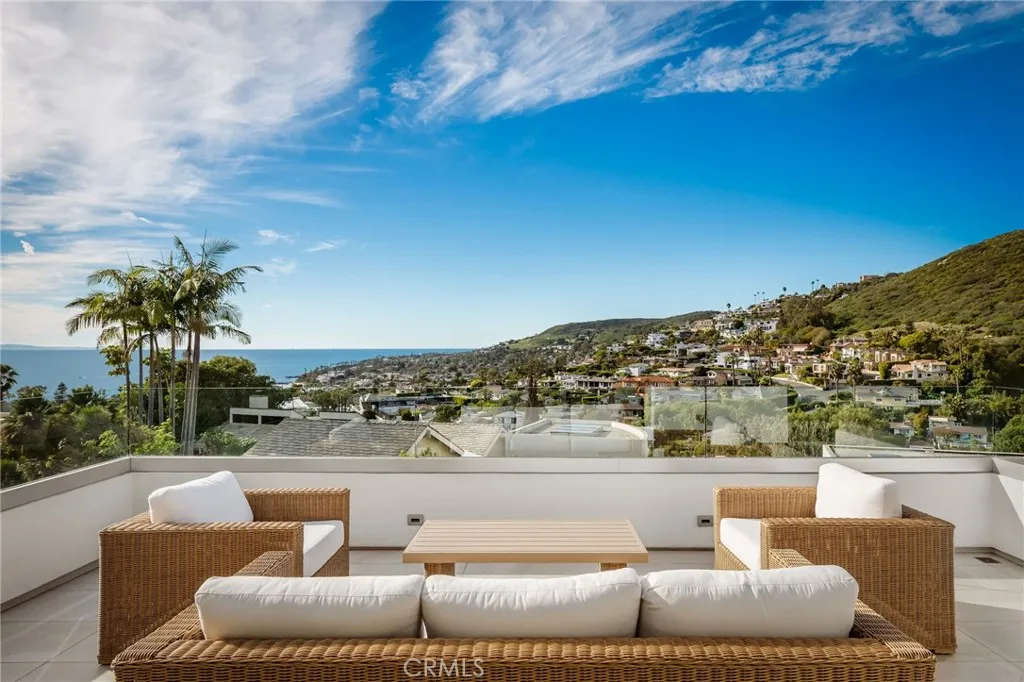 Experience the pinnacle of coastal modernism in this Paul McClean-designed residence situated in the Temple Hills enclave of Laguna Beach. Its three-bedroom, approximately 3,165 square foot floor plan is centered around the breathtaking white water, Catalina Island, and city light views while remaining exceptionally private. The dramatic entryway offers an immediate impression of architectural brilliance, with a mono-stringer staircase and a glass sky bridge that seamlessly extends from the interior out onto a generous outdoor deck with two distinct sitting areas. Sophisticated finishes abound, including sandstone-style tiles, automated blinds, a built-in sound system, and an elevator for effortless access from the garage to all three floors. The upper, main level of this home is centered by a chefs kitchen featuring a waterfall quartzite island, an eight-burner Miele stove, integrated refrigeration, a wine fridge, and premium Grohe and Kohler fixtures. Configured as one voluminous, open space, this floor also offers a dining area with access to the rear exterior patio and the ocean-facing living section of the home. Below, the primary suite is a sanctuary of luxury, boasting a linear fireplace, an office alcove, dual closets, and a spa-like bath with a soaking tub positioned before a picture window. Every sleeping area enjoys its own terrace access, including two ocean-facing secondary bedrooms on the lower level that open to their own patios. With multiple access points to the outdoors from the main living area and linear fireplaces in the living, dining, and primary room