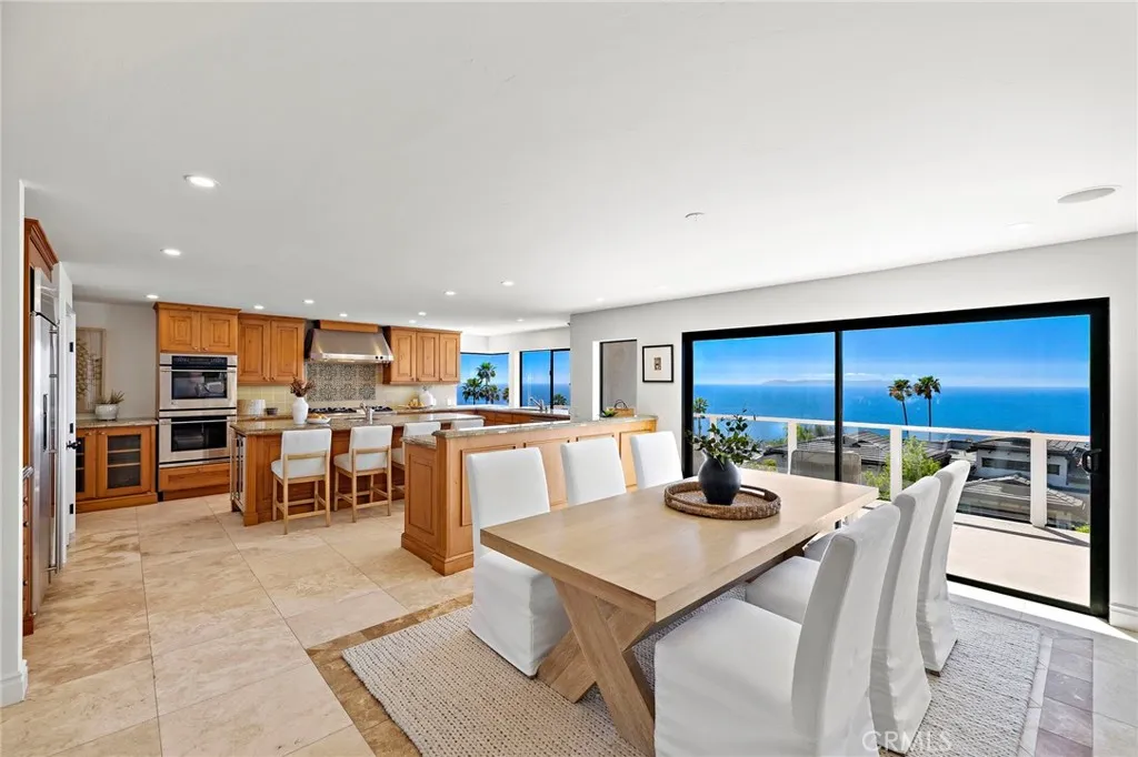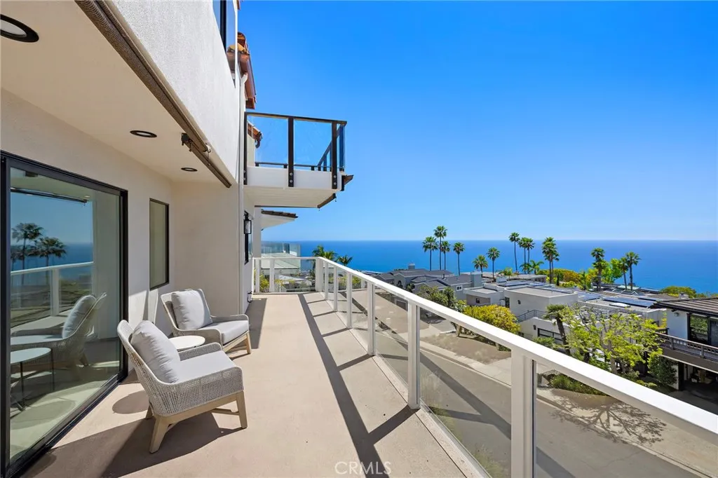 Experience sweeping, white water and coastline views from this beautifully appointed Mediterranean residence, located in the coveted hillside Portafina neighborhood of Laguna Beach. Showcasing breathtaking panoramas that span from San Clemente to Catalina Island and all the way to Palos Verdes and the Santa Monica Mountains, the home captures the essence of coastal living from nearly every vantage point. A private courtyard entry introduces the home, leading into a light-filled formal living room with soaring ceilings and marble flooring. French doors open directly to the courtyard, creating a natural indoor-outdoor flow, while one of the home's three fireplaces anchors the room with warmth and character. The kitchen, dining, and family room come together as one cohesive space, creating an easy, natural flow throughout the main level. The kitchen is perfectly positioned to take in the view, featuring a generous center island with breakfast bar, ample storage, and uninterrupted ocean vistas. It opens to the dining area and adjacent family room, where a second fireplace and a wall of windows frame the Laguna coastline beyond. Sliding doors open to an expansive deck, ideal for entertaining or simply taking in the ocean breeze and endless sunsets. Upstairs, a striking wrought iron staircase leads to four bedrooms, all finished with rich bamboo flooring. The primary suite is a true retreat, offering mesmerizing views, a private ocean-facing deck, and its own fireplace, creating a quiet, elevated escape. The en-suite bath continues the experience with unparalleled views, a spacio