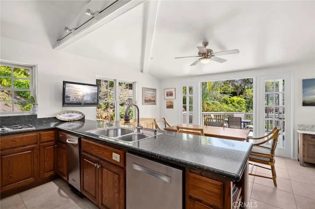 Experience refined coastal living in this ocean-view residence, ideally located in one of Laguna Beachs most desirable neighborhoods. Just a short stroll from acclaimed restaurants, art galleries, world-renowned beaches, and the vibrant heart of Laguna Village, this timeless home offers the ultimate blend of charm, lifestyle, and convenience. The property beautifully combines classic architectural character with modern comforts. Offering four bedrooms and three-and-a-half bathrooms, the flexible floor plan includes a separate entrance to the lower-level rooms, ideal for guests, extended family, or a creative studio space. A main-level bedroom allows for single-level living and connects to an additional room that can serve as a den, media room, or family room, with access to a spacious finished storage area. At the heart of the home, a sunlit family kitchen with ample storage opens to a generous ocean-view deckperfect for al fresco dining, garden views, and breathtaking sunsets over Catalina Island. A flat grassy yard and mature landscaping create a peaceful, private outdoor retreat. The primary suite is a tranquil sanctuary, featuring sweeping ocean views, natural light throughout, vaulted ceilings, and an oversized skylight that fills the space with sunshine by day and starlight by night. The en-suite bath offers garden views, a soaking tub, and a separate shower for a spa-like experience. The homes prime location makes it easy to leave the car behind and explore magnificent beaches, scenic parks, and the celebrated restaurants, cafes, galleries, and boutiques that make La