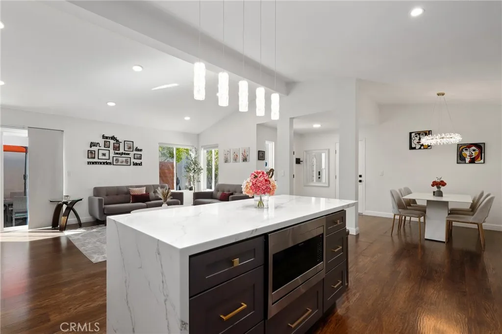 Welcome to the desirable Aspen Creek community of Laguna Hills. This charming single-level home offers an inviting open floorplan with soaring vaulted ceilings and recessed lighting, creating a bright and spacious atmosphere throughout. The living room features a classic brick fireplace and flows seamlessly into the dining and kitchen areasideal for both everyday living and entertaining. The remodeled kitchen showcases quartz countertops, a stylish subway tile backsplash, and ample cabinetry. The primary bedroom serves as a relaxing retreat with an upgraded en suite bathroom. A second spacious bedroom and adjacent full bathroom provide comfort and flexibility for guests, family, or a home office. Step outside to a serene and tranquil backyardperfect for relaxing, gardening, or enjoying peaceful outdoor living. Located in the sought-after Aspen Creek community, this home combines comfort, style, and convenience in a wonderful setting.