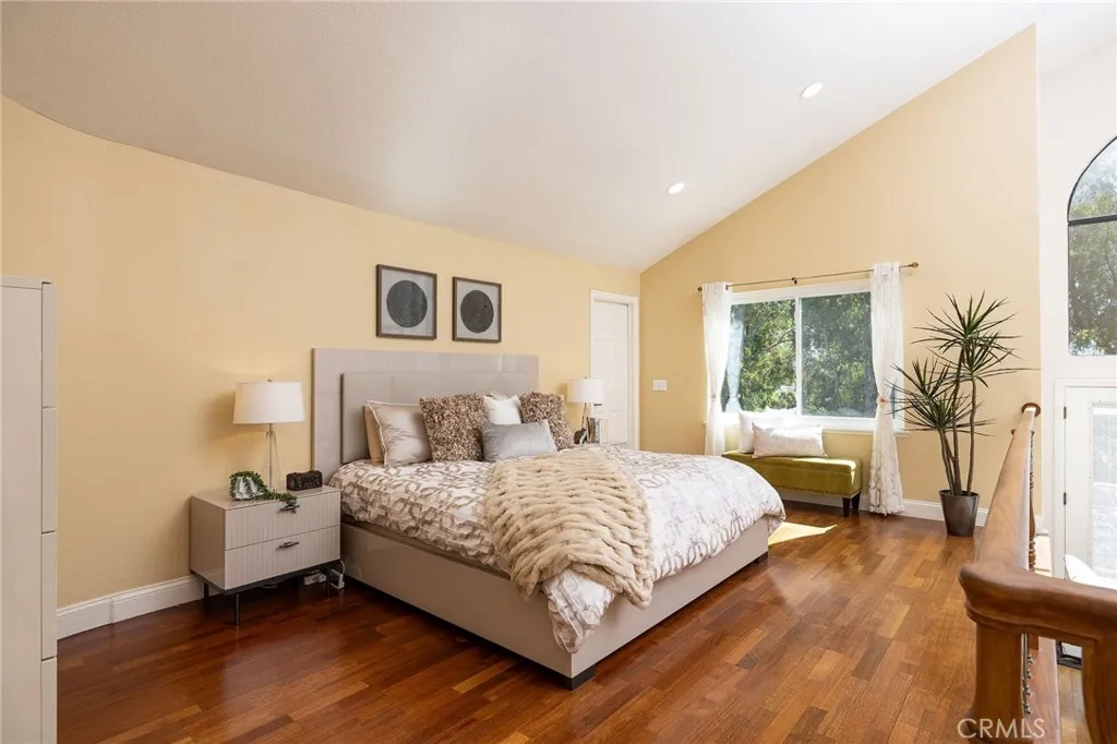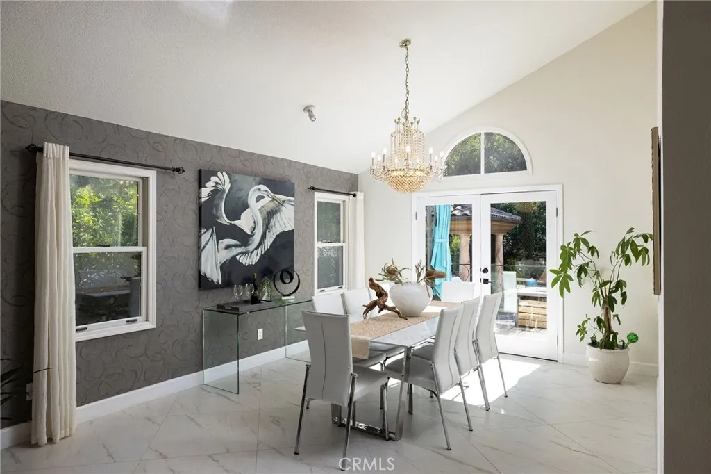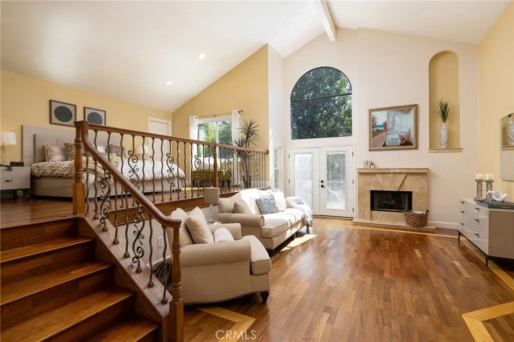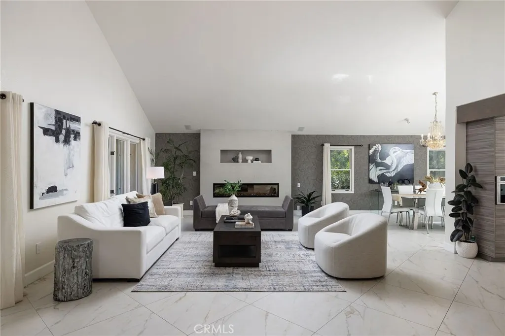 Resort-style luxury in Nellie Gail Ranch! This impressive estate features a designer remodeled interior, extensive upgrades including paid solar, and a backyard pool and spa oasis, all backing to tree-lined views. Inside, approximately 4,000 square feet of airy, open living unfold across five bedrooms and five bathrooms in a split-level configuration. The living room centers around a striking contemporary fireplace, featuring soaring vaulted ceilings and an open-concept flow to the gourmet kitchen. This chef's delight features an expansive center island, professional-grade stainless appliances, custom cabinetry, and a full-size wine fridge, with an adjacent elegant dining space. A lower-level family room with its own fireplace and built-in bar opens through sliding doors directly to the patio, making indoor-outdoor entertaining effortless. Downstairs, you will also find a bedroom with a neighboring bath, offering flexibility for guests, a home office or multigenerational living. To round off this floor, you will enjoy a dedicated laundry room and direct access to your 3-car garage with a Tesla charger. Upstairs, the primary suite is a true retreat with dramatic vaulted ceilings, a cozy fireplace, and a dedicated sitting area that opens to a private balcony. The spa-inspired primary bathroom includes an oversized shower, a luxe dressing-room style closet, and its own balcony access. Two secondary bedrooms and an upgraded bathroom complete this functional floor plan. Out back, the private grounds are built for year-round living. A sparkling salt-water pool and spa, outdoor fi