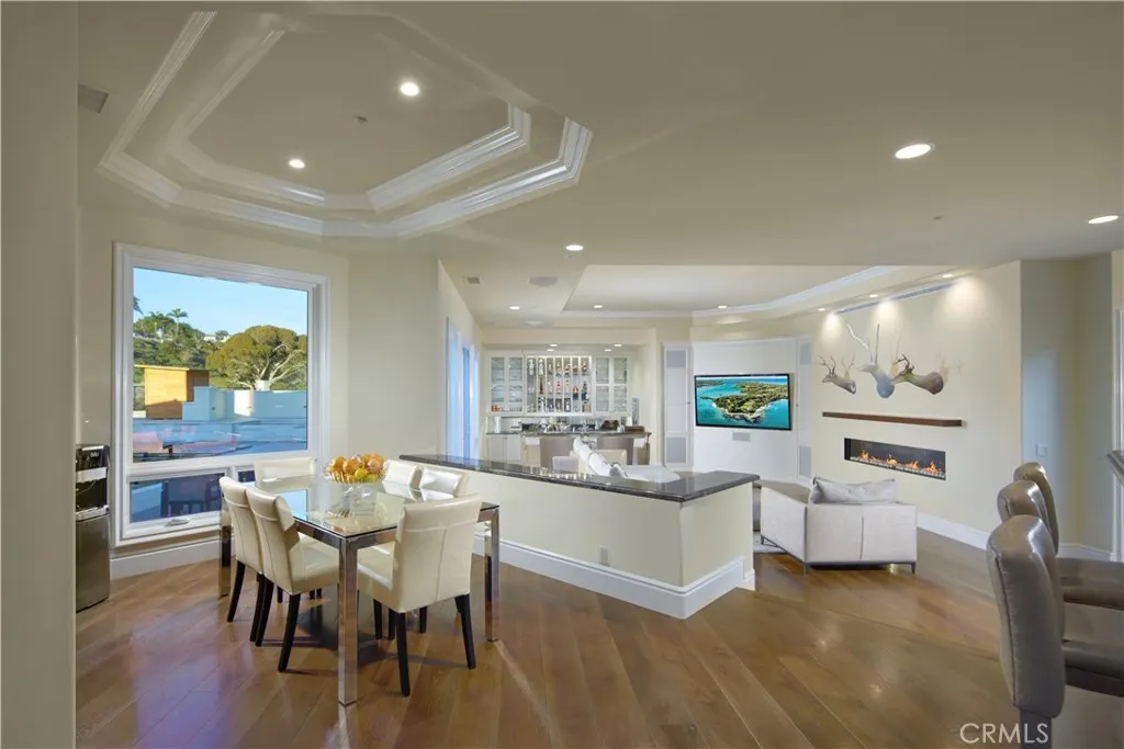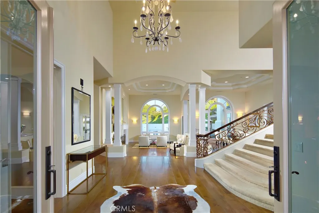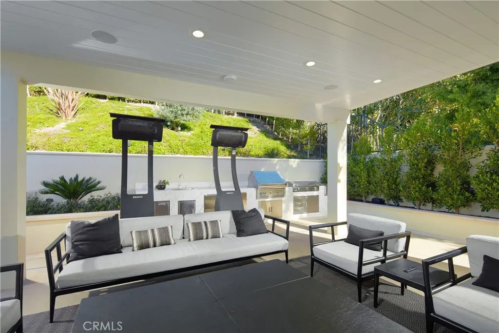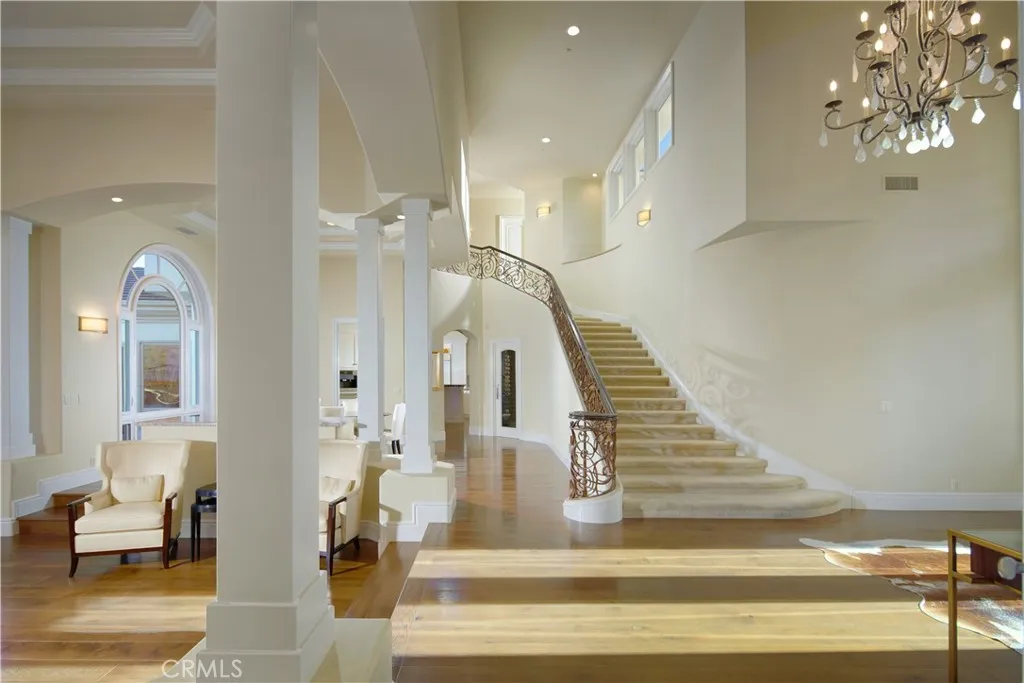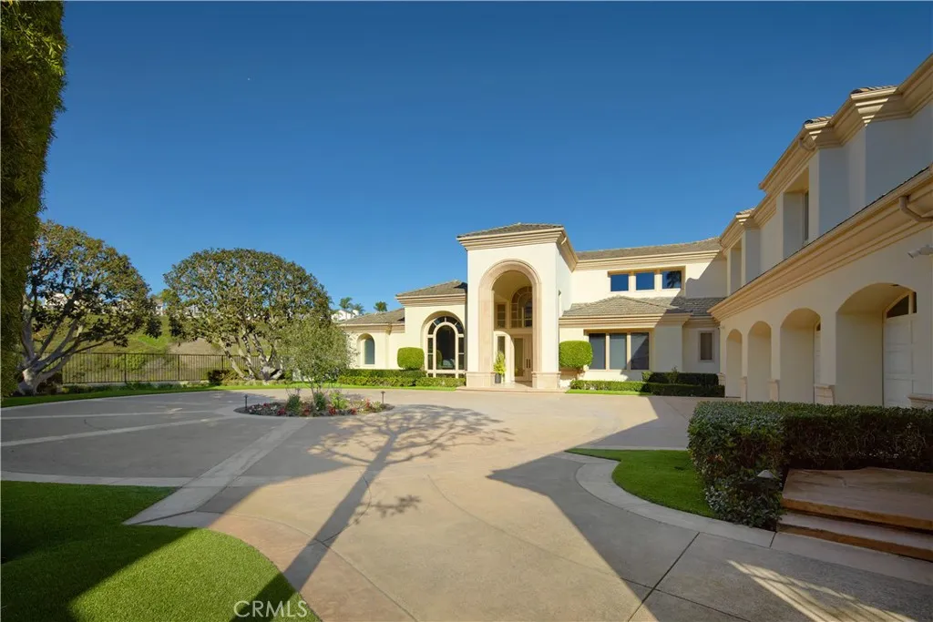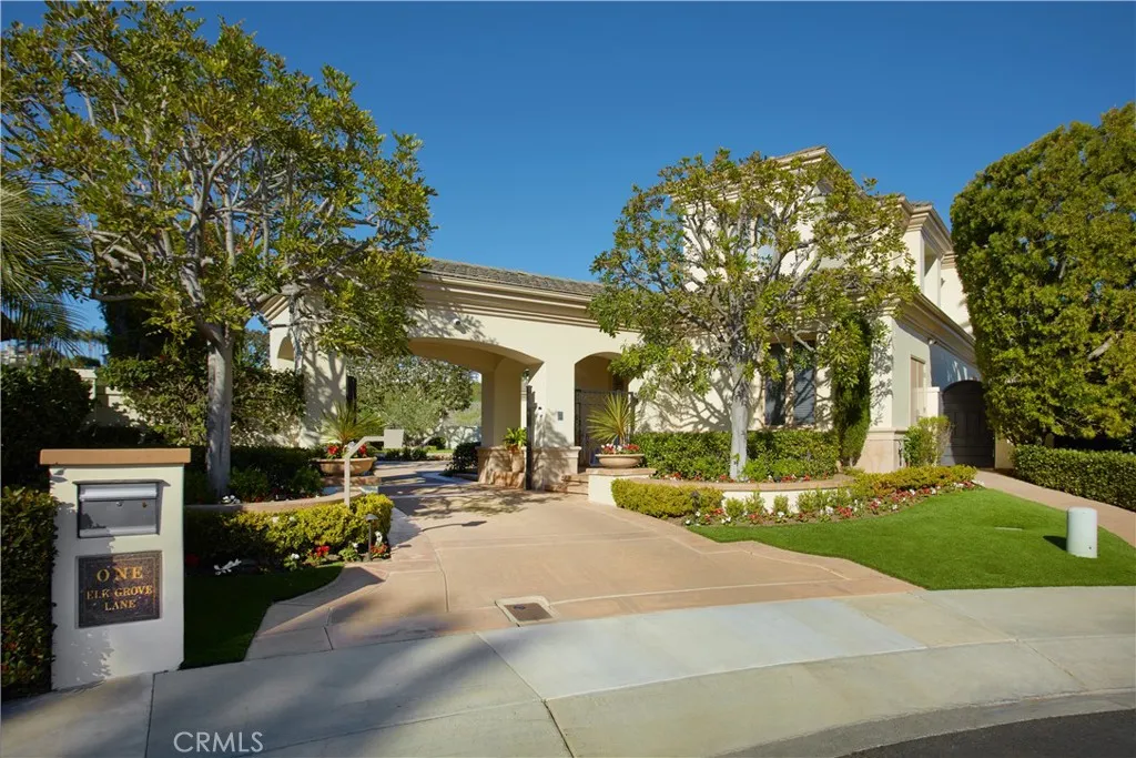 Welcome to 1 Elk Grove, an exceptional estate located within the prestigious Ocean Ranch community of Laguna Niguel, an exclusive guard-gated enclave set against rolling hills, canyon vistas, and sweeping coastal views, perched above Dana Points Monarch Beach. Just minutes from Salt Creek Beach, Dana Point Harbor, and world class resorts including The Ritz-Carlton, Laguna Niguel and Waldorf Astoria Monarch Beach, this private, limited access community offers an unparalleled coastal lifestyle. The arrival experience is equally impressive. Enter through a wrought iron gate into a private motor court adjacent to the four car garage, offering ample space for guests and valet style parking. Inside, the home features a highly sought after main level primary suite, along with a main floor guest bedroom and bath. A light filled office/library provides an inspiring workspace. A grand entry foyer welcomes you inside, where soaring ceilings, expansive windows, and an abundance of natural light immediately showcase the homes bright, open floor plan. Sophisticated yet inviting, this beautifully designed residence blends elegance with effortless comfort. The custom bar enhances the homes entertaining experience, creating the perfect setting for the home mixologist, while the kitchen is complemented by all Wolf appliances and a Sub-Zero refrigerator. The resort style backyard is a true sanctuary, featuring a sparkling blue pool with waterfall and spa, Sauna, tranquil water features, fire elements, expansive outdoor dining, heated lounge areas, built in BBQ, and a convenient pool bathroom.