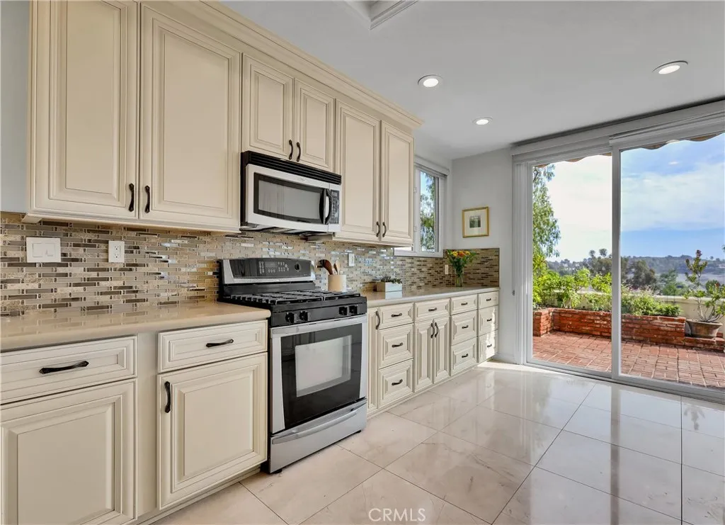 Elegant turnkey home blessed with a prime corner lot location backing to the canyon with stunning panoramic sunrise, mountains, and peaceful canyon views! Superbly located in the desirable Encore at Marina Hills, this exquisite home has been beautifully designed with gorgeous features throughout providing a graceful living experience. Step inside and soak in the light filled interior, luxurious marble tile floors throughout, recessed lighting, and a well-designed floor plan which includes a highly prized main level full bath PLUS a bonus room perfect for an executive home office or 3rd bedroom. The living area is an ideal gathering space around the handsome stacked stone fireplace, with sliding doors providing tranquil views and direct access to the back patio, a perfect indoor-outdoor living space. The timelessly elegant kitchen has been remodeled with natural stone counter tops, high end wood cabinetry, custom glass tile backsplash, upgraded stainless steel appliances, an abundance of storage space, a sunny breakfast nook, and direct access to the patio creating a great flow for entertaining. The full bathroom on the main level has been recently updated with new Quartz topped vanity, new fixtures and faucet, new mirror, and new custom lighting. Upstairs there are 2 bedroom suites, each with ensuite bathrooms, including a spacious bedroom suite with vaulted ceilings, a private view balcony for enjoying the amazing views with an evening glass of wine with a loved one, a walk-in closet, and a spacious bathroom with dual vanities, updated glass tile countertops and shower sur