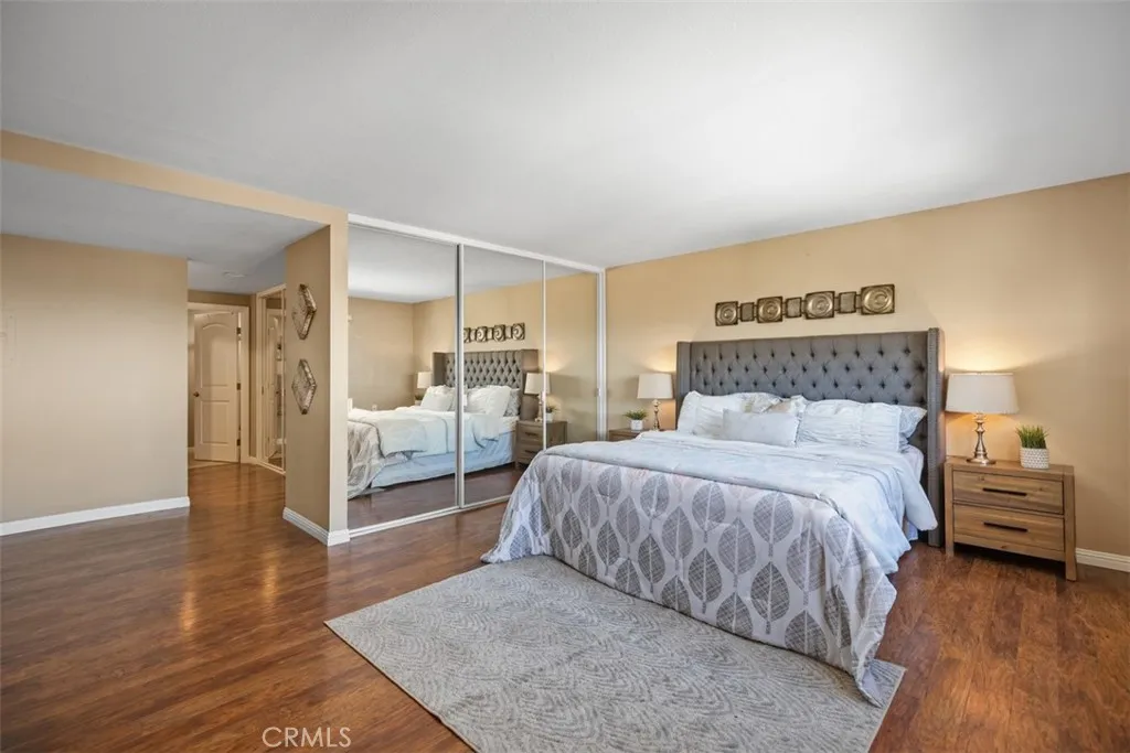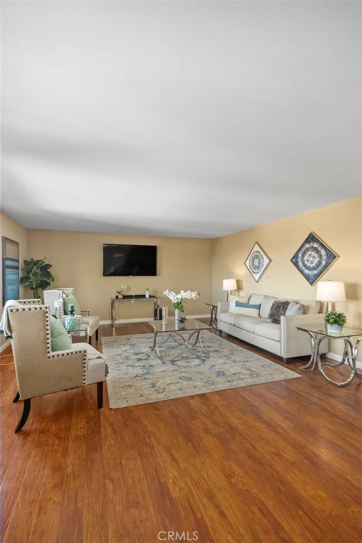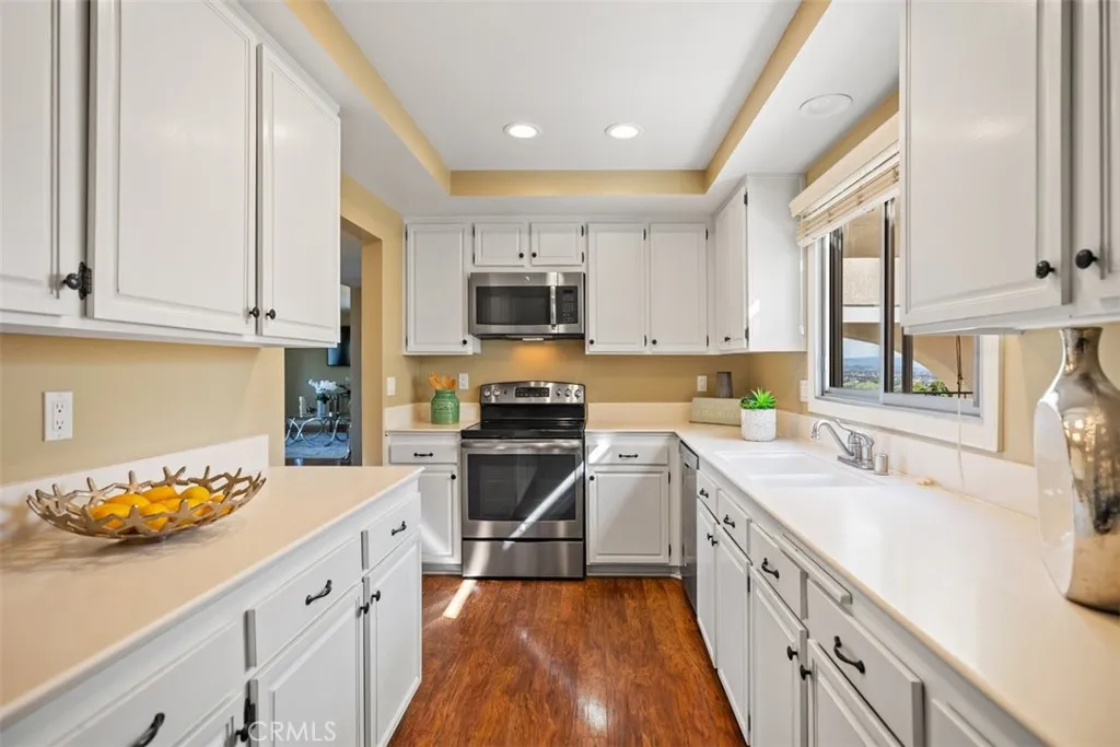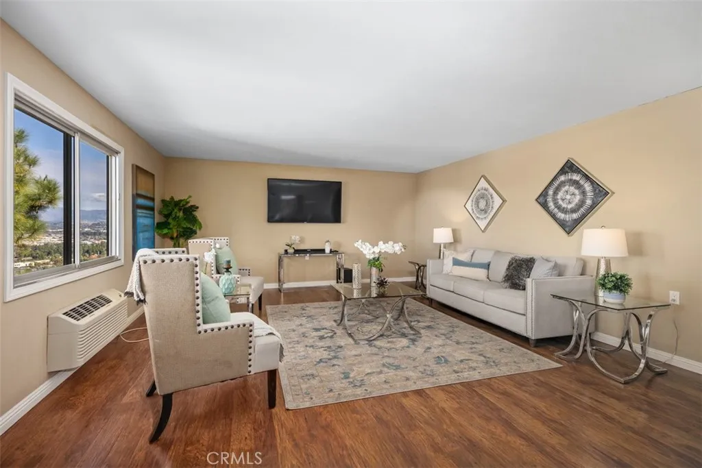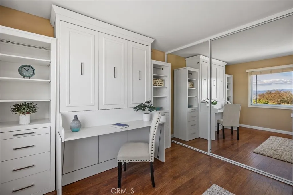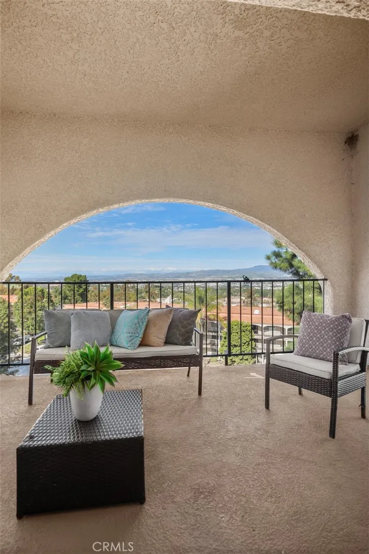 Top-of-the-world panoramic views set this spacious "El Mirador" end unit apart. Perched at one of the highest points in Gate 14, this bright three-bedroom, two-bath home offers over 1,700 sq ft of living space with a breathtaking 180-degree backdrop that stretches across the valley, twinkling city lights at night, and distant mountain ranges. From sunrise to moonrise, the ever-changing scenery becomes your daily view. Wide sliding glass doors lead to a large covered balcony framed by the signature archway, the perfect place to relax and take it all in. Inside, the home feels open and inviting with smooth ceilings, warm wood-look flooring, and an expansive living room that flows into a dining area ideal for everyday meals and entertaining. The kitchen is fresh and functional with white cabinetry, ample counter space, recessed lighting, and stainless appliances, plus a convenient breakfast nook. A built-in wall bed and desk area adds excellent flexibility for guests, a home office, or hobby space. The oversized primary bedroom offers generous closet space, and the additional bedrooms are well-proportioned for comfortable living. Two bathrooms provide day-to-day convenience, and the thoughtful layout offers great separation of spaces for privacy. Located within the vibrant, Active age 55+ guard-gated community of Laguna Woods Village. Residents enjoy an unmatched resort-style lifestyle featuring 7 clubhouses, 5 swimming pools, private community golf courses with a 27-hole championship course plus a 9-hole executive course, driving range, tennis and pickleball, fitness centers,