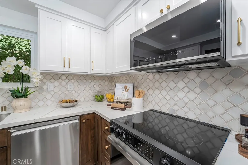 Experience refined living in this beautifully renovated Villa Puerta model at 5372 Punta Alta, Manor 1C, located in the heart of Laguna Woods Village. From the moment you step through the first-floor entry with custom iron gates and striking double doors with frosted glass inserts, youll be captivated by the homes craftsmanship and thoughtful design. Inside, 8-inch wide luxury vinyl plank flooring flows throughout the main living areas, complemented by dual-pane windows and sliding glass doors that fill the home with natural light. The expansive living room showcases two bifold doors flanking a warm wood accent wall, an electric fireplace, and ample space for a mounted television. Hidden storage behind the accent wall adds convenience. The dining area features wainscoting in rich dark tones and a modern LED fixture, tying together the homes sophisticated style. The chef-inspired kitchen boasts quartz countertops, a floating center island with additional storage, a Samsung French-door refrigerator, full stainless and black appliance suite, white shaker upper cabinets, dark lower cabinetry, and a stunning patterned tile backsplashall illuminated by adjustable LED lighting. Retreat to the luxurious primary suite, where octagon-patterned tile flooring meets a spa-like bath featuring a marble-topped vanity with dual mirrors, light wood cabinetry, and a marble walk-in shower with rain-style showerhead, built-in niche, and seating. The suite also offers a triple-door mirrored wardrobe, LED lighting, and serene views. The secondary bedroom includes plantation shutters, recessed lig