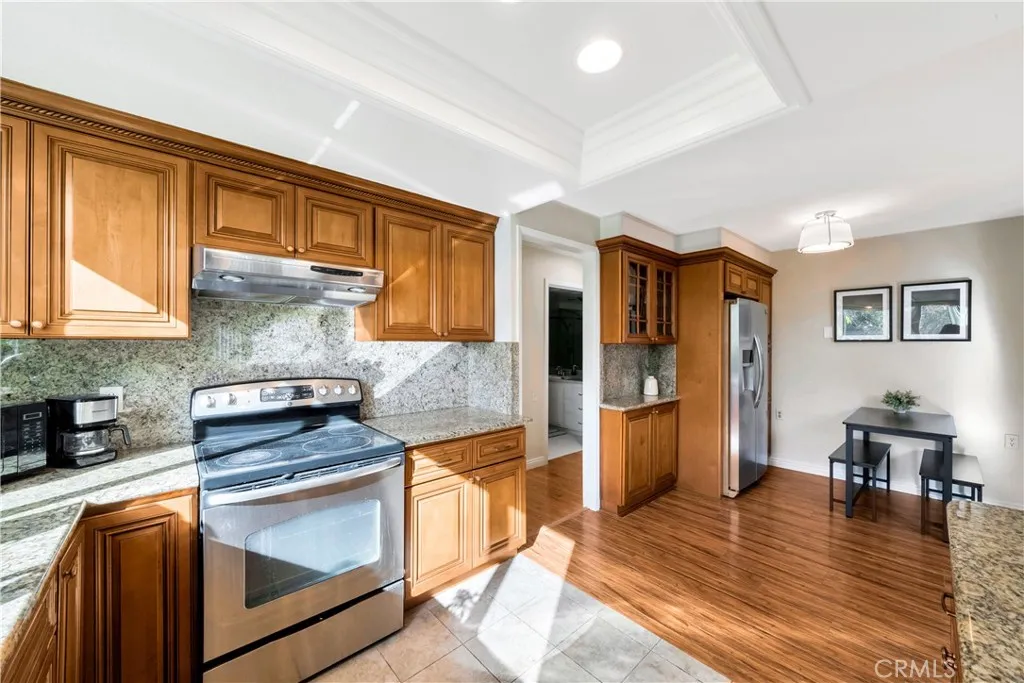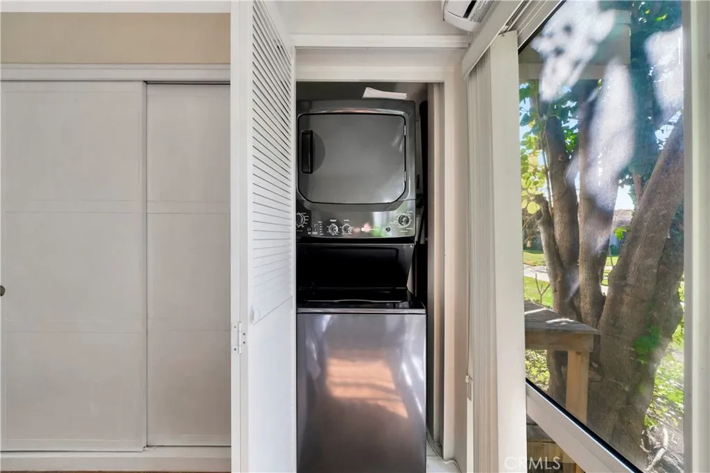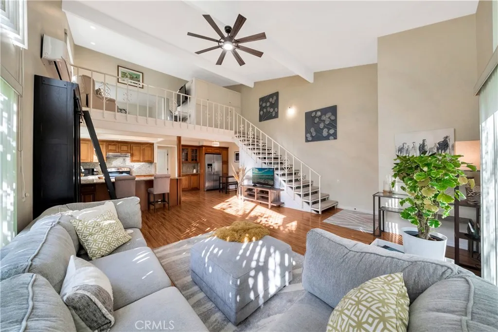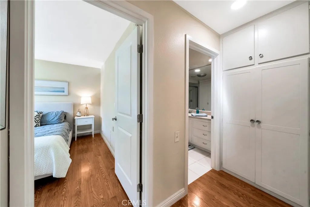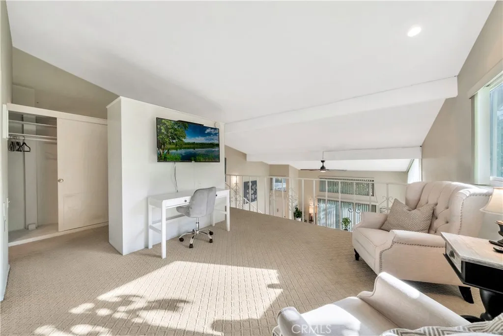 Welcome to this beautifully remodeled, easily accessible end-unit Seville model townhouse-style co-op, located in a gated 55+ resort-style active living community. This charming home feels like a single-family residence, with no one above or below, and is priced furnished (think AirBNB with disheslinens, etc) or can be sold unfurnished. The home features smooth vaulted ceilings and abundant natural light from newer dual-pane windows. Downstairs, elegant wood-look flooring enhances the bright, open layout. The open and remodeled kitchen offers custom cabinetry, a built-in china cabinet, recessed lighting, tile flooring, granite countertops, and a dual-sink with a view. The spacious kitchen is equipped with a glass-top range, microwave, dishwasher, and two refrigerators. A large sliding glass door opens to a private patio surrounded by lush greenspaces, perfect for relaxing with pets. The garden includes a lemon tree, pomegranate, dragon fruit, and colorful flowers. The home has a main-level primary suite, upstairs second suite/loft bedroom, and a large attic with pull-down ladder for storage. Three new (2022) energy-efficient mini-splits provide year-round comfort. Conveniently located with abundant parking right in front (no steps) and a carport (spot #1) with extra storage. As a co-op, the HOA maintains many of the interior elements. Close to shopping, dining, Clubhouse #1, and the community library. Laguna Woods Village boasts unparalleled amenities, including five heated swimming pools, four hot tubs, seven clubhouses, and a 27-hole championship golf course with a clubho