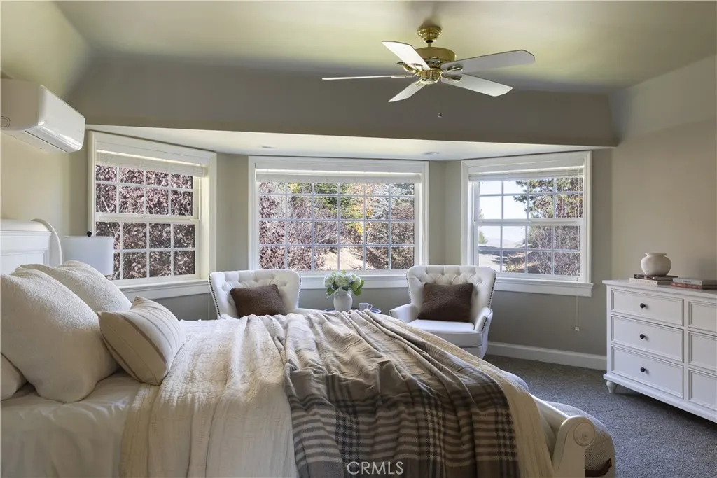 Surrounded by vibrant fall foliage in Lake Arrowheads private Oakridge Estates, this spacious mountain retreat blends warmth, comfort, and effortless year round living. Highlights include level entry, a four car garage, and incredible privacy on a half acre corner lot. Inside, thoughtful design and classic details create a welcoming feeling from the moment you step in. Large windows frame the trees and distant ridgelines, rich wood floors add warmth and the main living room centers around a timeless fireplace. The kitchen, dining, and family rooms flow together seamlessly, making everyday living feel easy and connected. A dedicated home office on the main level is ideal for remote work or quiet focus. Upstairs, four generous bedrooms offer plenty of space to unwind, while the lower level is designed for entertaining, complete with a billiards, brew, and wine lounge perfect for hosting friends and family. Outside, the deck sits above the treetops with filtered mountain views and a remote controlled pergola that makes it comfortable in every season. Oakridge Estates is a peaceful community with no short term rentals, plowed and maintained roads, and private lake rights. Just minutes to the country club, the lake, and some of the best hiking trails in Lake Arrowhead. A warm, welcoming retreat for all seasons and especially magical in the fall.