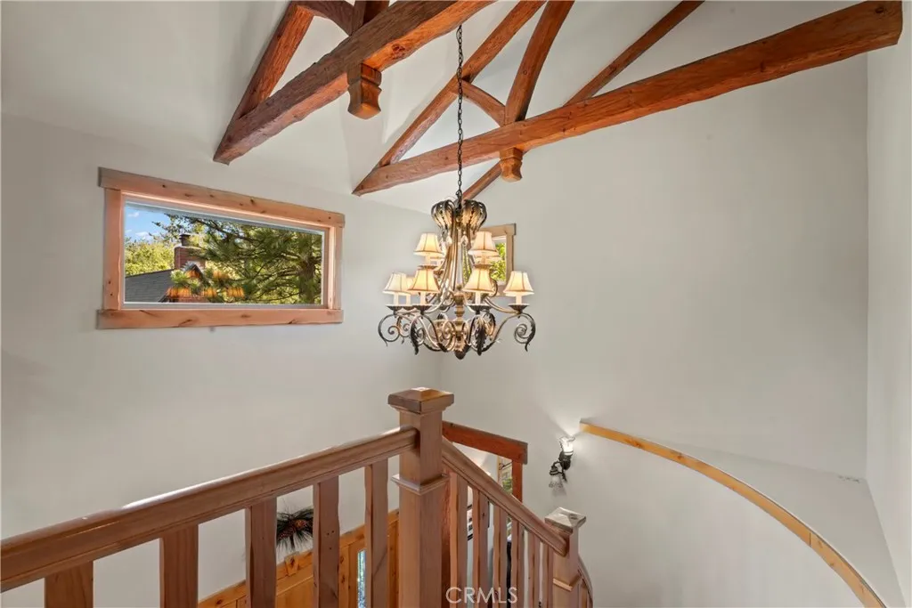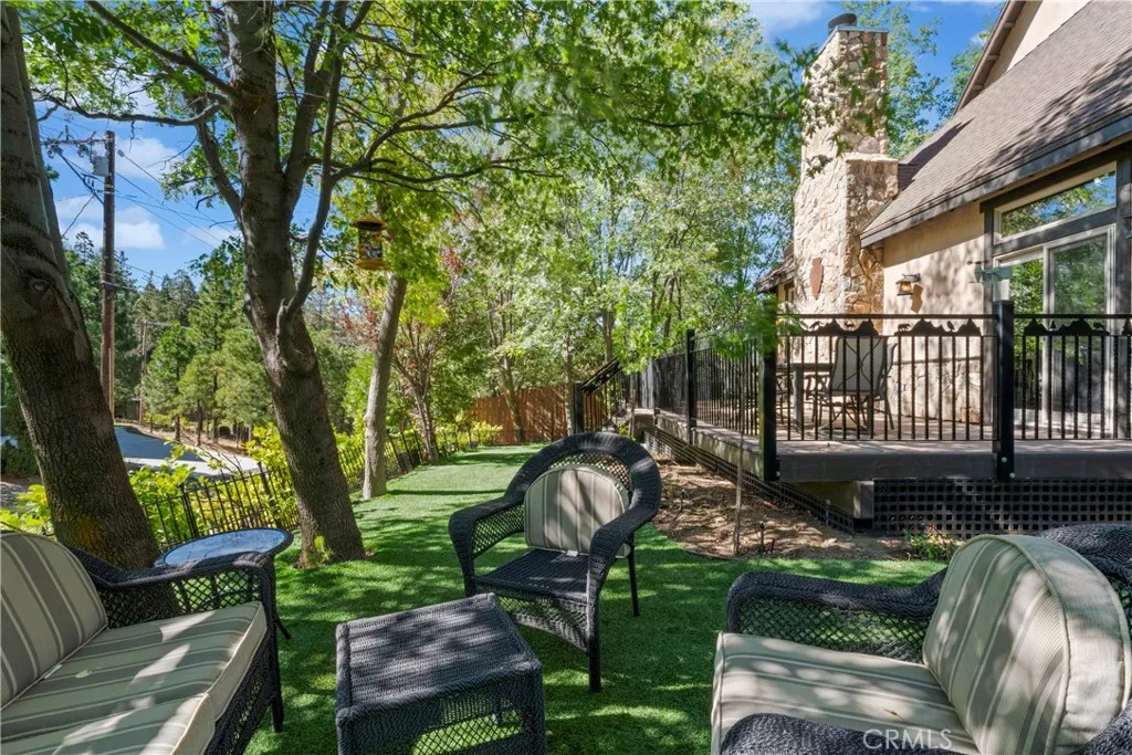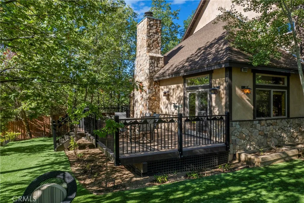 Full lake rights to private Lake Arrowhead, 1034 Teakwood is a impressive, quintessential mountain lodge one dreams of for hosting family holidays in Lake Arrowhead! Custom built for the original owner in 2005, the builder maximized every bit of space within this spacious LEVEL corner parcel. No detail was overlooked utilizing high quality finish work carpenters and high quality lighting fixtures/hardware throughout. Driving into the property you will appreciate hand chiseled split faced granite retaining walls and planters. Level parking galore with ample space for a BOAT AND RV PARKING next to the oversized/extra deep 3 car garage! Theres also a shed to house the snow blower and tools. Reside in a low maintenance house through plaster siding, Trex decking and custom metal decking handrails. Maximum comfort provided by central forced heat and A/C plus Sellers recently installed a 24KW Generac whole house natural gas generator! The perfect property for kiddos and pups frolic within the fenced yard with artificial turf. A grand front door entrance greets you with a dramatic foyer boasting hand carved beams, banister, and rustic door/window casings. Solid wood flooring blankets the entire main living level. A spacious bedroom and full bathroom conveniently located on the entry floor! The kitchen is tastefully designed with knotty pine cabinetry, stainless appliances, double oven, custom mountain theme tiled backsplash, coffee bar, center island, and breakfast bar top. Relax fireside in the vaulted ceiling living room which leads directly onto the oversized entertaining deck(T