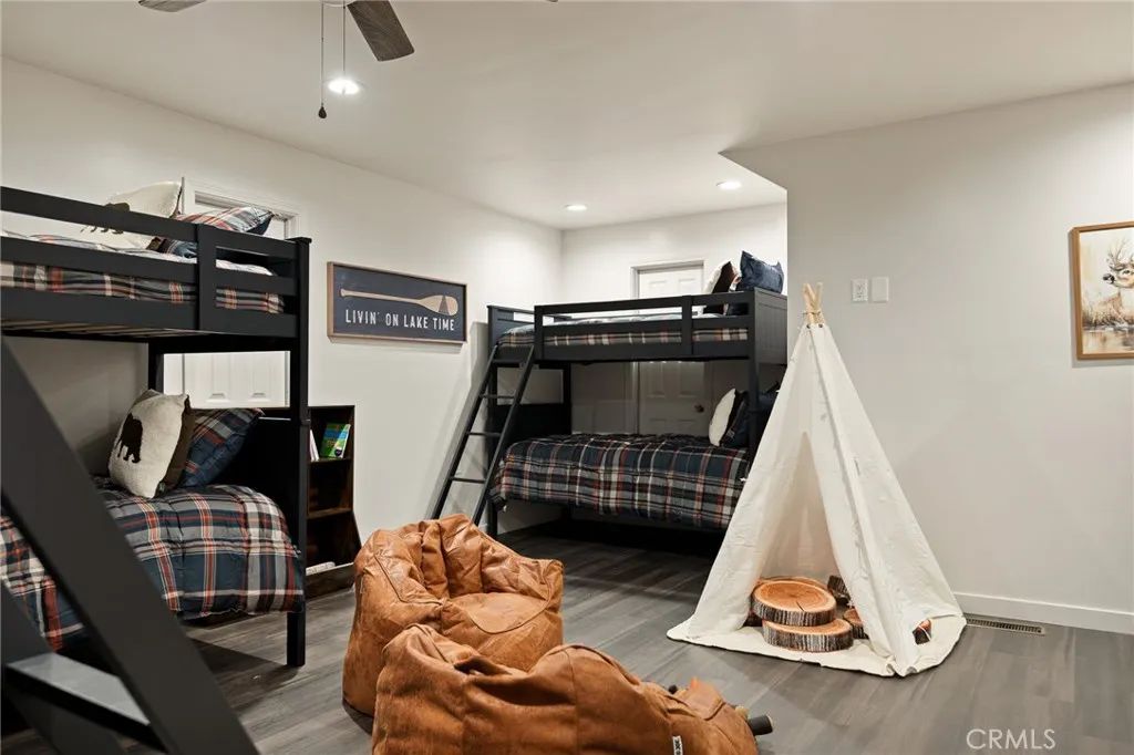 Welcome to your storybook escape among the pines a luxurious yet whimsical retreat designed for those who love mountain living with a modern twist. Tucked behind private gates on nearly two acres of forested serenity, this 4-bedroom, 5-bath custom home blends warmth, sophistication, and natures beauty in perfect harmony. Step inside to soaring vaulted ceilings with rustic beams, wide-plank flooring, and a dramatic stone fireplace anchoring the great room a space made for cozy evenings and framed by panoramic windows overlooking the treetops. The open-concept floor plan flows effortlessly into an entertainers kitchen featuring a grand quartz island, herringbone backsplash, custom cabinetry, and high-end stainless steel appliances including a 6-burner range and wall oven. The dining area captures beautiful natural light and forest views, creating the perfect setting for family gatherings or dinner parties. The main level offers three spacious bedrooms, including a primary suite retreat with deck access, tranquil forest outlooks, and a spa-inspired en suite featuring a soaking tub, dual vanities, and walk-in shower. Downstairs, discover the ultimate entertainers level a giant game room with a custom bar area, TV lounge, and game space, all opening to a massive deck overlooking the forest canopy. The room is pre-wired for two TVs and offers plenty of space to create an additional sleeping area if desired. A full bathroom with shower and a temperature-controlled wine cellar room complete this level, making it perfect for gatherings and overnight guests. The newly added bunk r