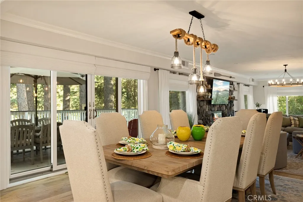 Where Mountain Magic Meets Modern Luxury Welcome to an enchanting retreat tucked within the prestigious Lake Arrowhead Country Club, gracefully perched on the signature 16th tee box. Here, luxury living is kissed by the whisper of towering pines, the sparkle of mountain air, and the timeless allure of Lake Arrowheadwhere your lake rights invite you to endless days of adventure on shimmering waters. Originally reimagined in 2021 and remodeled again in 2025, this residence has been elevated with a collection of exquisite upgrades. Inside, new wood flooring flows throughout the home, while the master suite was transformed with plush new carpet, an enlarged walk-in closet, and a fully remodeled bedroom retreat. The kitchen shines with custom-painted cabinets, custom wainscoting, a gleaming new quartzite island countertop, and dazzling designer chandeliers in both the living and dining rooms. Fresh interior and exterior paint, along with striking new iron-and-glass entry doors, lend the home a crisp and refined elegance. In the living room and master suite, newly crafted stone fireplaces create warm, inviting focal points, and a whole-home water filtration system enhances everyday living with mountain-pure freshness. The main level embraces open-concept living, seamlessly blending living and entertaining spaces. At its heart is a chefs dream kitchen featuring GE Caf appliances and a magnificent Italian ILVE six-burner range. Three distinct gathering areasincluding the celebrated Presidential Billiards Room and Cocktail Loungeoffer versatile settings for everything from cozy fire