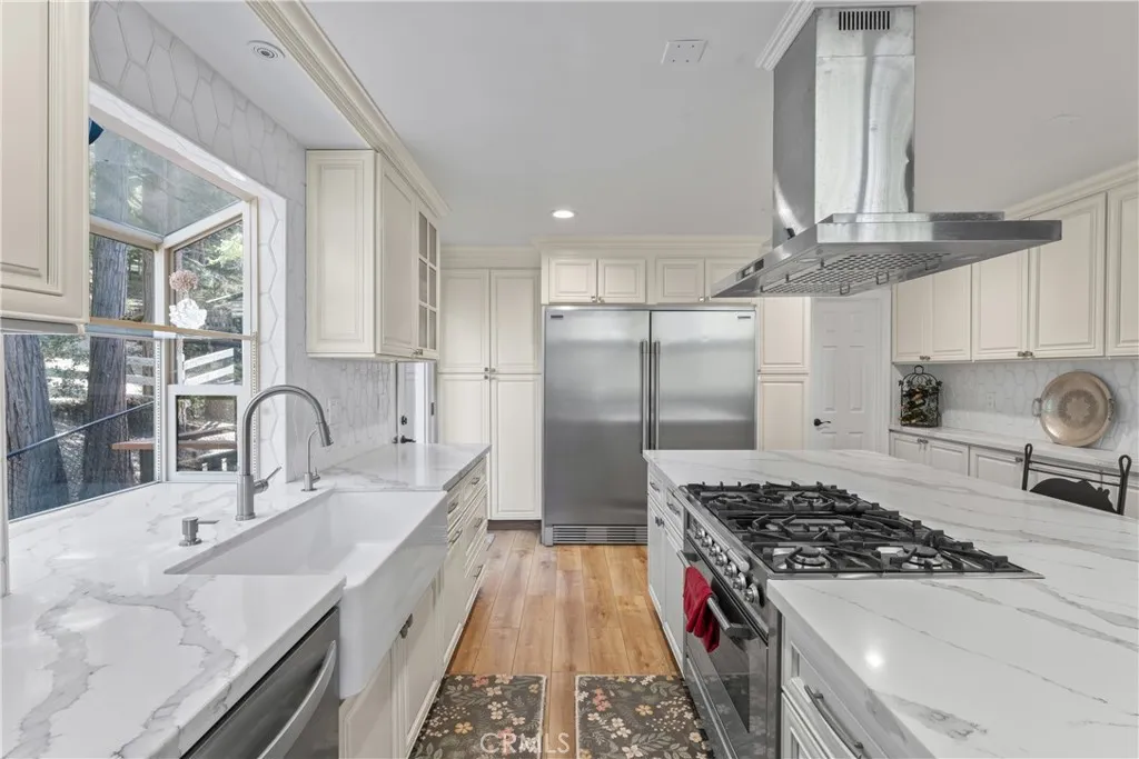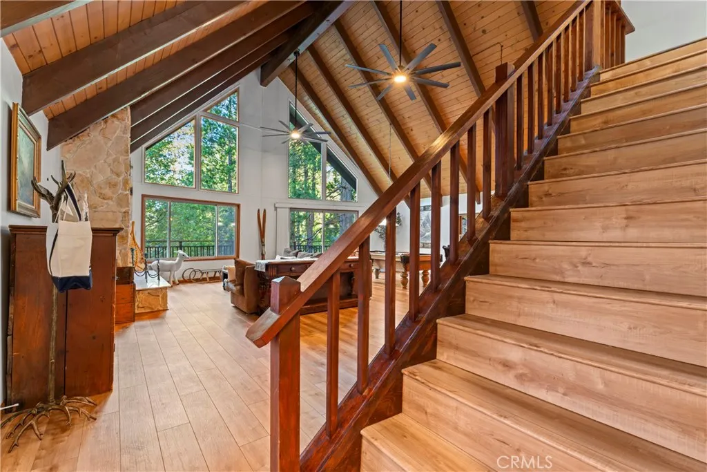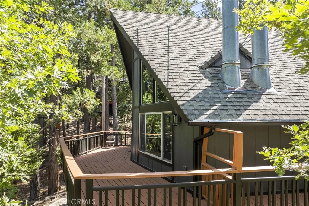 Phenomenal Prow Style home located directly across from the forest and trails, with easy access to the golf course just down the street. This property also includes Lake Rights, allowing full use of beautiful Lake Arrowhead. Over $300,000 in upgrades, including a recently remodeled kitchen with high-end professional-style appliances, slab quartz countertops, and a garden bay window overlooking mature evergreens and oaks on your own land. The home features 4 bedrooms, 3 bathrooms, an office, and a den/family room with a second fireplaceideal for gatherings or quiet relaxation. The main-level Great Room highlights natural wood open-beamed ceilings and a classic retro rock fireplace that adds warmth and character. Additional updates include remodeled bathrooms, new interior and exterior paint, newer lower patio/deck, fenced yard, upgraded flooring, newer forced air system, "Leaf Guard Style" rain gutters and system improvements. Both the new Flagship whole house water filtration system and an additional Reverse Osmosis system at the sink ensure the best of the best for your water supply. Both guys and gals can relax in the "She-Shed" while the guys have their own storage shed, too. Located in a peaceful, forested setting with nearby recreation and golf access, this home offers both comfort and convenience in one of Lake Arrowheads most desirable areas.