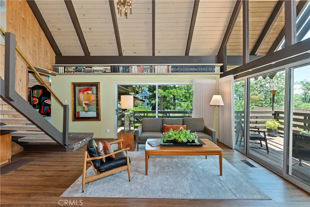 If an oversized Mid Century A-frame is your vibe, take a look at this original, in impeccable condition. An architect-engineer designed and built this for his family!! The artistic detail throughout is timeless. Main level den/study with fireplace could be a 4th bedroom. 2-access points each ending at a double covered parking area. Level entry from an access road or great year-round access from the county maintained road. Sitting on 36,000+ sq. ft. among towering cedars and pine trees-the front decks overlook the grounds and offer peace and seclusion. Two-story wall of glass brings natural light into main level living areas. Kitchen has 2 ovens, center 5 burner cooktop. And wait till you see the oversized walk-in pantry with plenty of room for everything. Lots of shelves will accommodate a huge collection of cookbooks or display your fave kitchen items. Built for an era of entertaining, large collections of dishes, glasses and fancy cook-ware are all stored neatly at hand. Intimate formal dining surrounded by leaded glass...the only thing in sight....trees, trees and more trees. Loft office overlooks living area. 2 additional bedrooms on second level. Natural light floods the hallway and creates a nice area to showcase a set of floor to ceiling display cases. Upper level is the private primary bedroom with an en suite bath. Did we mention views.... you can see the ski slopes of Snow Valley and panoramic mountain ridge line views. Bathrooms are in pristine condition featuring the fun colors of a mid century year. Spa room with skylights and heat lamps. Additional craft/play