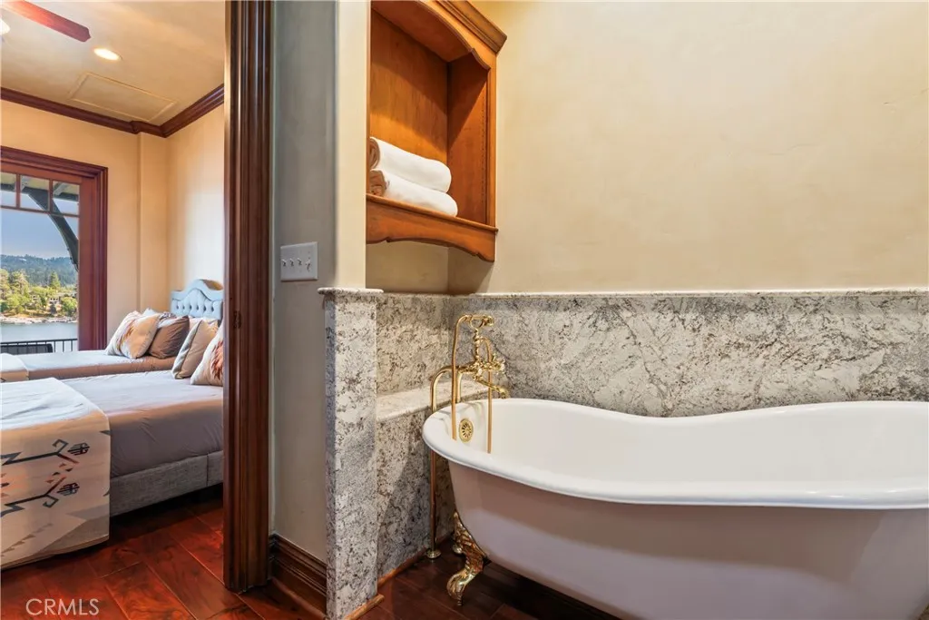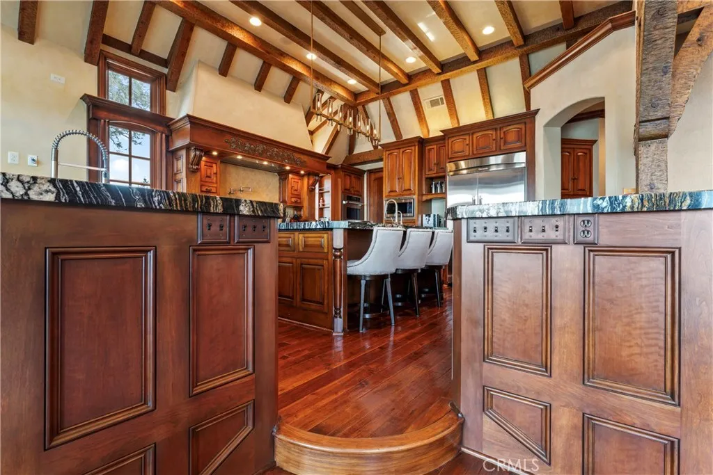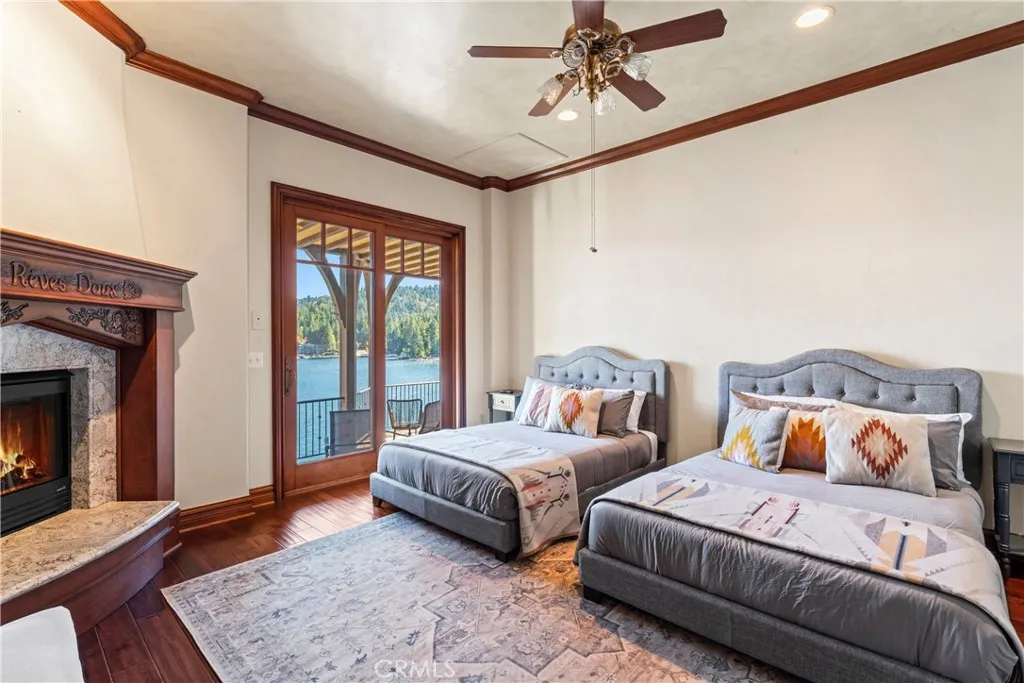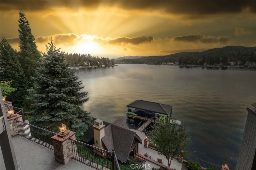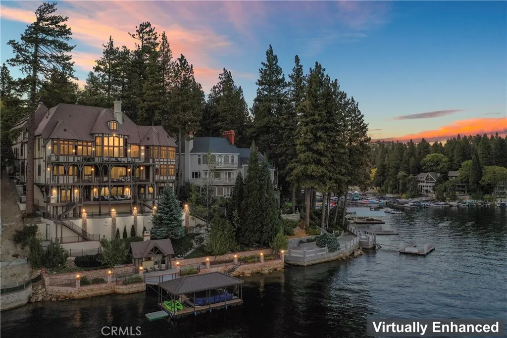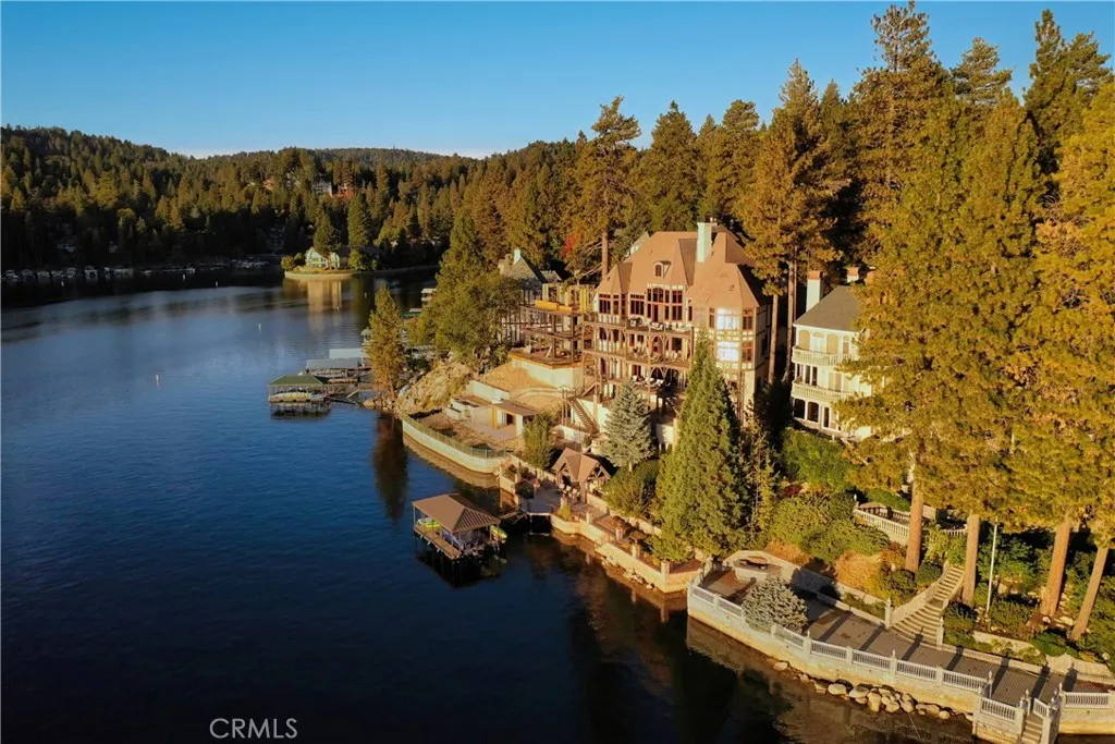 La Crme de la Crme! Beautiful Lakefront Lodge Chateau In the Exclusive Gated Community of Rainbow Point, Lake Arrowhead, CA This luxurious, finely crafted, and superbly accentuated crown jewel estate is majestically perched on Rainbow Points most exclusive and desirable lakefront parcels. Enjoy massive shimmering lake and ridgeline views from virtually every room! The home features countless custom amenities such as 8 masterful fireplaces, dual kitchens accented with top-of-the-line appliances, and magnificent tile, quartz, and stone work throughout. There are 7 spacious en suite bedrooms, all with water views as well as 2 bunk room and/or media room. One of the most impressive rooms is the soaring and grand great room with irreplaceable, hand crafted and masterful architecture that sets the wide open waterfront stage with it''s 3 story hand hewn distressed trusses, floor to ceiling windows and fireplaces, custom brass fixtures, with modern and timeless curation, Positively 5 star living amenities! At mid level there is a finely appointed gentlemans lounge with fully self contained bar and wine rooms, adjacent is well appointed billiard and game rooms. On the lower level at lake's edge is a second fully self contained kitchen, bar, den, fireplaces, multiple and intimate living spaces are flexible for personal, extended, and even corporate living. And a full house elevator provides ease of access throughout! Step out onto sweeping decks and patios and meander down to rose and native gardens and a water stream with an enchanting path which extends down to a private covered do