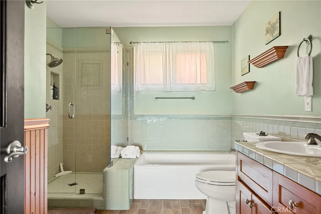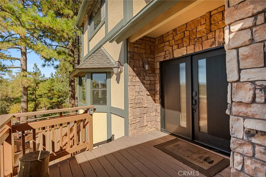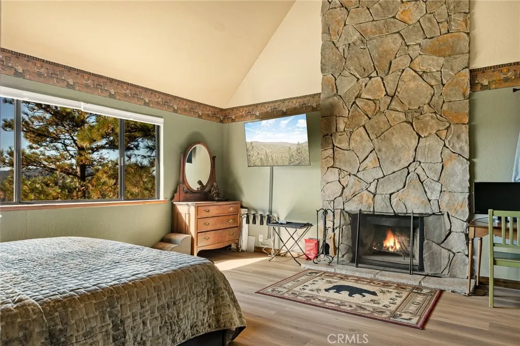 Remodeled Lake Arrowhead home with lake rights and a two-car garage. Lake and mountain views appear from multiple rooms, and the usable backyard extends the living space outdoors. Inside, the main level brings everyone together: an updated, open kitchen with solid-surface counters, refreshed lighting, and generous cabinetry flows to the dining area, where sliders open to a covered patio for year-round use. The living room centers on a classic brick fireplace, complemented by a bay-window bench that frames the view. The versatile layout offers four bedrooms plus a loft and an adjoining bonus room currently used as a fifth bedroom. The primary suite stands out with vaulted ceilings, a floor-to-ceiling stone fireplace, a spacious walk-in closet, and lake views. On the lower level, a large recreation room features wood-beamed ceilings, space for a pool table, a wet bar, and another fireplacewell-suited for gatherings or game nights. Outdoors, a terraced, low-maintenance yard pairs with a covered patio for easy indoor-outdoor flow. Located in Arrowhead Woods with lake rights, the property sits near trails, the Village, and marina amenities. Move-in ready and thoughtfully updated, it blends mountain character with modern conveniences.