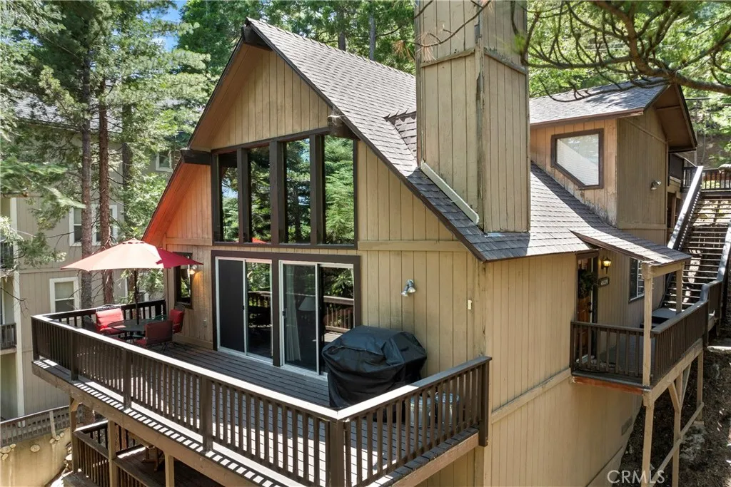 Lake Views from two decks in a Classic Mountain Cabin A-Frame with Lake Rights. Open the front door to where an open floor plan awaits. An expansive two-story Cathedral ceiling roofline opens out to a large deck the full length of the home. Design includes a corner Lava rock fireplace, extra wide sliders, large bank of windows that anchor the living and dining room, extra wide tongue & groove plank paneling combined with great views of Lake Arrowhead and the Lake Arrowhead Village. The kitchen and island/bar are accented in rich, rust brown granite, stainless steel appliances and oversized slate tile flooring throughout. A coveted large bedroom with a huge, full bath is on the first level. Two large bedrooms are located up a floating staircase in a Jack & Jill configuration with a three-quarter bath. Upper level facing Old Toll has tons of windows with dappling sunlight on one side of the home while the other side opens out onto a mezzanine landing that faces the forest view; cozying up the space. One of the bedrooms has an ample sitting area with a great view out a mid-Century triangle shaped window of mountainscapes beyond. The bottom level bonus room/den is appointed with a second corner fireplace, wet bar with sink, island/bar, and enclosed laundry. A second huge deck also has a lake view. A tankless water heater is in finished buildup area with tons of extra storage the whole length of the house. The house has a large two car parking deck, new COPP roof /warranty and alarm system. Additionally, Trex decking under parking platform for firewood and more storage.