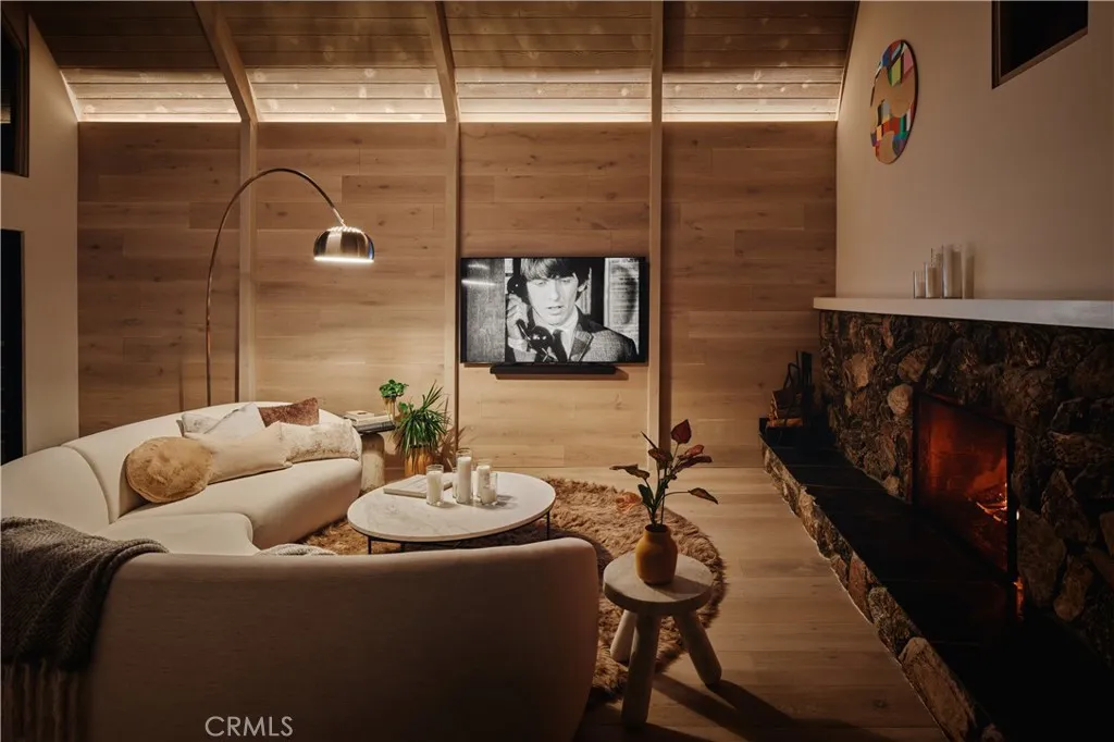 Perched in the pines of Lake Arrowhead, this striking architectural retreat reimagines a classic 1960s cabin into a sophisticated, modern mountain escape. Designed by Dan Brunn Architecture, a renowned firm known for thoughtful residential work, the home is defined by its rare double A-frame form, blending iconic character with a refined, minimalist palette inspired by Scandinavian and Japanese influences. Original wood elements were preserved and revived through walnut blasting, bringing warmth and authenticity to the contemporary upgrades throughout. Spanning three levels, the layout offers restful privacy on the lower floor with the primary suite, vibrant gathering spaces and a guest suite on the main level, and a dramatic loft retreat above. The central living room is anchored by a tumbled-boulder fireplace and framed by tall glass that captures sweeping forest views. A custom terrazzo countertop, navy Fenix cabinetry, and curated lighting elevate the kitchen and dining space into a true showpiece, while mid-century influences and soft textures add depth and comfort. Outdoor living takes full advantage of the setting, relax on the deck overlooking the trees or soak in the jacuzzi and breathe in the crisp mountain air. Just beyond the backyard, a forest trail leads directly to the UCLA Conference Center and Tavern Bay Beach Club, only a short walk or easy golf-cart ride away, placing you in one of Lake Arrowheads most desirable locations. Sustainability guided the transformation, preserving the original structure while enhancing comfort and style. Perfect as a high-end i