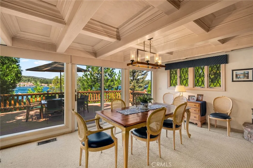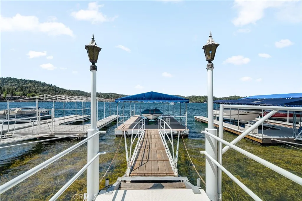 LAKEFRONT, lake view homes in Lake Arrowhead - One of a kind. Located in the palisades neighborhood, walk straight into this level entry 5 bedroom, 5 Bath custom home and get blown away by the lake views and overall orientation to lakefront living. The family area and primary suite features custom coffered ceilings, and expansive west facing views (exceptional at sunset). The home is immaculate, the exterior has a NEW roof, NEW exterior paint and the detail to the construction of the brand NEW deck is impressive. This home shows an extreme pride of ownership with every detail. The access to the dock couldn't be more perfect, nice easy path and takes you to your private lakeside patio with Single Slip Dock. The Dock amenities include, a hydro hoist under a nautical canopy, a large concrete patio for entertainment, side tie for guest and additional rear tie up, currently used for a Boston Whaler for easy convenient transportation to Restaurants, Bars, Loan Pine Island, Marina, and other Lake features. The Dock and Patio also include, a Dock House for all your sporting goods, exterior furnishings, and service area with refrigeration for beautiful afternoon entertainment for the entire family. This property is ready to enjoy. This property is viewed by appointment only. Dock Number : S333