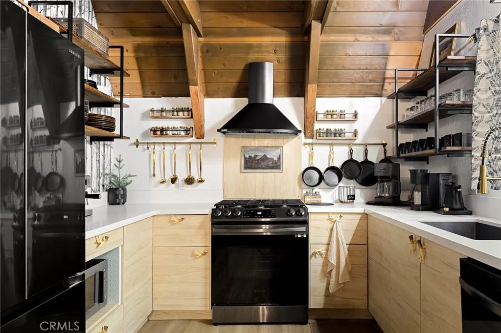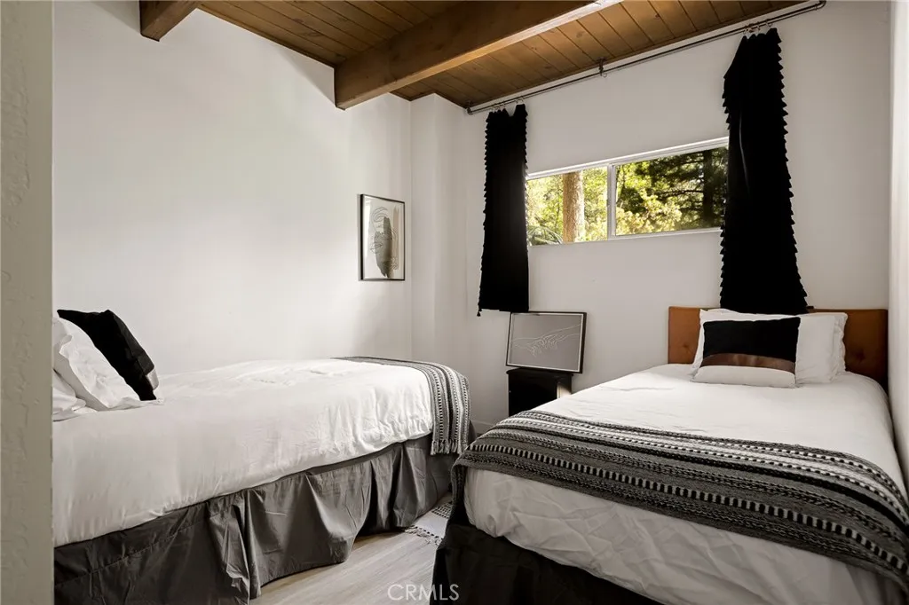 Tucked beneath the pines in beautiful Lake Arrowhead, this vintage 1970s A-frame cabin blends classic mountain character with tasteful updates. The exterior features the striking silhouette of a flat-faced prow, with its bold roofline, redwood fencing, and strong architectural lines that give this home standout presence. Inside, youll find soaring wood-beam ceilings and sunlight streaming through large triangular windows signature elements of the coveted prow-style design. A classic stone fireplace adds charm to the living area and connects naturally to the open dining space and thoughtfully updated kitchen, which includes open shelving and warm wood accents. Upstairs, a spacious loft-style game room offers flexibility for additional living space or recreation. The bathrooms have been beautifully updated with clean lines and modern finishes, thoughtfully designed to complement the homes rustic touches. And just when you think it couldn't get better, the property also features a seasonal creek that adds to its serene charm, along with central AC to keep things cool and comfortable year round. The outdoor deck provides space to enjoy the peaceful wooded surroundings, with mature trees and fresh mountain air creating a calming natural backdrop. This property also includes Lake Rights, giving owners access to Lake Arrowheads private amenities, including beaches, trails, and lake activities. Additional highlights include level-entry access a rare and sought-after feature in the area as well as a history of strong short-term rental performance. This well-maintained property offer