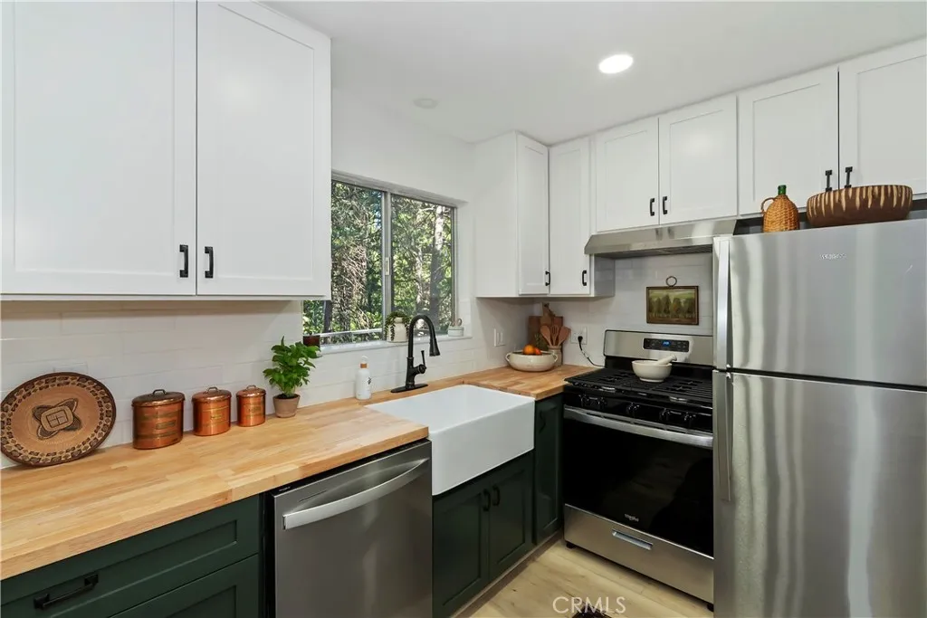 Welcome to a beautifully remodeled mountain retreat nestled in Lake Arrowhead's desirable Cottage Grove neighborhood and walking distance to the lake/village. This charming 3-bedroom, 2-bathroom home offers full Lake Rights. Step inside to find a warm, inviting interior featuring a cozy living room with fireplace, an upgraded open-concept kitchen with butcher block countertops plus farmhouse sink, and a spacious main-level primary suite with beautifully updated bathroom. Upstairs are two bright guest bedrooms with forest views, while the lower level offers a versatile bonus room perfect for entertainment or additional sleeping quarters. Enjoy serene mornings and evenings on two oversized decks surrounded by mature trees, ideal for relaxing or entertaining. Located just minutes from Lake Arrowhead Village, shops, and restaurants, and within the Arrowhead Woods community, this property offers both privacy and convenience. Whether you're looking for a full-time residence, vacation home, or investment opportunity, this home delivers timeless mountain charm with modern comfort in one of Southern Californias most sought-after lake communities.