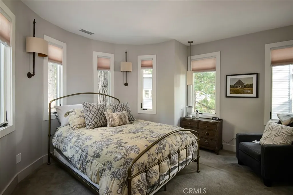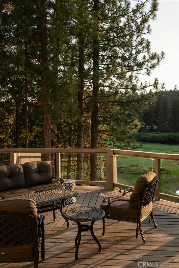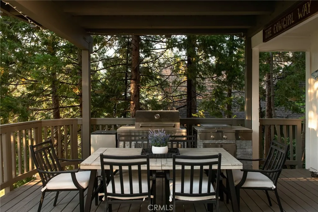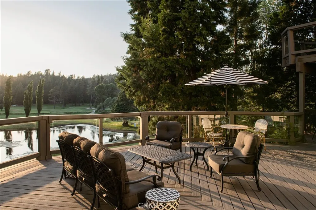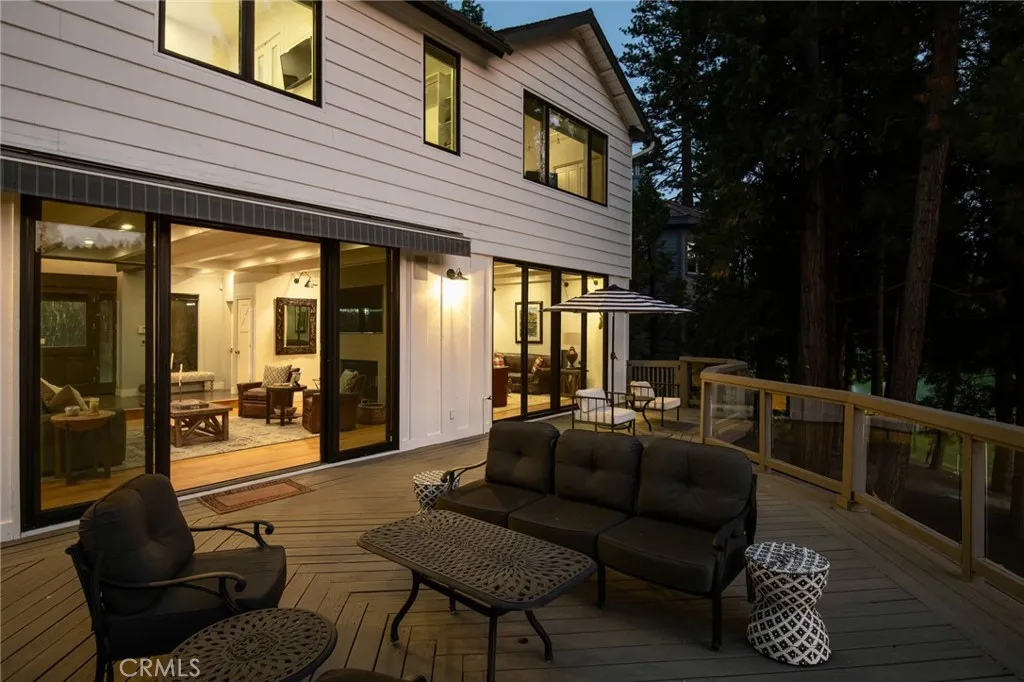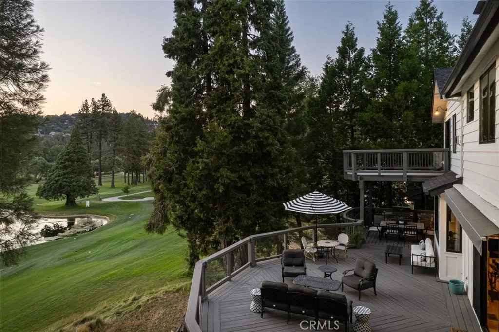 Perfectly situated on the 1st hole of Lake Arrowhead Country Club, this fully reimagined estate was taken down to the studs and expanded by 1,000 sq. ft. in 2018. The result is a rare blend of modern sophistication and timeless mountain elegance. Designed for seamless indoor-outdoor living, 9-foot Fleetwood sliders lead to an expansive deck showcasing panoramic views of the lake, golf course, and surrounding mountains. Inside, the chefs kitchen is both stunning and functional, featuring Thermador appliances, quartzite and leathered granite counters, dual farmhouse sinks, pot filler, instant hot water dispenser, warming oven, dishwasher, and beverage fridge. A custom wet bar with wine fridge enhances the homes effortless entertaining appeal. The living and family rooms each offer surround-sound systems and 65 TVs for the ultimate media experience. Retreat to the luxurious primary suite, complete with a fireplace, private deck, spa-inspired en suite with heated floors, free-standing soaking tub, Toto self-flushing toilet, and generous walk-in closet. Two guest rooms are joined by a Jack & Jill bath with heated tile floors, skylight, and walk-in shower. A private suite with a turret bedroom and a flexible bonus room with its own exterior entrance offer versatilityboth capturing some of the best lake and golf course views in the home. High-end upgrades include a 16K whole-house generator, systematic humidifier, premium insulation, two new 5-ton furnaces with A/C, dual 75-gallon water heaters with recirculating pump, Marvin energy-efficient windows, motorized blinds, LED dimmabl