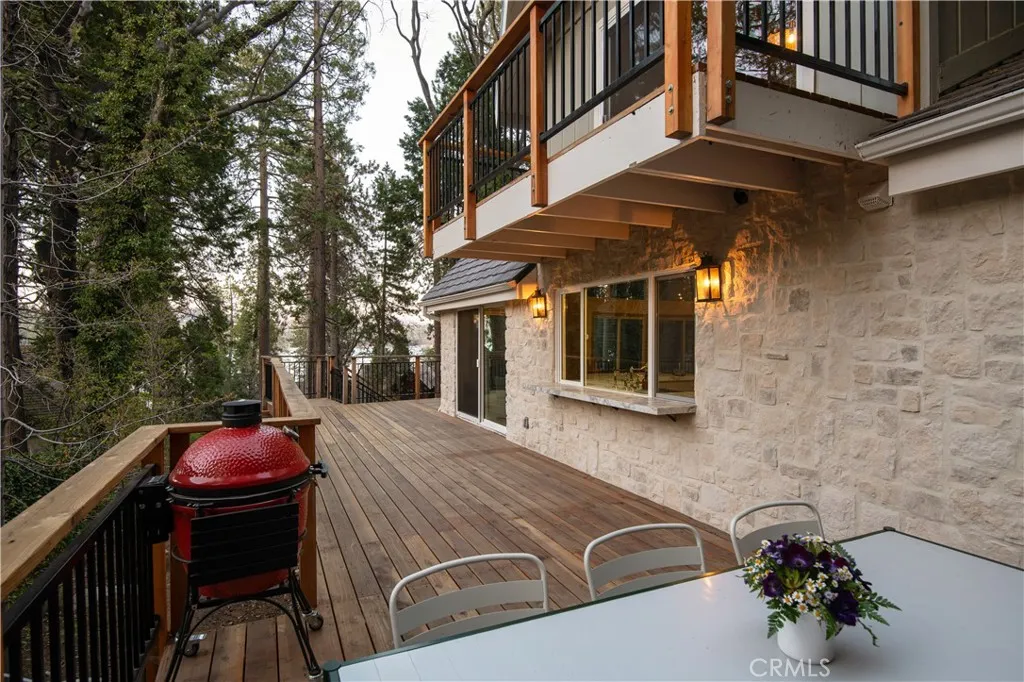 The SkyStone LakeHouse. Welcome to luxurious lake living in the exclusive, guard-gated community of Point HamiltairLake Arrowheads most prestigious and sought-after enclave. Known for its 24/7 security, concierge services for home upkeep, and a long-standing legacy of celebrity and socialite residents, this community offers the ultimate in comfort, privacy, and prestige. Located directly across from a $12 million estate and just a short stroll or golf cart ride to your private boat slip, this exquisitely remodeled lakeview home blends timeless mountain charm with top-tier modern upgradesoffering a true turnkey lifestyle. From the moment you arrive, youre greeted by breathtaking lake and tree views framed by soaring high-beam A-frame ceilings and an iconic wall of windows. Natural light pours into the open-concept living space, where wide plank European white oak floors and a floor-to-ceiling stone fireplace create the perfect balance of warmth and sophistication. The spacious living area is ideal for entertaining, with abundant seating to relax and soak in the views. The gourmet kitchen is a designers dream, featuring marble countertops, custom cabinetry, a show-stopping Ilve Italian range, European fixtures, and a convenient pass-through shelf that connects directly to the expansive outdoor dining area. Step outside to your wrap-around deck, thoughtfully designed with multiple lounge and dining zones, a built-in BBQ area, and serene spaces to enjoy al fresco meals beneath the stars. The main-level primary suite is a tranquil retreat with a walk-in closet and spa-inspired e