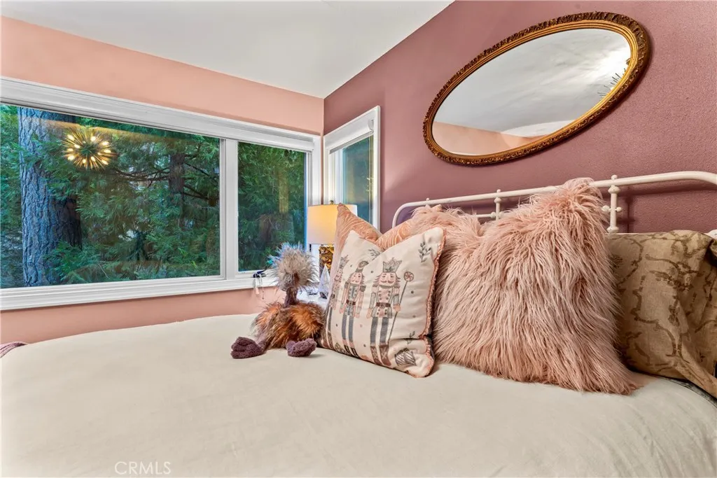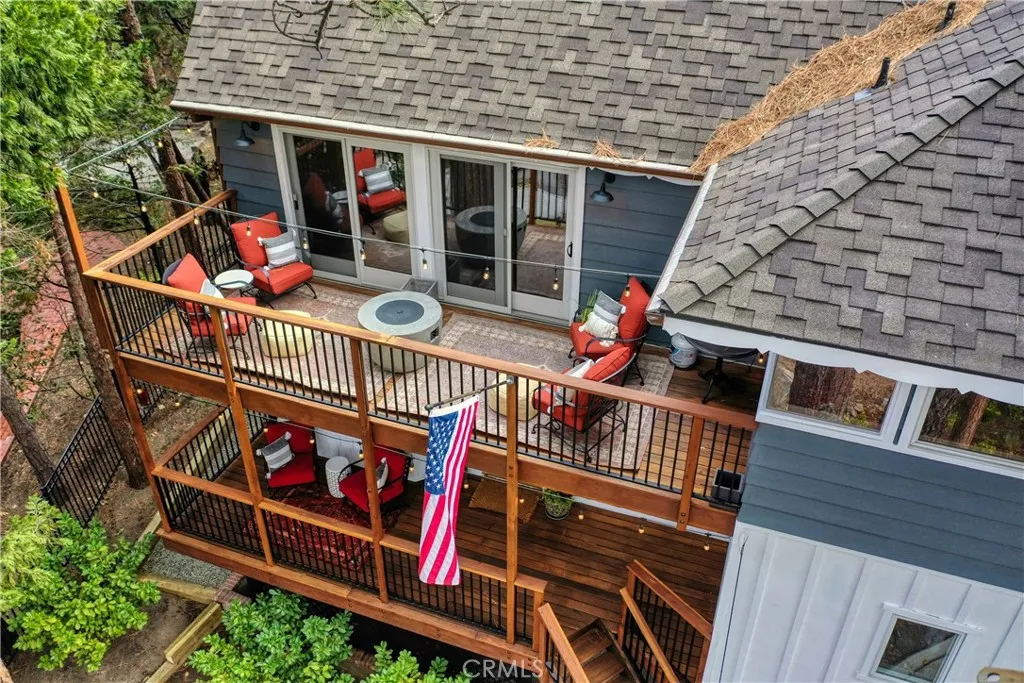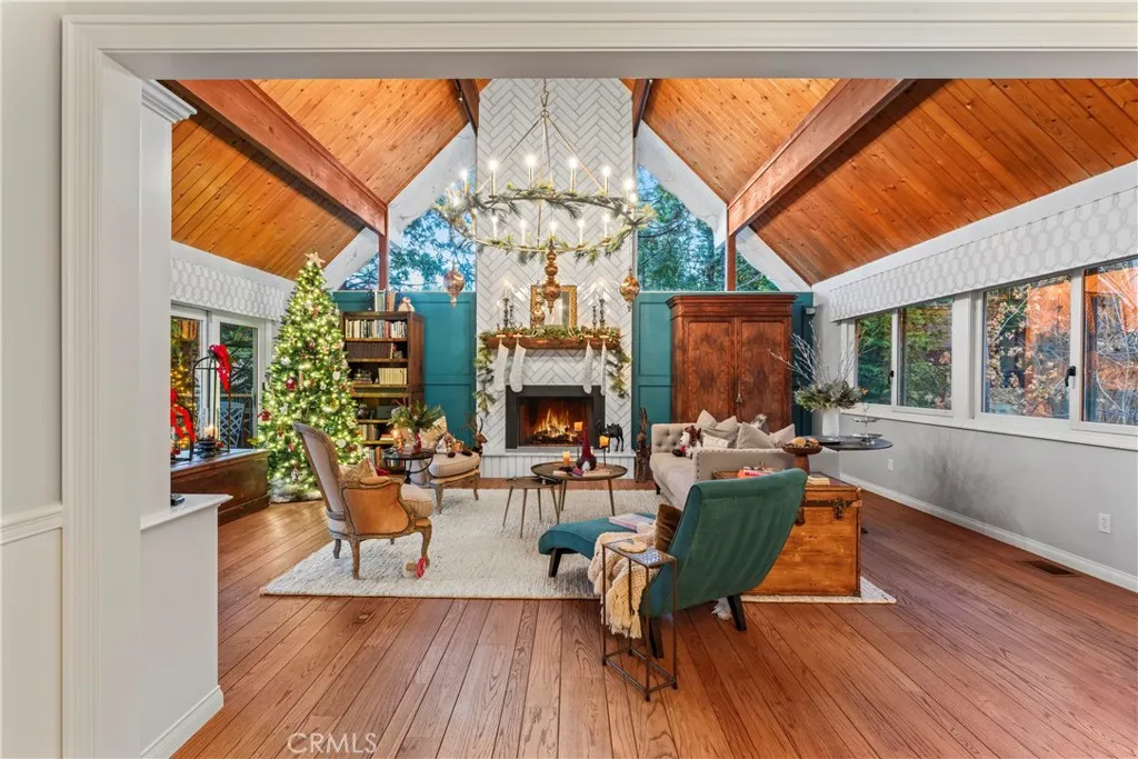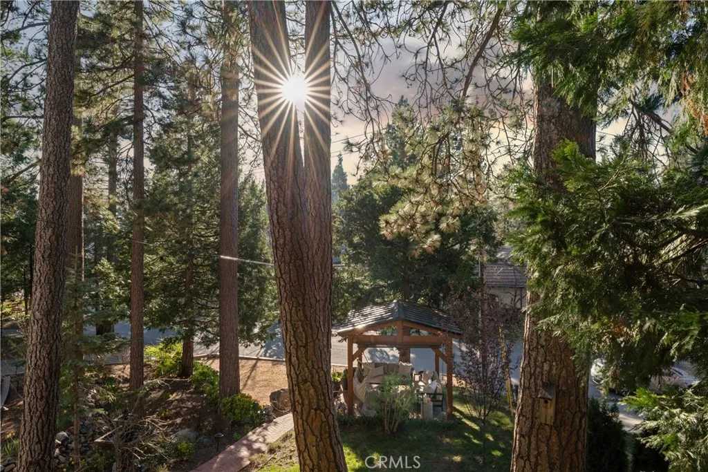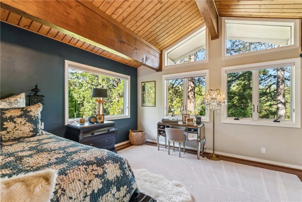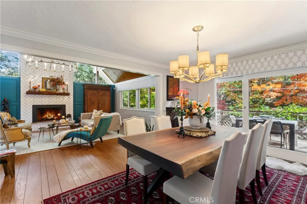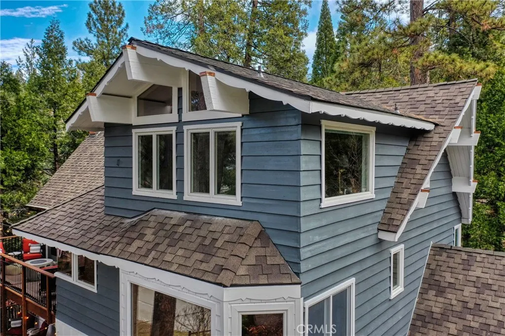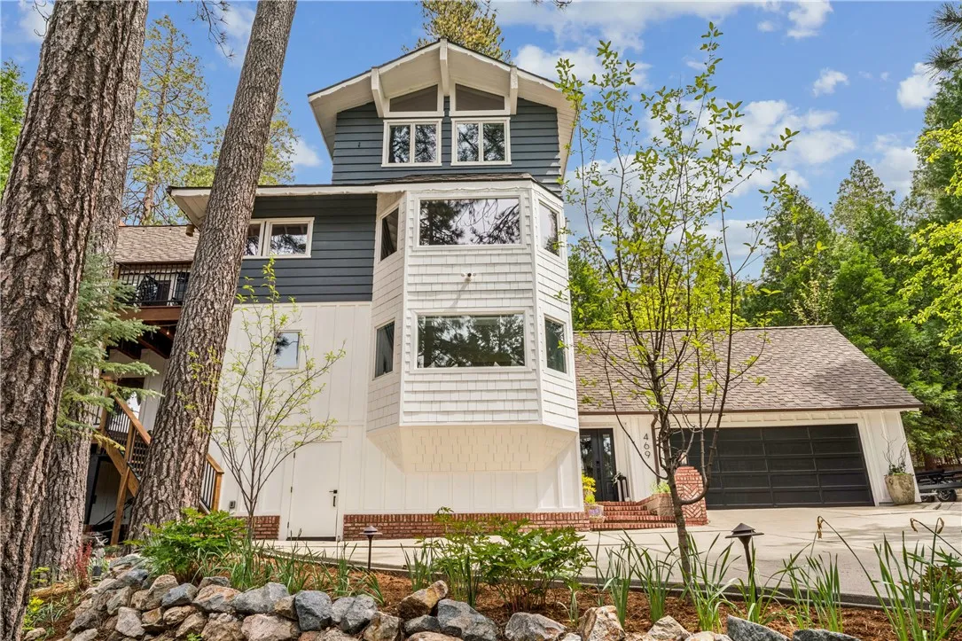 Welcome to this stunning Lake Arrowhead dream home, where timeless mountain charm meets thoughtfully curated, top-to-bottom upgradescomplete with lake rights. The main living area features vaulted wood-beamed ceilings and a beautifully redesigned fireplace with a floor-to-ceiling herringbone finish, creating a striking focal point among walls of windows. The gourmet kitchen offers expansive workspace and KitchenAid appliances, while the eat-in nook feels like dining in a treehouse and the formal dining area ties the space together. The home flows seamlessly to multiple outdoor decks, ideal for indoor-outdoor living and entertaining, whether hosting gatherings or enjoying quiet mornings in nature. A bedroom with walk-in closet and full bath completes the main level, offering both comfort and functionality. The upper level is dedicated to a private primary retreat with a spa-inspired bathroom and its own office or lounge. The lower level is ideal for guests or multi-generational living, featuring a second primary suite, additional bedroom and bath, & a spacious living area with fireplace, wet bar, covered deck, and private patio. Extensively remodeled and meticulously maintained, this home showcases quality throughout. Built with rare 2x6 construction and copper-capped beams, it is designed for durability and long-term performance. Notable upgrades include a grand mudroom, Anderson windows and doors, solid brass Baldwin Estate hardware, Restoration Hardware lighting, solid oak flooring, custom window coverings, updated insulation, cedar and concrete board siding, copper plumb