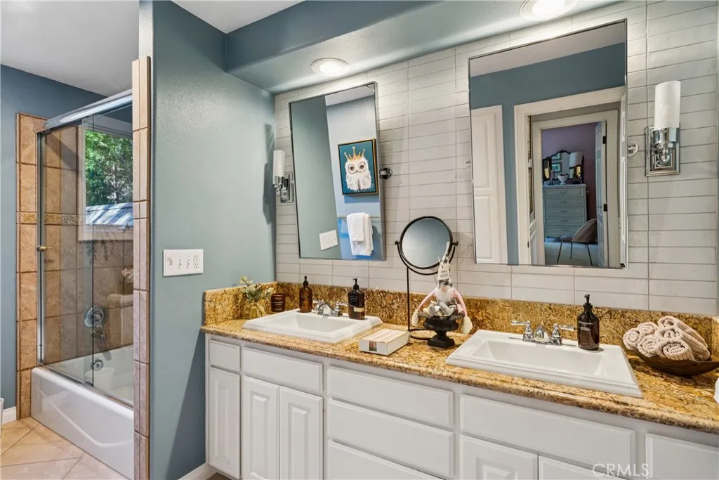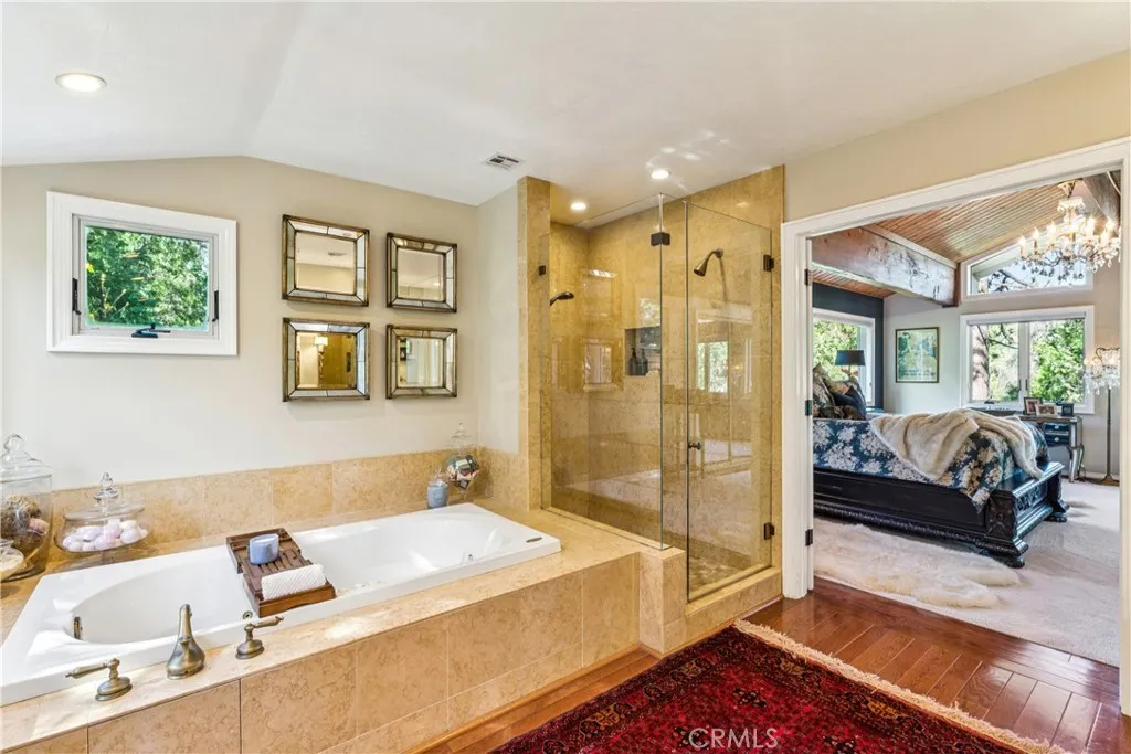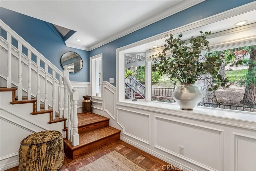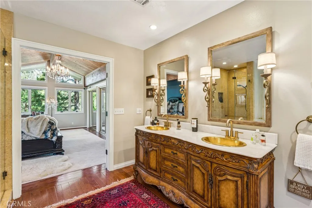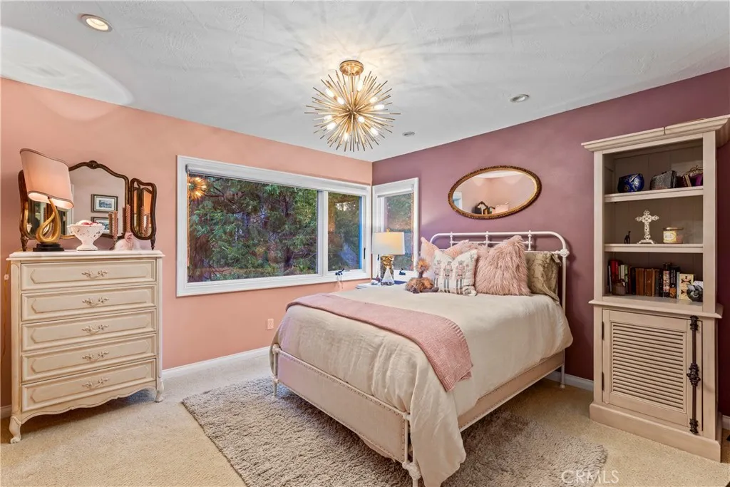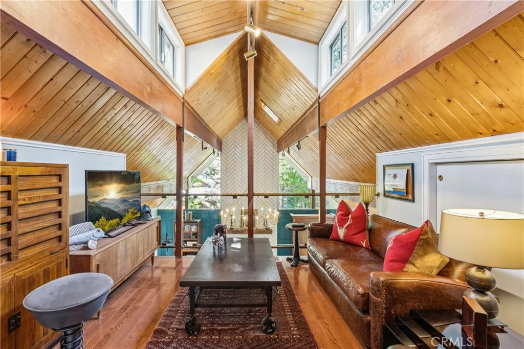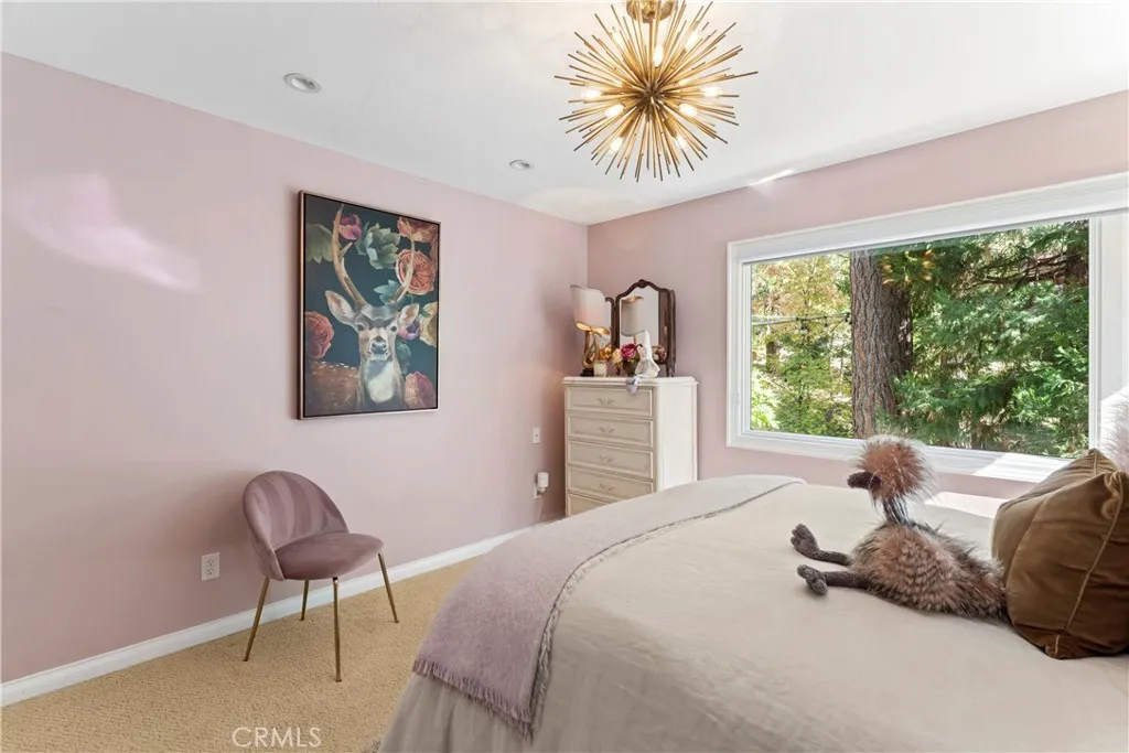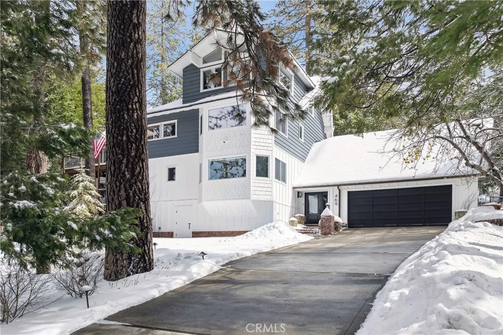 Welcome to this stunning Lake Arrowhead dream home, where timeless mountain charm meets thoughtfully curated, top-to-bottom upgradescomplete with lake rights. The main living area features vaulted wood-beamed ceilings and a beautifully redesigned fireplace with a floor-to-ceiling herringbone finish, creating a striking focal point among walls of windows. The gourmet kitchen offers expansive workspace and KitchenAid appliances, while the eat-in nook feels like dining in a treehouse and the formal dining area ties the space together. The home flows seamlessly to multiple outdoor decks, ideal for indoor-outdoor living and entertaining, whether hosting gatherings or enjoying quiet mornings in nature. A bedroom with walk-in closet and full bath completes the main level, offering both comfort and functionality. The upper level is dedicated to a private primary retreat with a spa-inspired bathroom and its own office or lounge. The lower level is ideal for guests or multi-generational living, featuring a second primary suite, additional bedroom and bath, & a spacious living area with fireplace, wet bar, covered deck, and private patio. Extensively remodeled and meticulously maintained, this home showcases quality throughout. Built with rare 2x6 construction and copper-capped beams, it is designed for durability and long-term performance. Notable upgrades include a grand mudroom, Anderson windows and doors, solid brass Baldwin Estate hardware, Restoration Hardware lighting, solid oak flooring, custom window coverings, updated insulation, cedar and concrete board siding, copper plumb