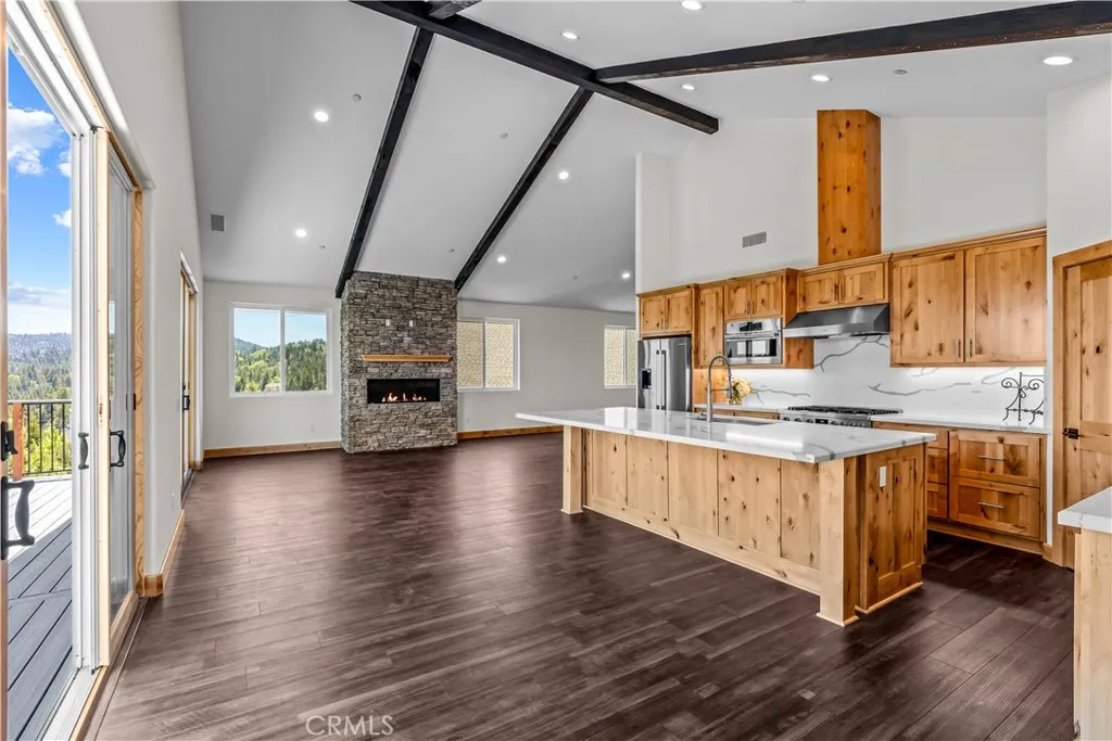 Welcome to your mountain sanctuary! Step inside this newly constructed home and feel all of your troubles melt away. A true escape situated above the golf course with the most breathtaking panoramic views! Amazingly easy access on a maintained road, with lots of level parking & straight into the garage. Once inside you are greeted with vaulted, beamed ceilings & tons of natural light, beautiful LVP flooring & loads of Milgard windows to soak in all of the outdoor beauty. The main level features a spacious living area which adjoins the dining area & open concept kitchen. Huge kitchen island with quartz countertops & stainless appliances, 6 burner Bosch range, built in microwave & walk in pantry! Room for huge dining table along with seating for 6 along the island bar. This is the perfect house for entertaining! Enjoy the floor to ceiling fireplace while gazing out the window & slider surround. The sliding glass doors are Milgard vinyl clad wood which are not only beautiful but functional, offering and extra wide opening out onto the oversized deck. The views are nothing but spectacular all the way from the high desert to Heaps Peak and over to the golf course & country club. Just imagine yourself enjoying those warm summer evenings soaking in the surrounding lights & starlit sky views! The main level also features a bedroom & full bath along with a powder room. Downstairs you will find your very spacious primary suite complete with it's own deck. There is also a spacious bath featuring a soaking tub and walk in shower. There are two other good sized bedrooms on the lower lev