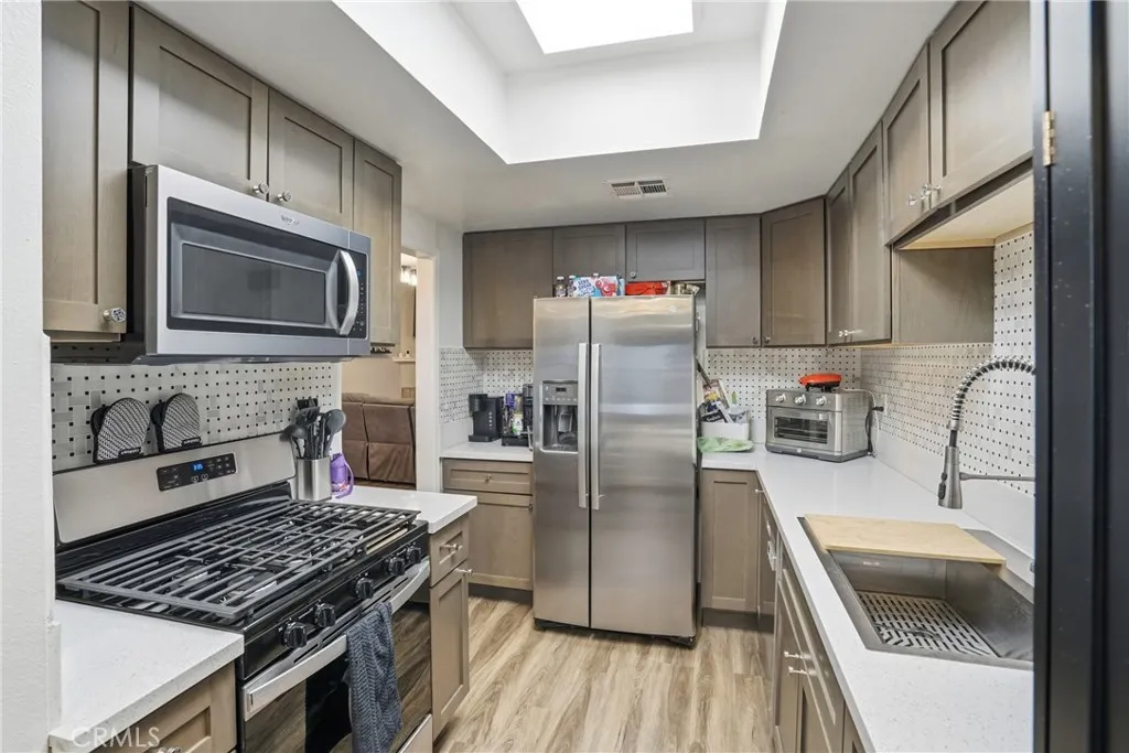 WOW! Welcome to a fully remodeled, multi-level townhome in the heart of Lake Balboa, just a short stroll from the serene oasis of Balboa Lake Park! This modern showpiece is packed with high-end upgrades and thoughtful design with newer laminate wood flooring, new designer paint, and premium light fixtures that elevate every room. The brand-new kitchen is a true highlight, featuring soft-close cabinets, Quartz Sparkling Ice countertops, stainless steel appliances, all complemented by a cozy breakfast nook just off the kitchen. Upstairs, you'll find 2 spacious bedrooms, each with its own full baths ideal for privacy and convenience. The primary suite is a retreat of its own, offering his-and-hers closets & a relaxing Jacuzzi tub. Both baths shine with new high-end vanities & stone quartz counters. You'll also enjoy a linen closet and a full-size laundry closet for added practicality. Abundant natural light flows through 4 glass sliding doors, leading to three separate balconies perfect for morning coffee, fresh air, or outdoor unwinding. The home also includes a large private garage with built-in storage shelving, providing exceptional space rarely found in townhome living. The well-maintained HOA offers a pool, hot tub, BBQ area, water, fire & EQ Ins. Get up, get out, go get it!