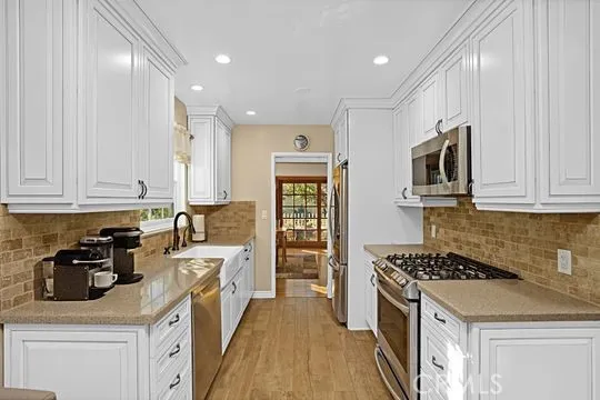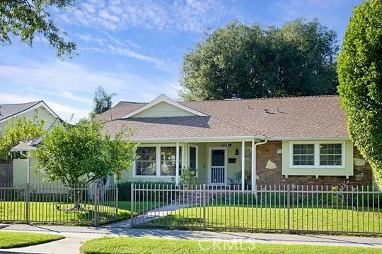 Welcome home to this Traditional 3BR/2BA Mid-Century Ranch situated in Lake Balboa, long coveted for its central location to everything the San Fernando Valley has to offer! Gorgeous original oak hardwood floors are featured throughout. The Living Room features recessed lighting, a large gas/woodburning stone fireplace and hearth, and an oversized sliding door leading to the covered backyard porch. The fully remodeled Kitchen in 2020 features KraftMaid custom cabinetry, soft-close doors and drawers, quartz countertops, travertine tile backsplash, on-trend features like a farmhouse sink and porcelain wood-look tile flooring, recessed lighting, and SS appliances. A charming built-in Nook, a peninsula that serves the formal Dining Room, and an adjacent Laundry Room with Pantry, complete this smart and functional heart of the home. The Primary Bedroom features 2 generously sized linear closets. Beyond a barn door awaits the bright, remodeled en-suite Primary Bath. Indulge yourself in a white marble vanity with a defog mirror, wood-look porcelain tile floor, and large custom shower featuring a river rock floor, frameless glass enclosure, and rain showerhead. The delightful second Bath offers a restored dual-vanity countertop and ceramic tile flooring. The homes upgrades include newer Milgard replacement windows, full PEX plumbing re-pipe, attic insulation, tankless water heater, 10-yr young roof, freshly painted exterior, ceiling fans, pull-down attic access, and smooth ceilings. The lovely front yard is landscaped with flowering shrubs and fruit trees. Enjoy a variety of rear o