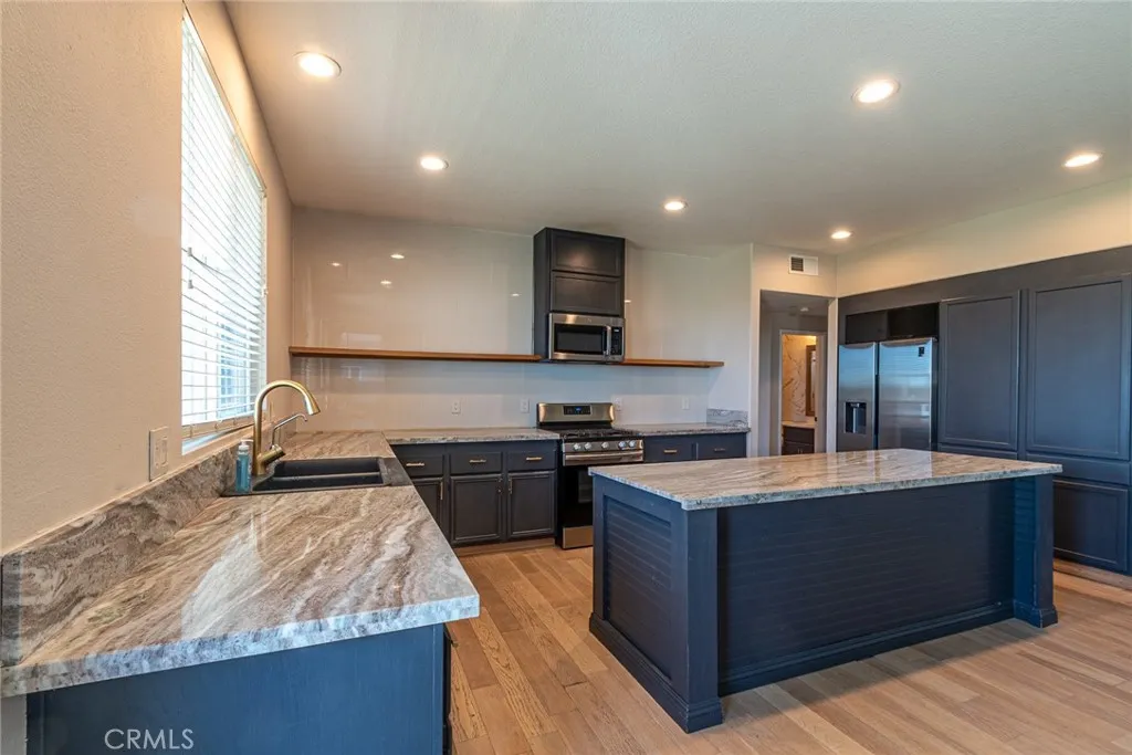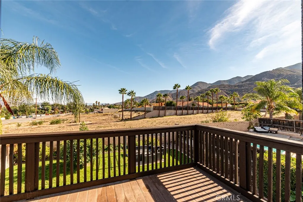 Welcome to this spacious beautifully updated two-story home featuring 4 bedrooms and 3 full bathrooms, ideally located in a desirable Lake Elsinore neighborhood. The entire home has been freshly painted inside and outside offering a bright and modern feel throughout. Stepping through the front door into the formal living room there is a built-in electric fireplace and an entertainment center which is perfect for relaxation or entertaining guests. Continuing into the open-concept dining area is a wine cooler and a remodeled kitchen featuring new stainless-steel appliances, a large island, and ample storage cabinets. The first floor offers a private bedroom with an adjoining full bath which is ideal for guests or for a home office. A staircase from the living room leads to the second-floor loft which is ideal for a family room, a study, or a media area. The laundry room is conveniently located upstairs near all bedrooms. To the right of the loft are two bedrooms featuring ample closet space and a shared full bathroom. To the left of the loft is the primary suite which offers a peaceful retreat with a sitting area, a walk-in closet, and a luxurious ensuite bathroom featuring dual sinks, a soaking tub, and a separate shower. Stepping out on to the private balcony to the left is a beautiful lake view and to the right is the view of the mountain ranges and valley. The front yard is meticulously landscaped with water-efficient plants, dwarf palm trees, roses, and privacy shrubs. A spacious two-car garage comes equipped with a water filtration system providing clean filtered water