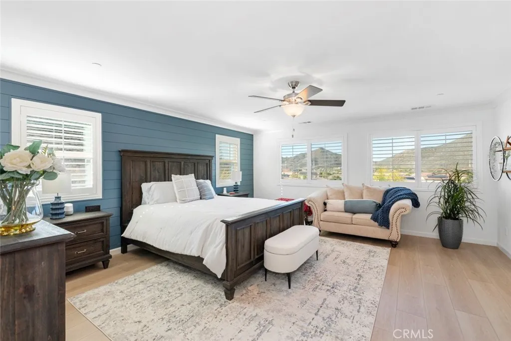 Situated at the end of a cul-de-sac, this immaculate home boasts magnificent curb appeal and shows just like a model. Pride of ownership radiates throughout every inch of this beautifully maintained residence. A decorative leaded-glass entry door welcomes you into a warm and inviting great room highlighted by a stylish shiplap accent wall. The gourmet chefs kitchen is a true showpiece, featuring stainless steel appliances, a decorative backsplash, an ample center island with sink and counter seating, elegant pendant lighting, and a large walk-in pantry. Conveniently located on the main floor is a full downstairs bedroom, ideal for guests, multigenerational living, or a private home office. A beautifully remodeled downstairs bathroom adds even more functionality. A majestic stairwell with upgraded banister leads to the open second floor, which includes two additional bedrooms and a spacious den that can easily serve as a fifth bedroom. The oversized upstairs laundry room offers abundant cabinetry and plenty of space to handle even the most overdue loads. The generous master suite impresses with a decorative shiplap accent wall, crown molding, and beautiful views of the local hills. The luxurious master bathroom features a walk-in shower, separate soaking tub, and dual walk-in closets. Additional interior highlights include elegant tile flooring, engineered wood floors, window shutters, and ceiling fans throughout. Step outside and access your entertainers dream backyard through the upgraded 12-foot slider in the kitchen or the second slider in the dining area. This outdoor s
