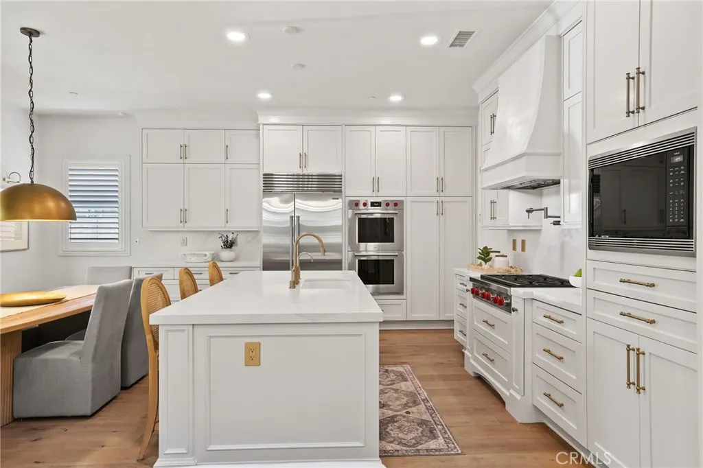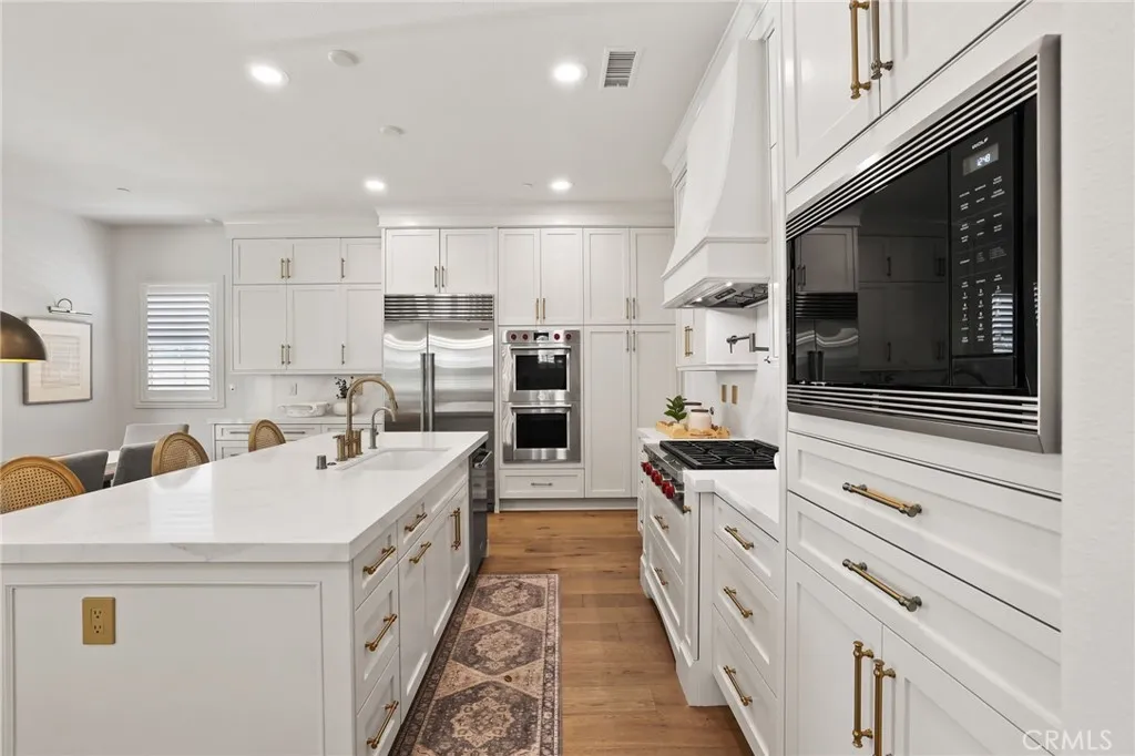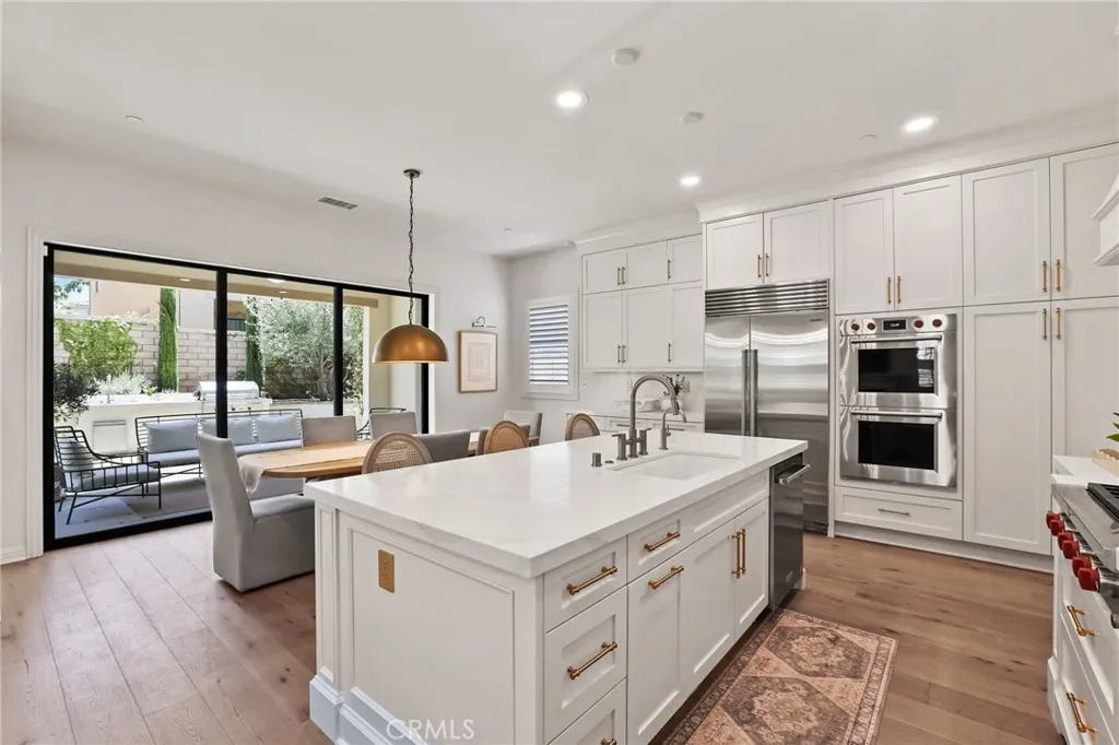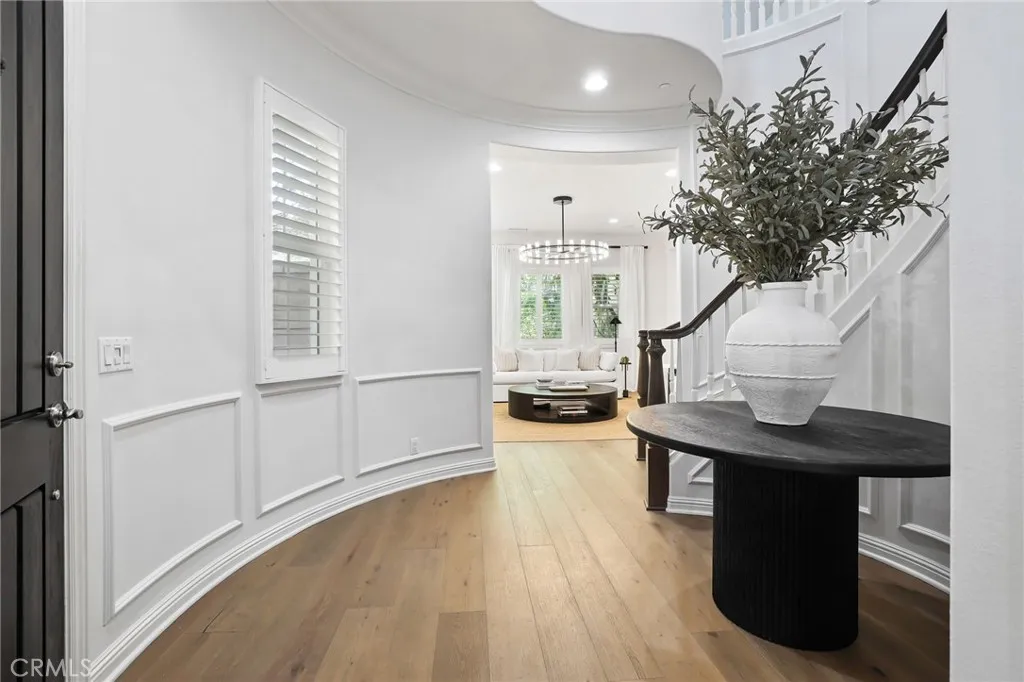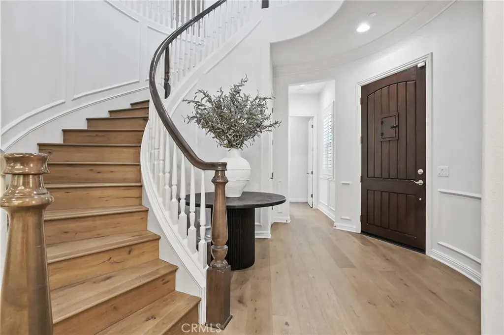 Custom Design and Breathtaking Aesthetics are the Hallmarks of this Exceptional Residence! Live your Dream Lifestyle at 16 Juniper, an Exquisite Warm Architectural Residence in Baker Ranch. This Newly Remodeled Masterpiece is a Quintessential Blend of Sophistication and Design, Tailored for the Discerning Buyer with a Palate for On Trend Serene Luxury. As you enter through the Solid Wood Tuscan Door you are Greeted with Soaring Two-Story Ceilings, Grand Spiral Staircase & Wide Plank European Oak Wood Flooring that Seamlessly Blends Comfort & Functionality. Experience Effortless Elegance in the Chefs DREAM KITCHEN where Serene Simplicity meets Refined Functionality. The Warm Organic kitchen pairs Floor to Ceiling Cabinetry with Neutral Calcatta Elysio Quartz Countertops & Backsplash, Fireclay Sink Basin, Designer Brass Accent Hardware, Wolf Appliance Package w/ Built In Subzero Refrigerator & Sculptural Lighting to Create a Calming yet Elevated Heart of the Home. From your Picturesque Formal Dining Room Area, push open the Sliding Doors for a Fresh Breeze that Perfectly blends to the Serene Lush Landscape of your Outdoor Oasis. The Open Concept Great Rm provides the perfect ambiance for entertaining with Built-In Surround Sound Speakers, Custom Restoration Hardware Iron Curtain Rods, Solid Wood Wainscoting and Neutral Toned Limestone Fireplace. The Downstairs Bedroom and Full Bathroom has been Redesigned with New Calcatta Premata Quartz Countertops, On Trend Moen Brass Hardware, White Marble Shower Tile, Designer Accent Mirrors & Lighting. Follow the Stunning Spiral Staircas