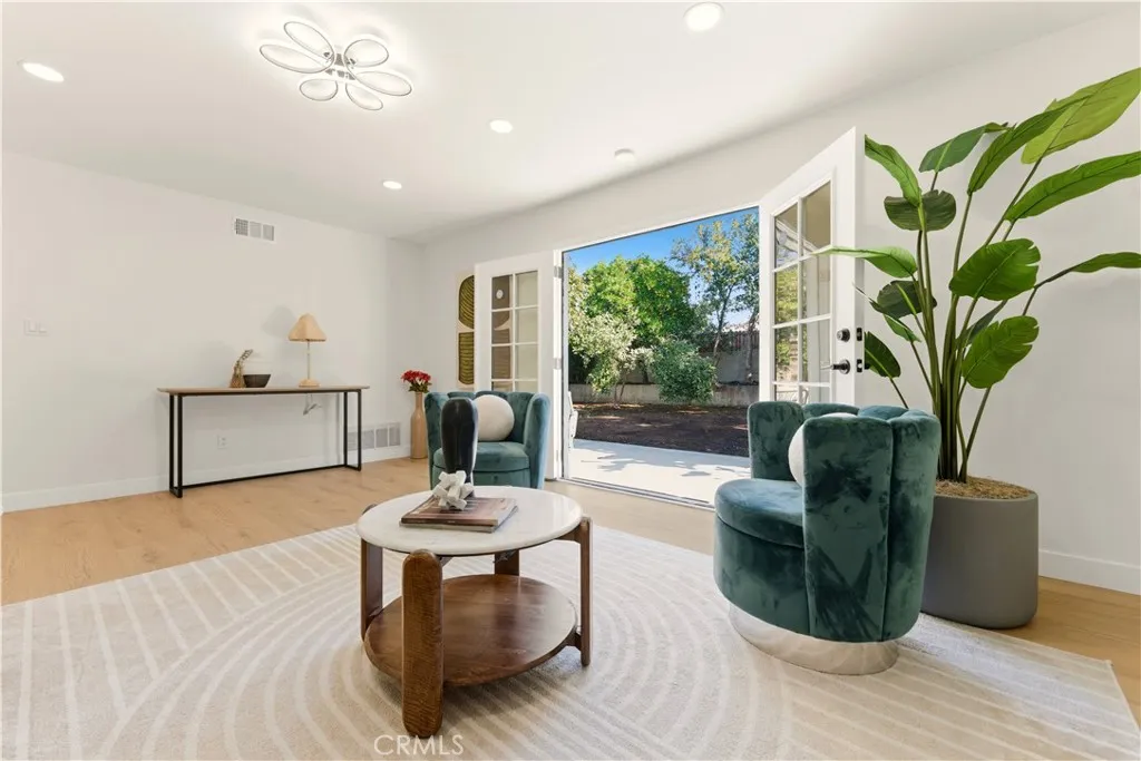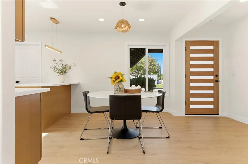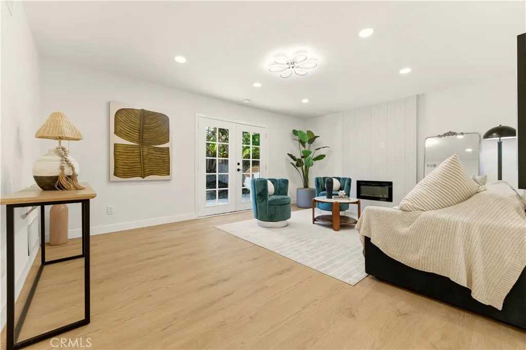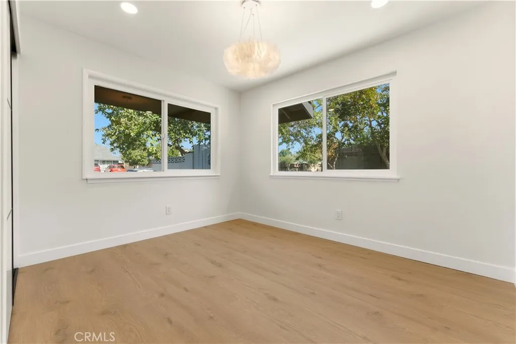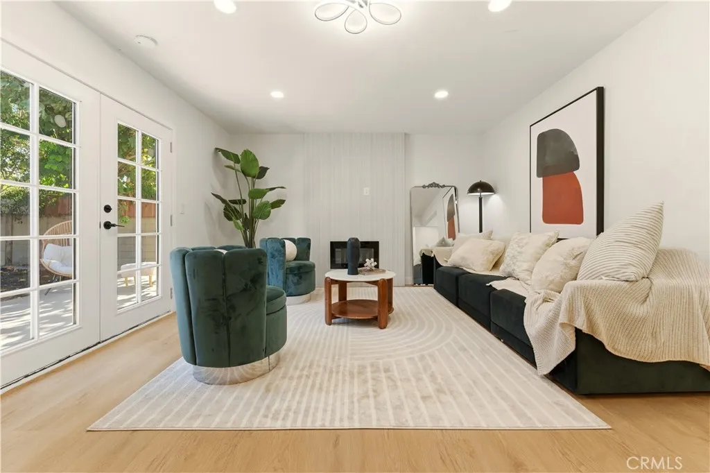 This stunning home offers an exceptional opportunity to reside in one of Orange Countys most sought-after and progressive neighborhoods. The property is meticulously designed with modern upgrades and thoughtful details. Situated on a spacious corner lot, the home boasts a seamless flow throughout its interior. Upon entering, youll be captivated by the sophisticated and elegant features, including brand-new hardwood flooring, updated light fixtures, freshly installed windows, and fresh paint inside and out. The gourmet kitchen is a chefs dream, featuring top-of-the-line appliances, quartzite countertops, custom cabinetry, and a breakfast bar that opens to an informal dining area. The open-concept floor plan effortlessly connects the kitchen and dining area to the expansive family room, which is enhanced by a chic fireplace and French doors that lead to the enchanting backyard. The outdoor space is a true oasis, complete with a variety of fruit trees, including guava, persimmon, pomegranate, orange, fig, and even a rare sugar apple tree. Additionally, the property offers convenient RV parking. The primary suite is a tranquil retreat within the home, featuring a fully renovated bathroom with modern hardware and a walk-in shower adorned with a full backsplash. Two additional spacious bedrooms include large closets and stylish lighting, providing easy access to the shared bathroom with updated fixtures. Additional highlights include recessed lighting throughout, new interior and exterior doors, a new garage door, an upgraded HVAC system, and a new water heater. Every detail has