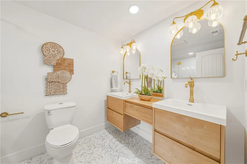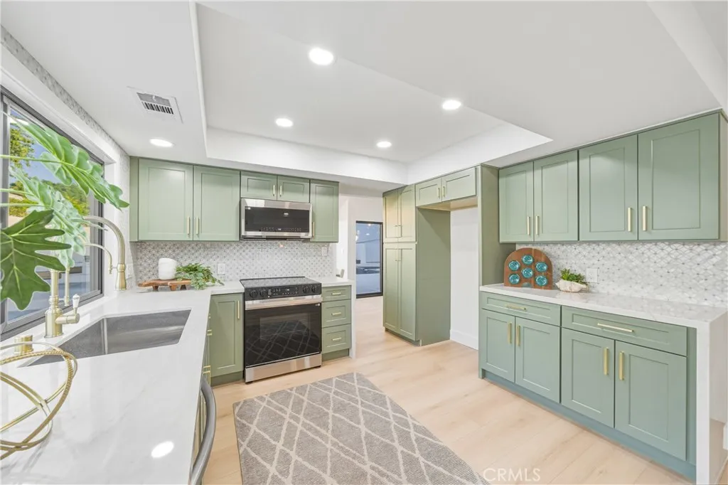 Situated near the end of a quiet, secluded, interior, cul-de-sac street is this now completely redone stylish and inviting residence which features a private wrap around pool deck. Just in time for Summer! Starting with great curb appeal that includes mature landscaping, and an expansive resurfaced driveway, enter through a private courtyard into a light, bright and airy home that definitely checks a lot of boxes. With vaulted ceilings, bright neutral paint and great space the formal living spaces welcome you in and set the stage for what can only be described as a must-see opportunity. Showcasing a wall of windows looking out to the pool yard the formal living room has great space, a statement piece stone-wrapped fireplace and hearth, recessed lighting and all of this opens out to the deck, through wide-opening double sliding doors, and to the adjacent formal dining room. An abundance of natural light bathes these spaces from large windows that invite the pool deck in allowing one to enjoy true indoor/outdoor living. Beyond the dining room is a completely updated chefs kitchen that has all new everything including quartz counters, elegant cabinetry, all new hardware, lighting and fixtures and stainless-steel appliances. Adjacent is a separate family room perfect for casual lounging or taking in your latest streaming guilty pleasure. Back near the double door entry, off the formal living room, is a hallway that leads to three completely redone rooms and those start with a large primary bedroom which has private access to the pool deck, a spa-like ensuite with a dual sink va
