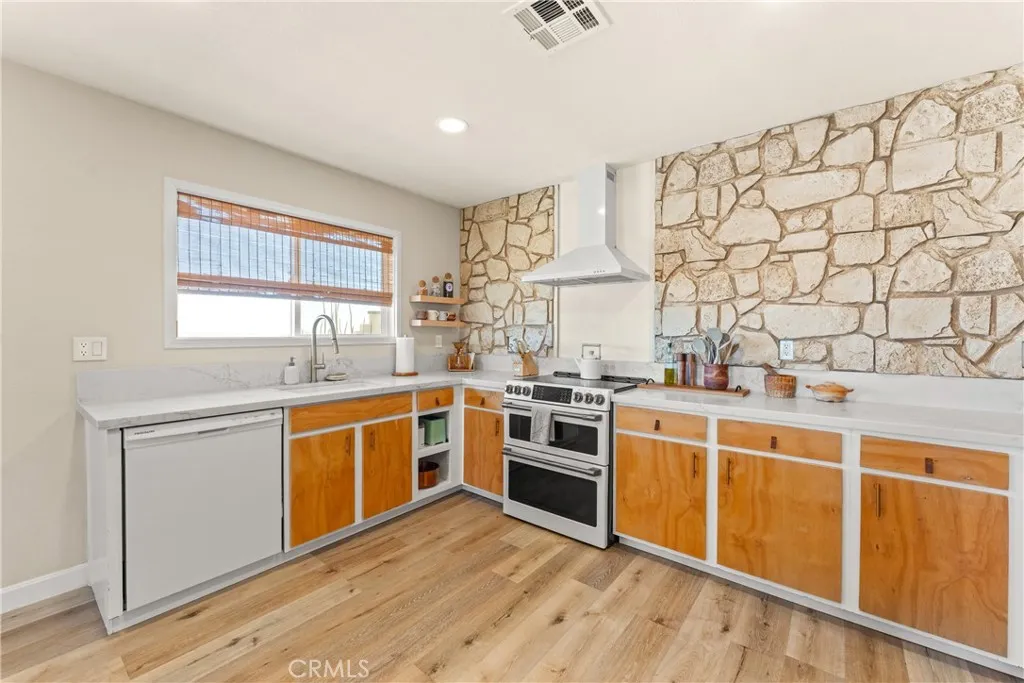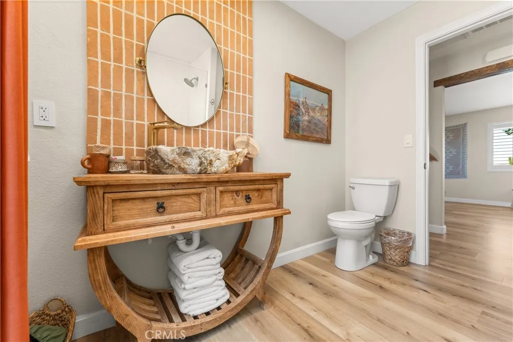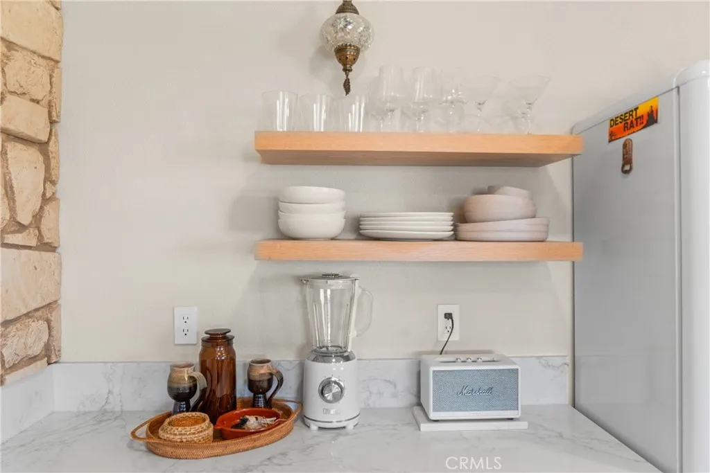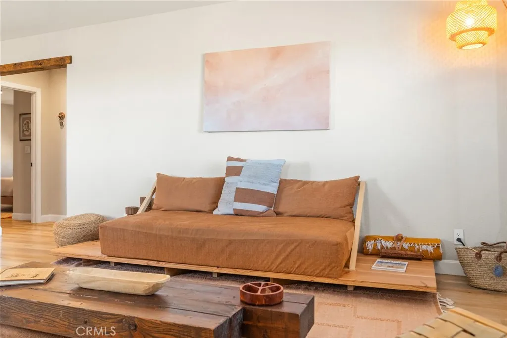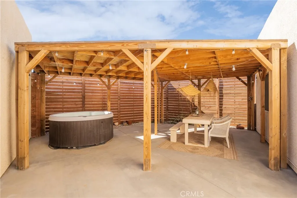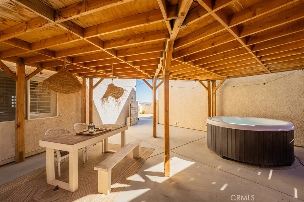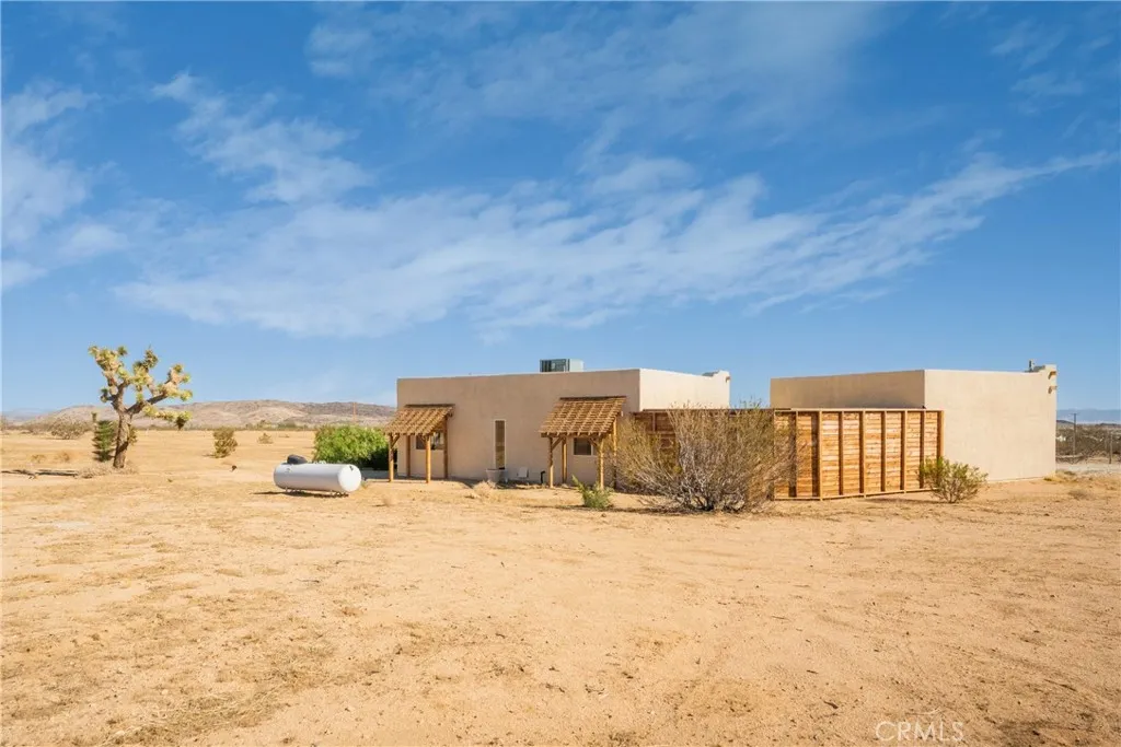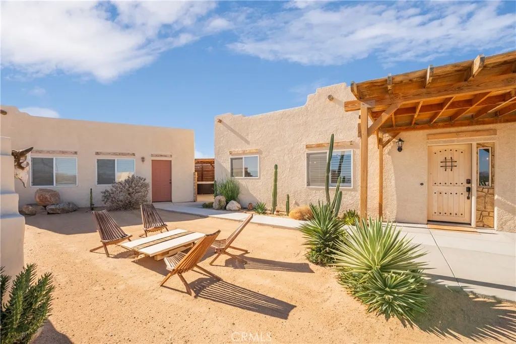 Welcome to "Moonstone Adobe," your gateway to a tranquil desert oasis that perfectly balances seclusion with accessibility. This captivating single-family residence is an idyllic retreat for anyone from the intrepid investor to the first-time homebuyer seeking a unique escape or a profitable vacation rental. Meticulously updated, the home welcomes you with a stunning fusion of modern luxury and traditional charm. Inside, the space is adorned with sustainable luxury bamboo flooring, a testament to the home's eco-friendly ethos. Smart home features such as a thermostat ensure comfort is always at your fingertips, while high-end window shutters offer picturesque views of the surrounding mountains, providing a canvas of natural beauty. The living space is anchored by a custom-built fireplace, perfect for intimate gatherings in the private courtyard, where the stars above create a magical ambiance. The kitchen and bathroom boast natural stone elements that evoke the raw elegance of the desert landscape. Step outside, and you'll find a secluded hot tub nestled within the antique double-door entry of the courtyard, offering a private haven for relaxation. The property's expanse allows room for imagination, whether it's cultivating a desert garden or adding personalized touches to the 2.3-acre canvas. Security is also taken care of with a solar-powered gate leading to a 2-car garage equipped with laundry facilities. The fully fenced yard ensures both safety and the potential for future development. Situated within reach of local culinary gems, holistic experiences, and outdoor adve