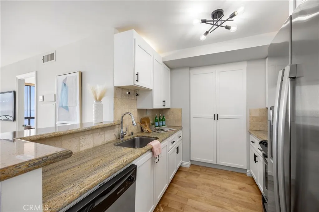 Enjoy the stunning sweeping Pacific views in this beautifully refreshed Queens Surf oceanfront residenceperfectly positioned on one of the upper floors and right on the sand. This is beachfront living done right, where nearly every window captures a postcard-worthy scene and the shoreline feels like an extension of your home. Inside, the updated finishes including gorgeous refinished wood floors, central air, and recessed lighting create a bright, welcoming vibe that pairs effortlessly with the coastal setting. The renovated kitchen features sleek stone countertops, stainless steel appliances, and a breakfast barideal for casual meals with the ocean as your backdrop. Sliding glass doors from both the living area and primary suite open to a generous private balcony, setting the stage for sunrise coffee, afternoon sea breezes, and sunset cocktails. The primary suite is a true retreat with a spacious walk-in closet and a convenient in-unit laundry area with stackable appliances. Both bathrooms have been thoughtfully remodeled with clean, contemporary finishes, adding to the homes polished yet relaxed beach aesthetic. Two reserved gated parking spaces and a secure-access building provide everyday ease and peace of mind. Life at Queens Surf feels like a permanent vacation. Residents enjoy resort-style amenities including a pool, spa, sauna, fitness center, clubhouse, billiards room, and a sun deck overlooking the Pacific. With direct beach access, the bike path, shoreline, and Long Beachs dining and entertainment just steps away, this is more than a condoits a front-row seat to