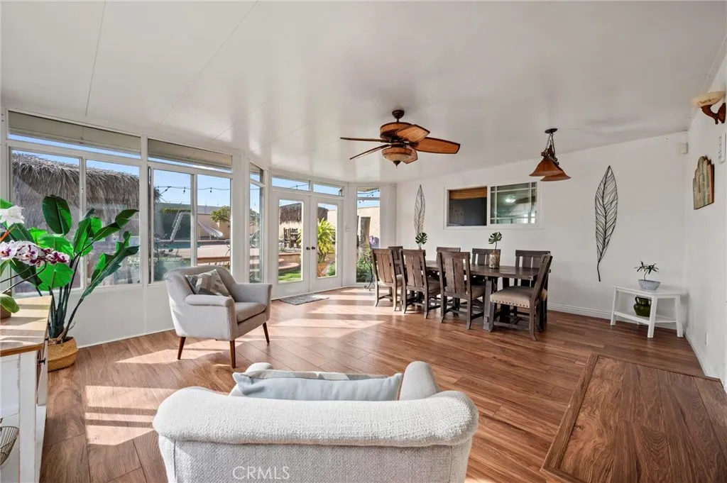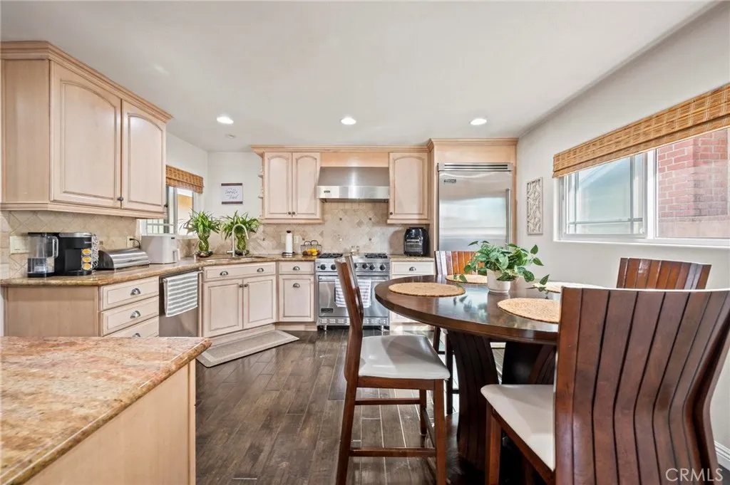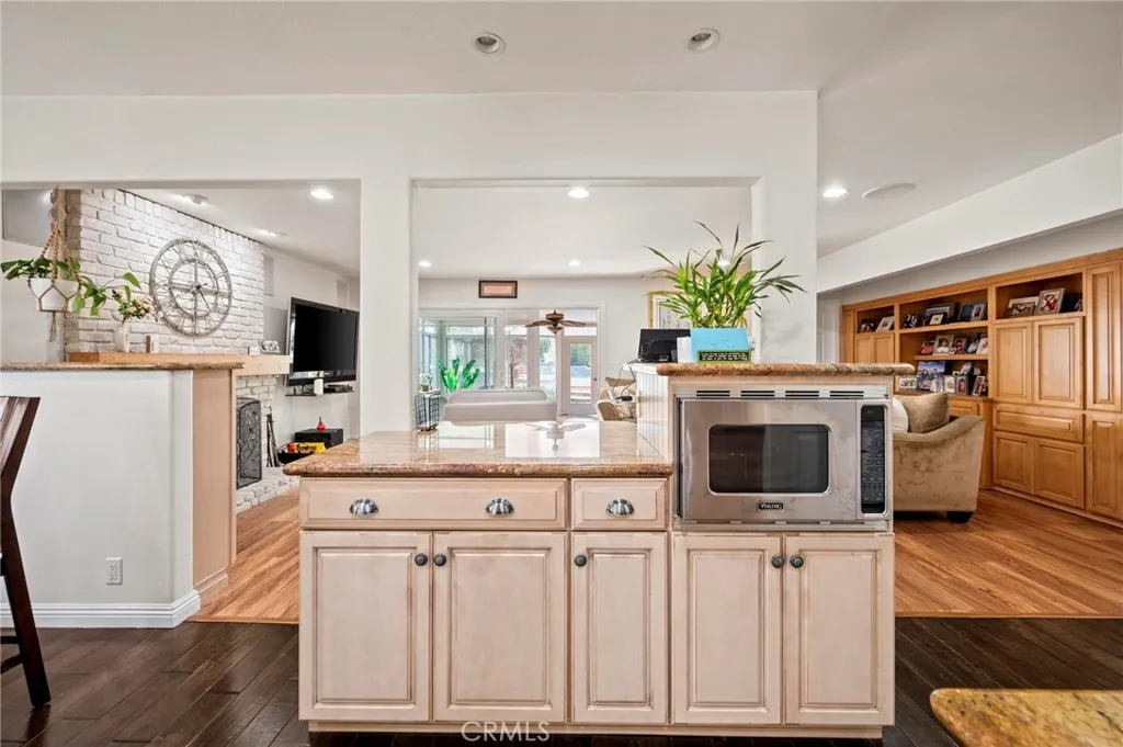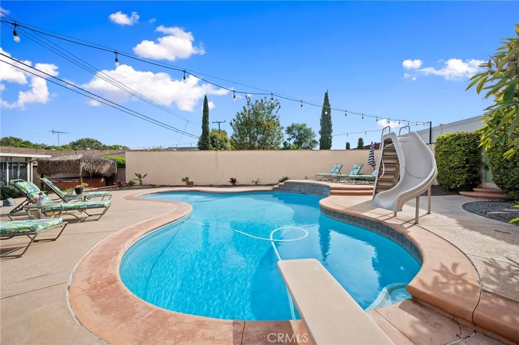 Situated in the Imperial Estates neighborhood of Long Beach on an oversized 8,000 sqft lot made up of two parcels. The open concept main living area features hardwood flooring through the entryway and kitchen, laminate flooring in the living room, recessed lighting throughout, a wood burning fireplace in the living room, and built in shelving and cabinetry along the family room wall and hallway that add warmth and storage. The kitchen flows into the main living area through a breakfast bar and features top of the line Viking stainless steel appliances including a six-burner range with hood, built in refrigerator, dishwasher, and microwave, along with granite countertops and a stone tile backsplash. Three bedrooms, including a primary suite with an en suite bathroom. A second full bathroom serves the additional bedrooms. The backyard is built for entertaining, with an in-ground pool, a separate hot tub tucked under a tiki cabana, a grass area, and BBQ space. Additional features include an attached two car garage, a roof replaced in March 2021, and an active solar system. Conveniently located near shopping, dining, and freeway access.