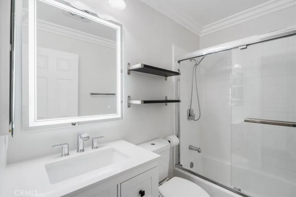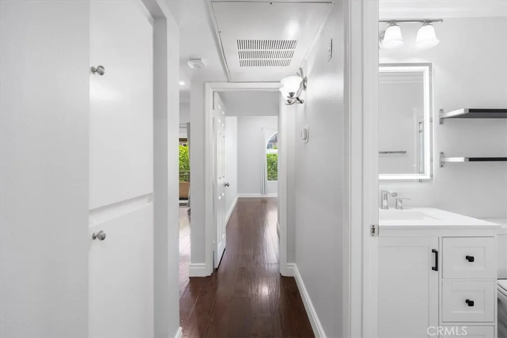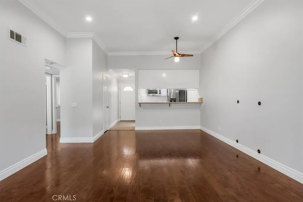 Welcome to The Palms, a hidden gem in the heart of downtown Long Beach! This beautifully updated top-floor 2-bedroom, 2-bath condo offers the perfect blend of modern comfort and coastal city living. Nestled within a lush tropical-style courtyard community, this light-filled residence features an open-concept layout with elegant hand-scraped wood flooring, recessed lighting, crown molding, and an inviting flow designed for both relaxing and entertaining. The living room is pre-wired for surround sound, creating the ideal setup for movie nights and immersive entertainment. The spacious living and dining area opens to a private balcony, creating the perfect indoor-outdoor retreat. The updated kitchen showcases crisp white cabinetry, black stainless steel appliances, generous storage space, and a convenient breakfast bar overlooking the main living area. A skylight fills the kitchen with natural light, enhancing the bright and airy feel of the space. The oversized primary suite features soaring high ceilings that enhance the spacious feel of the room, along with abundant closet space and a beautifully updated en-suite bath. Both bedroom closets have been upgraded with FreedomRail closet systems, offering exceptional organization and functionality. The second bedroom is generously sized and ideal for guests, a home office, or roommates. Both bathrooms have been tastefully upgraded with modern vanities, illuminated mirrors, and clean contemporary finishes. Additional highlights include secured entry access, two side-by-side parking spaces, and two secured RIDGID storage bins affi