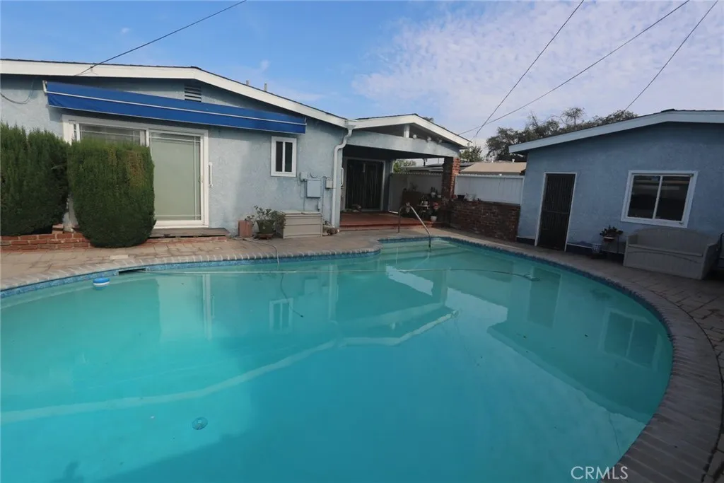 Great Area. 3 Bedroom, 1.75 Bathrooms, Living Room and Family Room. Built-in Pool in Private Backyard. Approximately 1574 Sq. Ft. Pool in backyard is separated from Double Garage Detachedand Fenced in Driveway for Safety and Privacy. Lot Size is Approximately 6689 Sq. Ft. Entry way at front door has an entry area with coat or utility closet. Enter into the Living Room with Brick wood burning fireplace, open beam ceilings and wood plank flooring. Mini-Split and Heat Pump for cooling and heating. Family Room has plank laminate flooring and is adjacent to the Living Room. Also has Minii-Split A/C and Heat Pump unit and Open Beam Ceiling. Patio Doors allow access to the Backyard which Includes a Built-In Pool, small Patio and Fenced in Private Yard. Kitchen Opens to Family Room. Built-In Electric Stove Top, Built-In Oven, Dishwasher and Granite Counter Tops, Service Porch Off of Kitchen with Door Access to Backyard & Pool. Pool has been Resurfaced Recently along with new Pool Pump. Master Bedroom at Rear of House with access to Pool. Also has a Mini- Split Coolin and heating unit. An Electric Awning that extends to the Approximate Edge of the pool shades the rear of the Master Bedroom. Almost Completely Tiled 3/4 Bath in master Bedroom. Has Skylight and storage with hamper behind door. Master Bathroom Has a Bidet plus a Toilet. HALL Bath hs a Toilet LID Bidet Two Additional Bedrooms Serviced by a Nice Hall Bath Centrally Located. The two windows in the Living Room and the 3rd front Bedroom have power switches for the Blinds. Roof is Approximately 5 Years old. House was fumed in