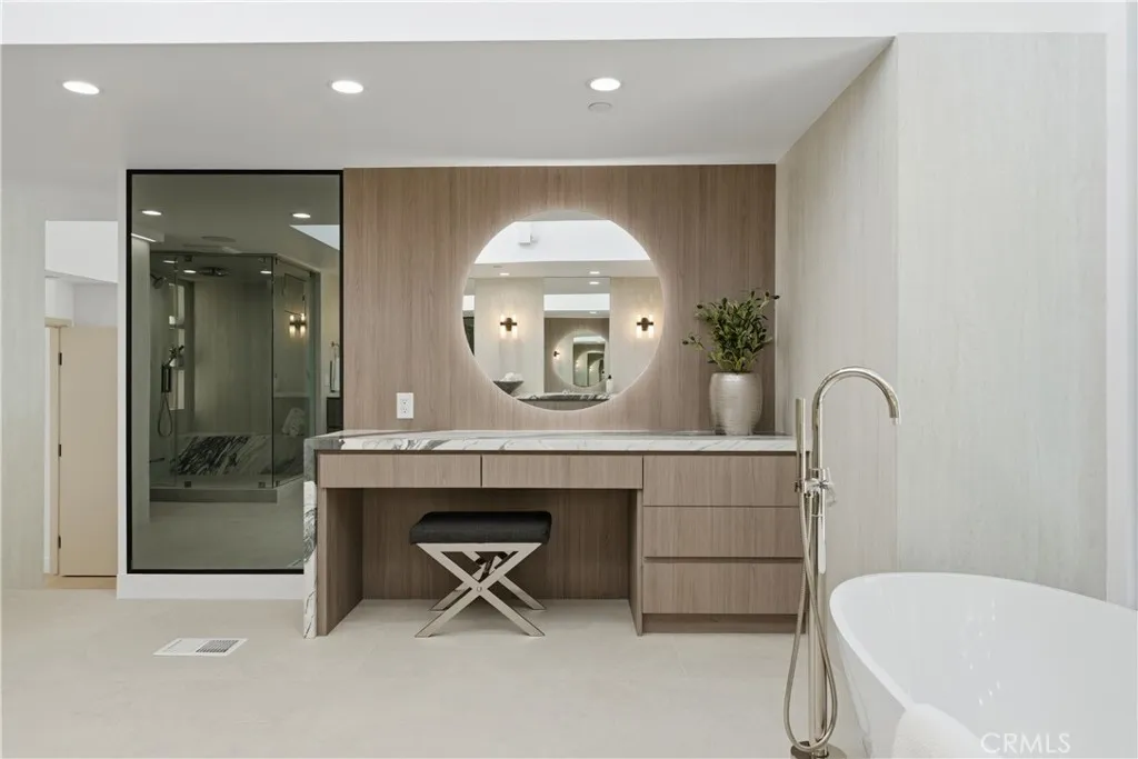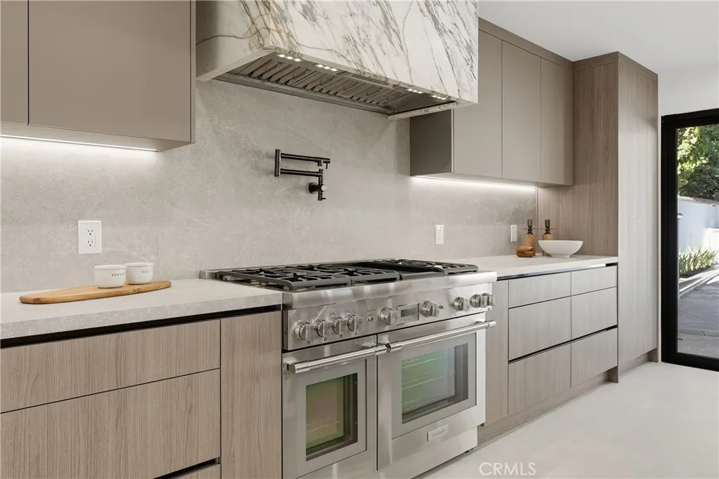 Perched in the coveted Hollywood Hills, this newly reimagined modern home is a striking expression of luxury, design, and harmony with nature. Thoughtfully crafted to elevate everyday living, the residence offers an exceptional indoor-outdoor lifestyle moments from the Sunset Strip and Los Angeles most celebrated dining and nightlife. Spanning six bedrooms and six and a half bathrooms, the home welcomes you with a dramatic open-concept floor plan defined by great spaces and impeccable finishes. The main level showcases oversized 60x60 Italian tile flooring and custom European flat-panel cabinetry throughout. The living room is anchored by a breathtaking Calacatta marble fireplace that flows seamlessly into the dining area and a custom-built wine room ideal for entertaining. The state-of-the-art chefs kitchen blends form and function with Italian porcelain slabs wrapping the oversized island, cabinetry, and backsplash, complemented by Graff fixtures and a Calacatta marble hood. Thermador appliances include a built-in refrigerator, precision coffee system, six-burner range with double oven, dishwasher, and micro-drawer microwave. Custom lighting enhances every detail. A curved staircase illuminated by lighting leads to the private living quarters. The expansive primary suite is a serene retreat, framed by oversized picture windows that invite the surrounding landscape indoors. Custom cabinetry, an oversized walk-in closet, and a spa-inspired bathroom complete the experience. The primary bath features dual vanities topped with Calacatta marble, premium fixtures, a freestanding