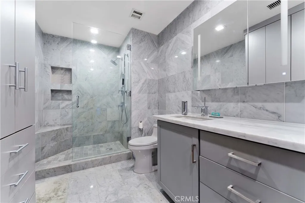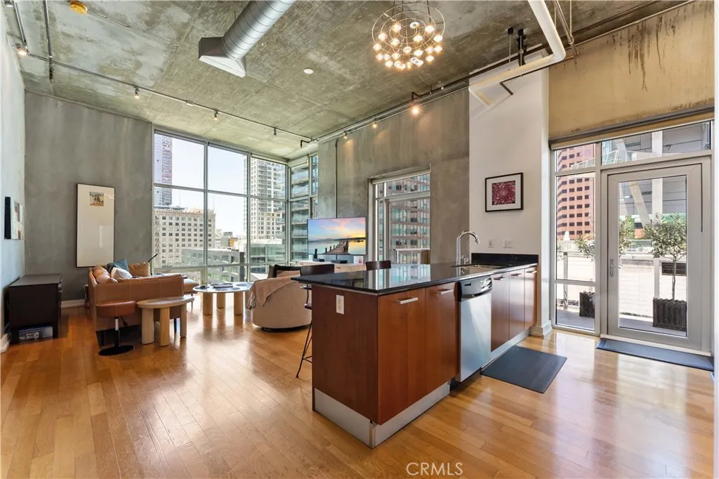 Located on the corner of the top floor, it has 13 ft floor-to-ceiling windows. Exposed concrete walls, open-concept layout, wood flooring and a kitchen with stainless steel appliances. The living space opens to a patio overlooking downtown with plenty of natural light. The primary suite has a renovated bathroom and custom-made closet. Additional conveniences include an in-unit washer/dryer, parking spaces, and an entryway storage closet Enjoy the inviting pool, fitness center, clubhouse, BBQ area, and a private screening room.