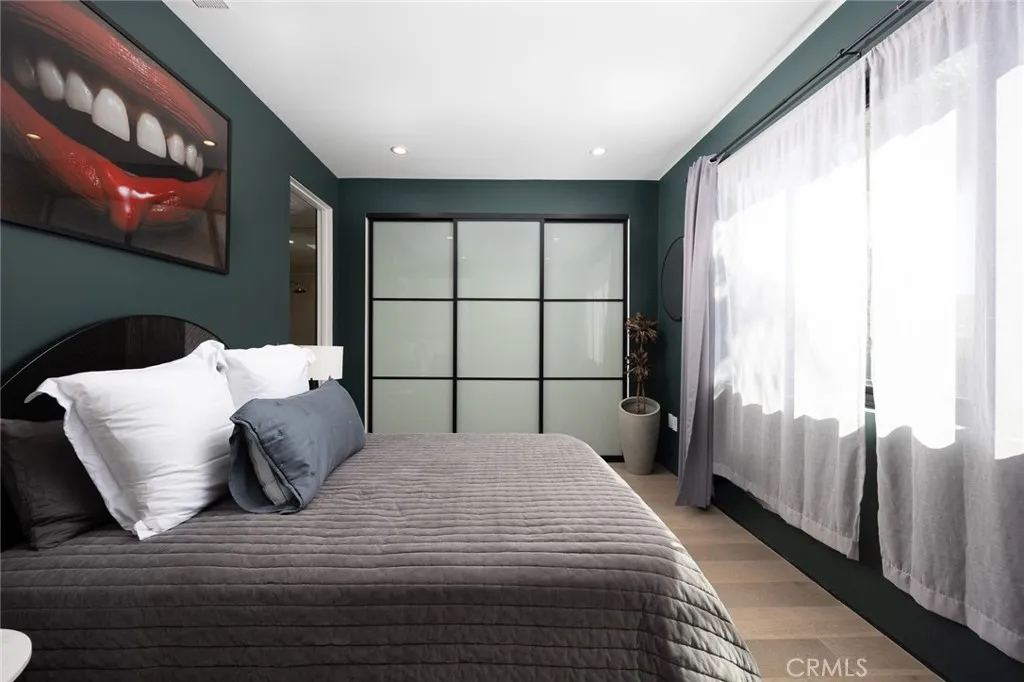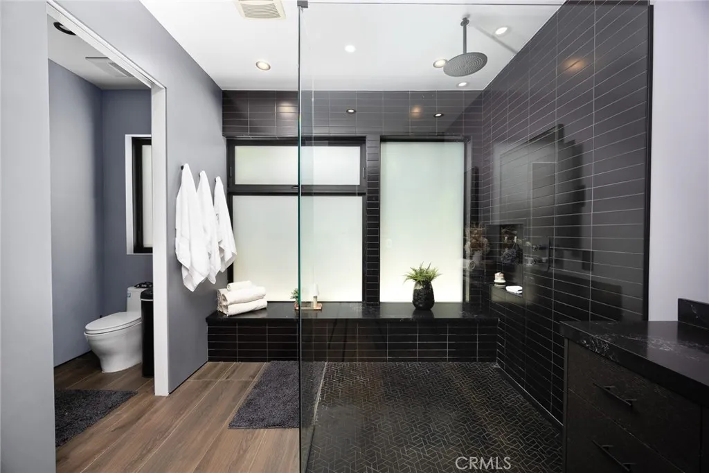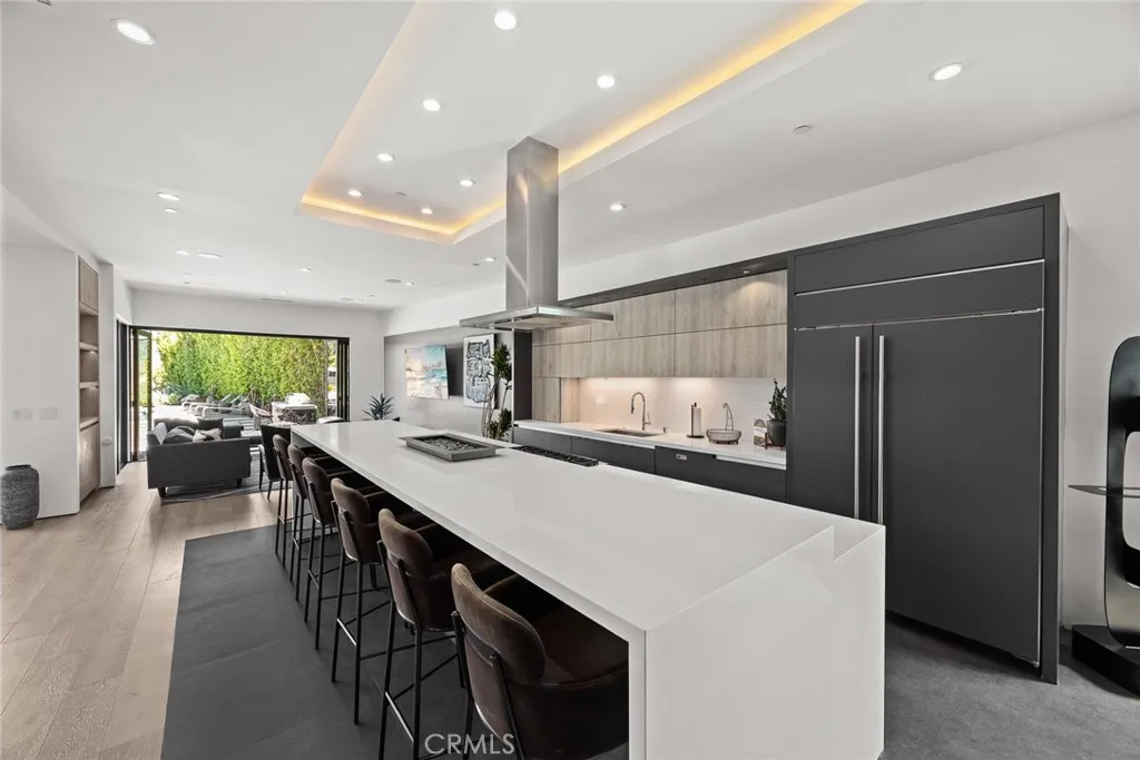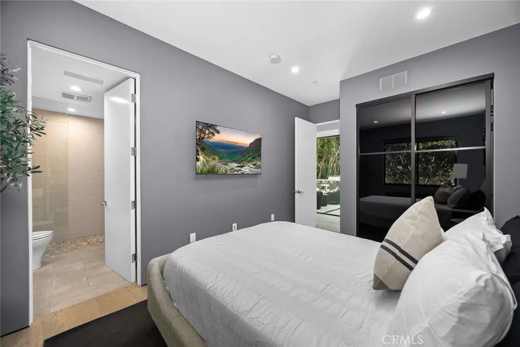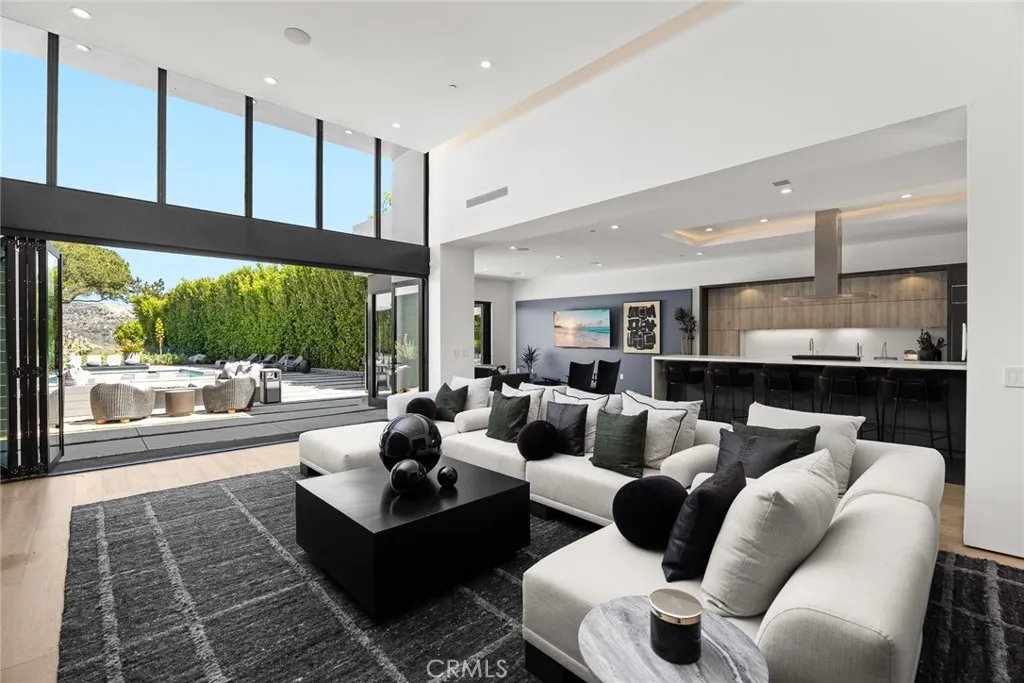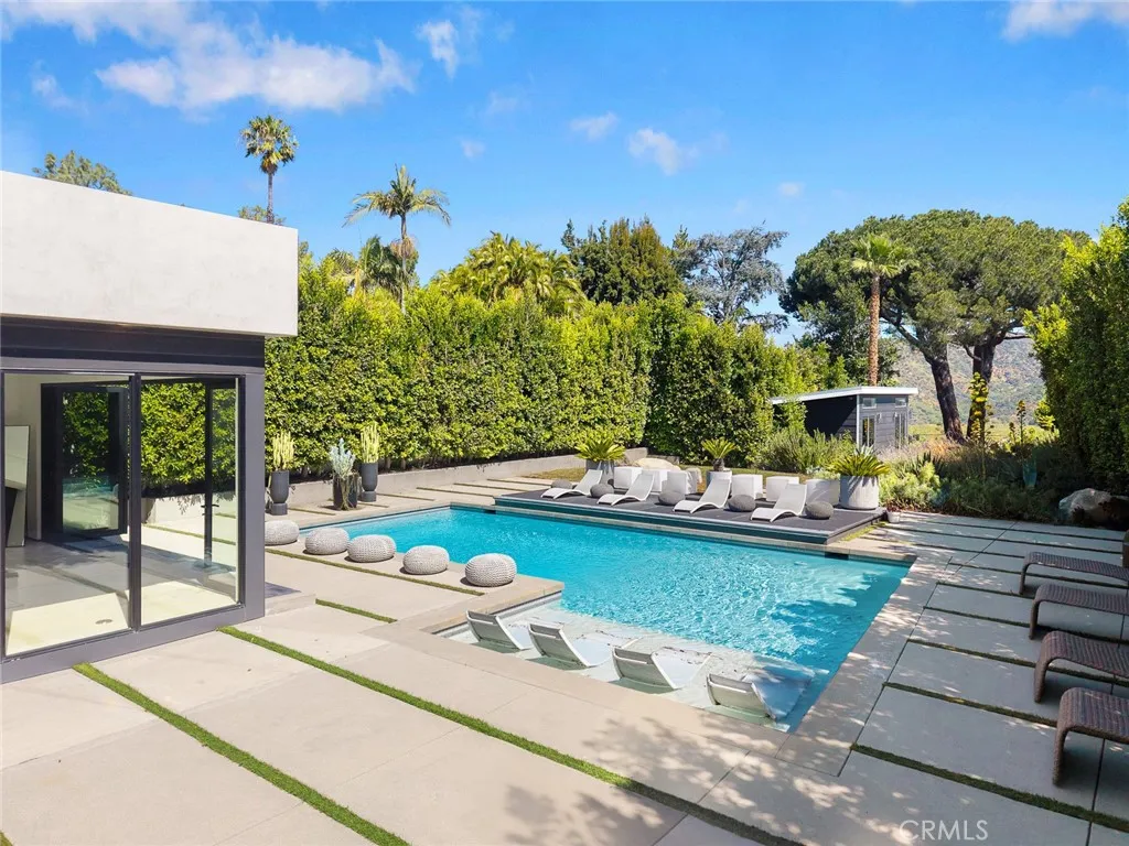 This exceptional 4-bedroom, 5-bathroom contemporary residence sits perched in the prestigious Hollywood Hills, offering sweeping views of the Griffith Observatory, the iconic Hollywood Sign, and the San Fernando Valley. At approximately 3,449 square feet on an expansive 19,164-square-foot lot, the property delivers the rare combination of generous living space and true privacy. The sophisticated single-level design showcases clean architectural lines with a striking balance of white stucco and dark accent walls. Inside, an open-concept layout is anchored by floor-to-ceiling glass walls that flood every room with natural light while framing the panoramic scenery. The living room is scaled for entertaining, with volume and sightlines that draw the eye straight to the view. The gourmet kitchen features sleek cabinetry, premium appliances, and a generous island with bar seating that flows seamlessly into the main living areas. A refined neutral palette ties the spaces together with a calm, elevated feel throughout. Multiple sliding glass doors dissolve the line between indoors and out, opening to an entertainer's backyard with distinct outdoor living zones. The expansive concrete paver patio surrounds a swimming pool with in-water loungers, while multiple seating areas, including a fire feature, offer front-row seats to stunning sunsets and city-light views. Drought-tolerant plantings, mature trees, and architectural succulents complement the home's modern aesthetic while keeping maintenance low. A detached 416-square-foot studio offers flexible space ideal for a home office, c