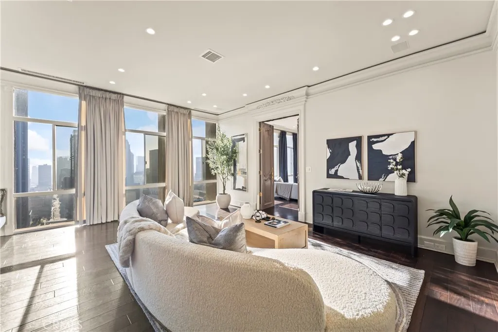 Luxury Live Auction! Bidding to start from $1,400,000! High above the cultural heart of Downtown Los Angeles, this Penthouse at Bunker Hill Tower occupies a rare vantage pointan aerie suspended on the 32nd floor, where the citys skyline becomes both backdrop and art. Recently refreshed in a refined neoclassical palette, the residence blends timeless architectural lines with the openness and light only a true penthouse can offer. Inside, soaring ceilings, exclusive to the top floor, create a sense of vertical drama. Soft architectural detailing, graceful moldings, and beautifully scaled rooms evoke an understated luxury not often found in contemporary high-rise living. Walls of glass pull the city inward, offering uninterrupted views that shift from morning clarity to evening glow. A thoughtfully composed floor plan provides two spacious en-suite bedrooms, two and one-half baths, and a library/den with a built-in wet bar, ideal for quiet study or intimate gatherings. The expansive living and dining areas invite both grand entertaining and elegant everyday living. An in-unit washer/dryer adds modern convenience rarely available in the building. Bunker Hill Tower is one of Los Angeles most enduring full-service addresses, offering an array of amenities more akin to a private resort: a 24-hour concierge, Olympic-size pool, spa, two fitness centers, wet and dry saunas, tennis and pickleball courts, lush outdoor spaces, BBQ areas, and a residents market and salonall seamlessly integrated into daily life. With all utilities included in the HOA, comfort and ease are woven into the