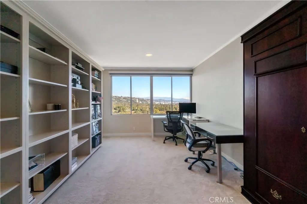 Sophisticated Luxury Living overlooking the Los Angeles Country Club! Experience refined elegance and panoramic views in this stunning 2-bedroom, 2-bath condominium overlooking the pristine greens of the Los Angeles Country Club North. Facing away from Wilshire, this home is located on the quiet side of the building and offers sweeping vistas from every room. Uninterrupted views stretch across the Getty hillsides, Bel-Air and Holmby Hills, to Hollywood Hills and Downtown. Spanning 2,110 square feet, this expansive residence features an open-concept layout designed for both grand entertaining and comfortable everyday living. The entryway boasts sleek cove lighting adding a contemporary touch and highlighting the home's architectural details. Expansive windows flood the interior with natural light by day and stunning sunsets by evening. The large custom kitchen with a grand center island is a true showpiece, featuring exquisite birdseye maple cabinetry and matching granite countertop. The primary suite offers a serene retreat with custom dark wood closets and a marble-clad steam shower that evokes a spa-like atmosphere. The second bedroom and bath mirror the same high level of craftsmanship and design. A separate laudry room offers ample closet space and storage. Additional highlights include custom lighting and CAT-6 wiring throughout the home. Every detail has been thoughtfully curated to create a timeless, sophisticated aesthetic. Located moments from Beverly Hills, Century City, and Westwood, this residence combines privacy, prestige, and unmatched views in one of Los Ang