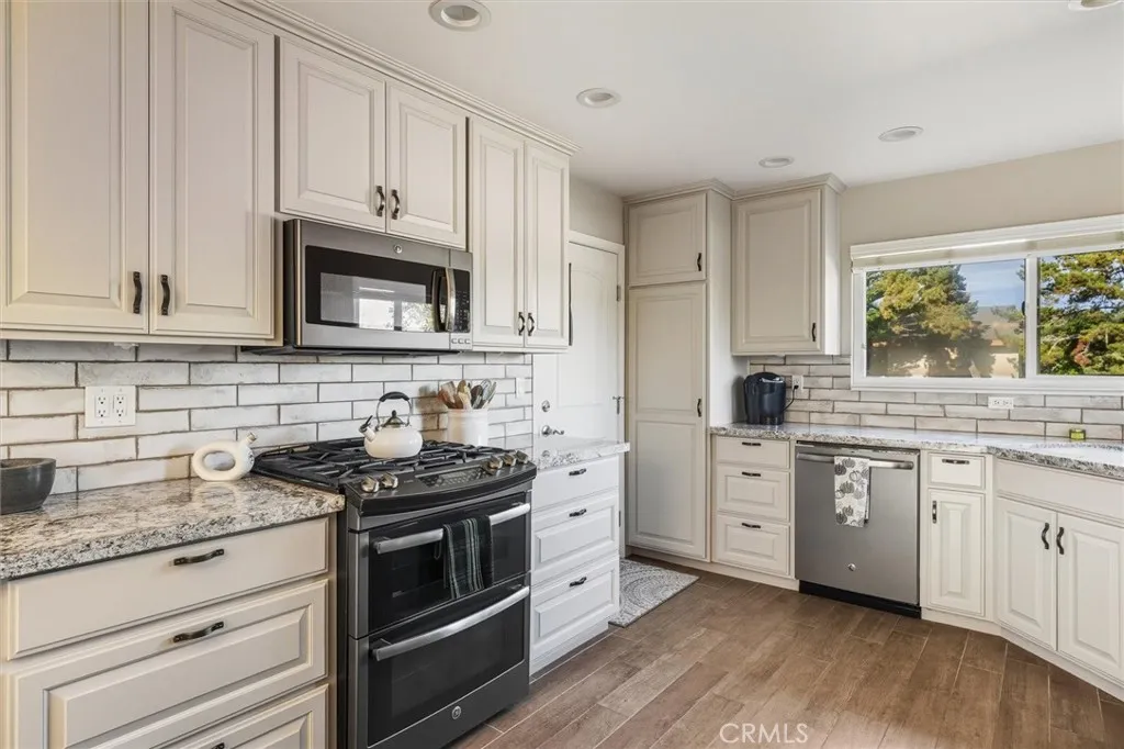 Beautiful single level home in the desirable Bayridge Estates neighborhood of Los Osos. This turnkey three-bedroom, two bath updated home checks all the boxes! Some of the upgrades include fluted glass double entry doors; wood look tile flooring in living areas; newer carpeting in bedrooms; remodeled kitchen with custom cabinetry, soft close cabinet doors/drawers, granite countertops and built-in GE Profile Slate appliances. Refrigerator is included as cabinets were built to spec and gas range has a double oven; canned lighting in kitchen and hallway; volume ceiling in living room with gas log fireplace; tiled bathtub surrounds and granite countertops on bathroom vanities; upgraded interior doors and hardware; lots of light with dual pane windows and sliding glass doors; 2.5" wood blinds throughout; private courtyard patio, two potting sheds for the gardening enthusiast (or use as additional storage) and a large backyard area. All of this on a 10,320 sf corner lot AND a coveted 3 car attached garage with bonus attic storage! Los Osos is a wonderful community and this location has great walkability to the grocery store, post office, hardware store, bakery and restaurants. Make this your next home and experience everything Los Osos has to offer!