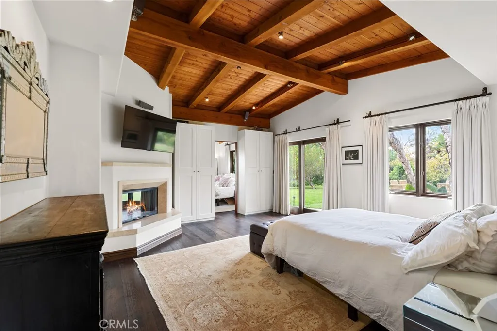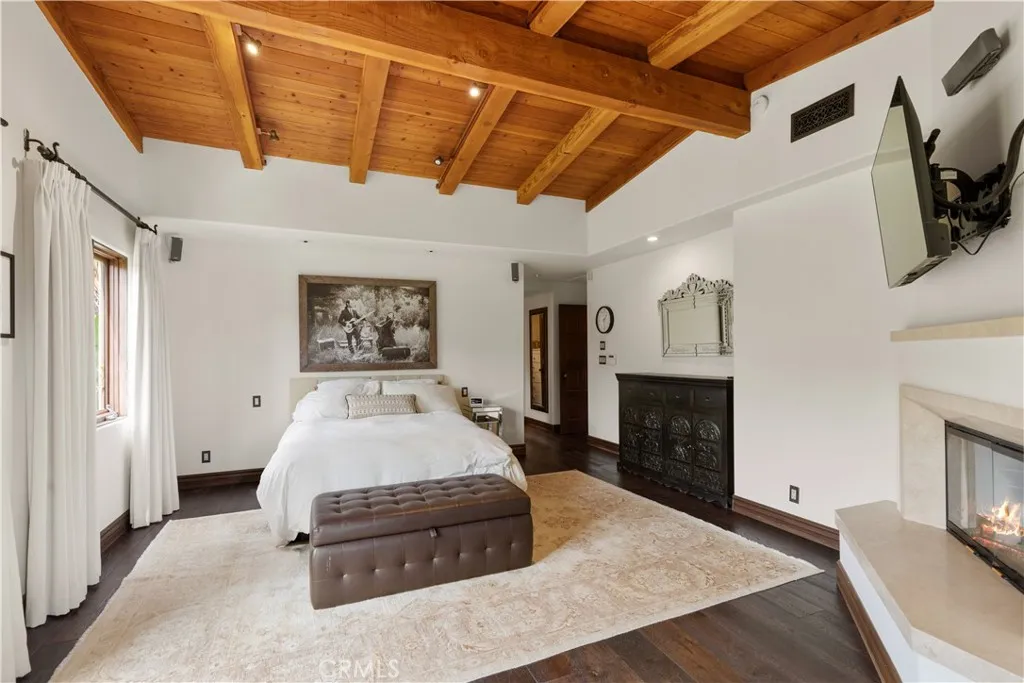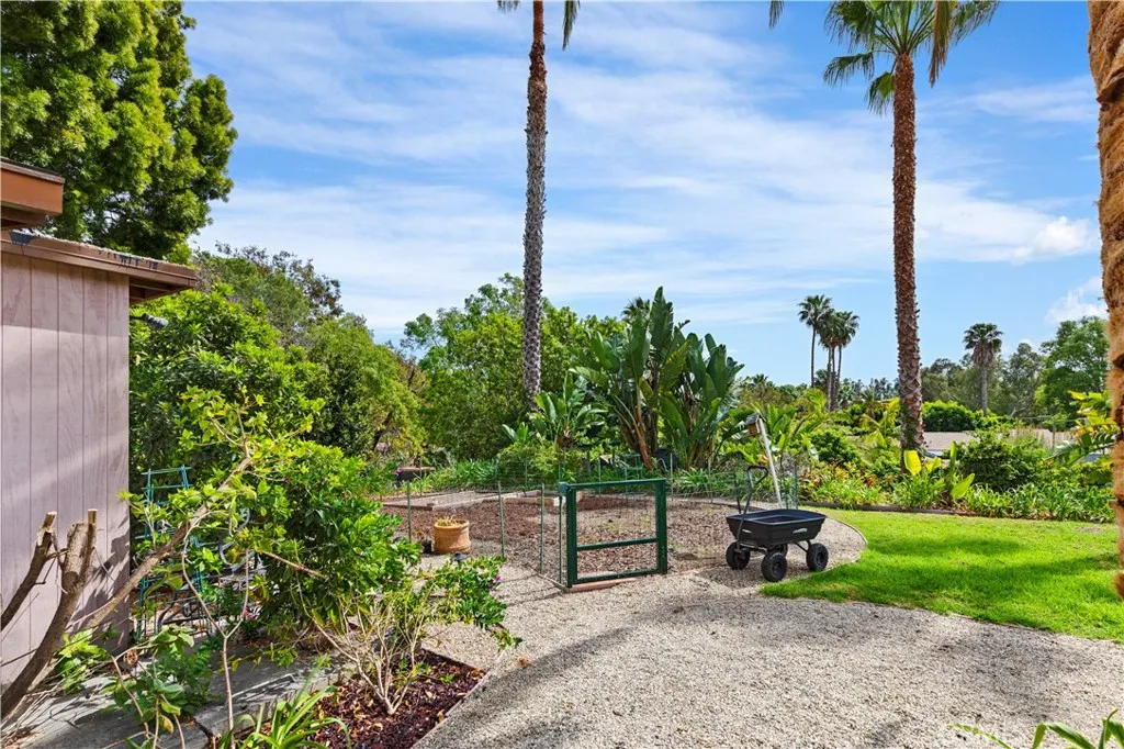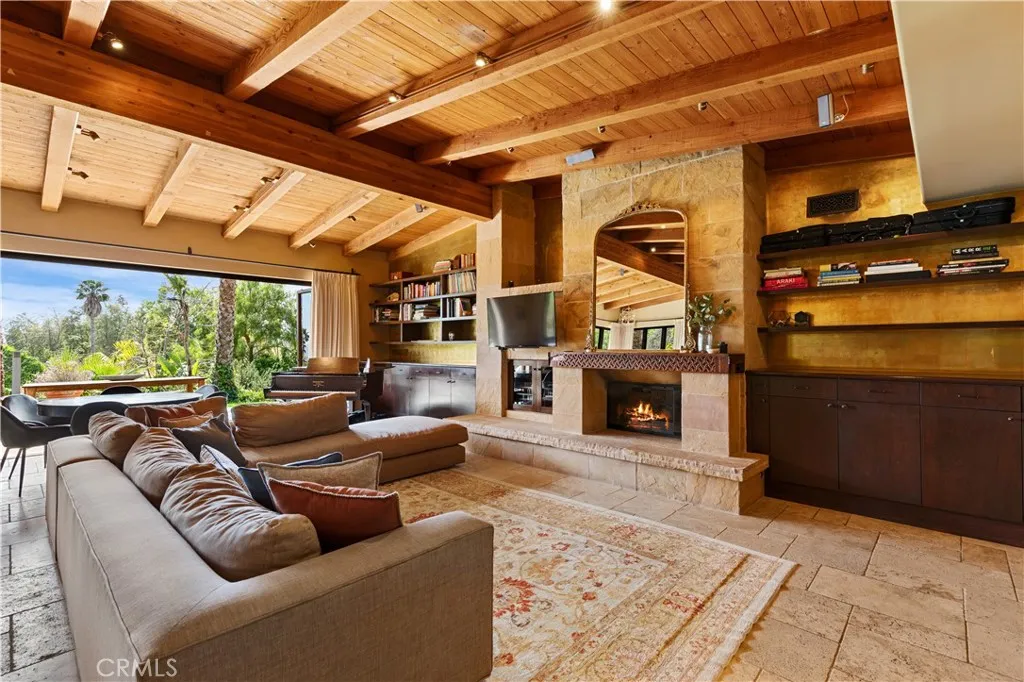 Ocean-view, single-story custom estate located behind a private double-gated entry on approximately one acre of lush, landscaped grounds. This highly upgraded residence offers 4 bedrooms and 4 bathrooms across approximately 3,700 square feet of elegant living space. The expansive property features breathtaking Pacific Ocean views, mature landscaping, fruit trees, an organic garden, and a large grassy lawn overlooking the coastline. Outdoor living is enhanced by extensive stonework surrounding the spa, built-in BBQ center, and an entertainers party deck with observation area. Enter through stone flooring into the grand great room showcasing soaring wood-beamed ceilings, a striking stone fireplace, built-in bookcases, and a flat-screen TV with surround sound. The space opens seamlessly to the custom remodeled chefs kitchen featuring a professional range with pot filler, Sub-Zero refrigerator/freezer, stone countertops, mosaic tile backsplash, wine refrigerator, and center island. Bi-fold doors create exceptional indoor/outdoor living, ideal for entertaining and enjoying the ocean breezes. The primary suite offers stunning ocean views, a cozy fireplace with mounted flat-screen TV, French doors opening to the yard and spa, a generous sitting area with built-in desk and bookshelves, and a beautifully remodeled spa-inspired bath with European-style enclosed steam shower and soaking tub. Additional highlights include a custom home theater with surround sound and lofted viewing lounge. The second bedroom is en-suite and enjoys beautiful ocean views, while the additional bedrooms 3