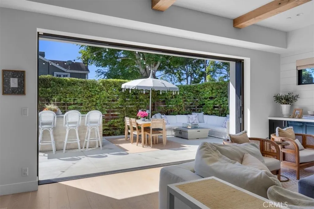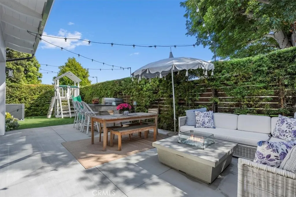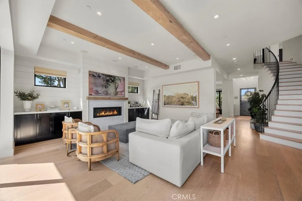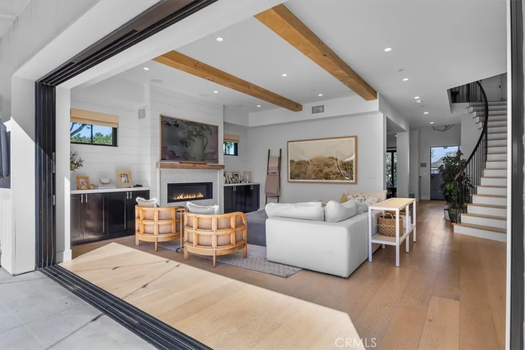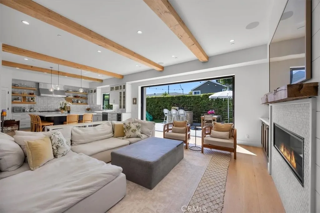 This exceptional five-bedroom, five-bath residence offers a seamless blend of indoor comfort and outdoor sophistication. Designed with timeless craftsmanship and thoughtful detail, the open layout flows effortlessly from welcoming living spaces to a serene backyard retreat. Created in collaboration with a decorator who previously worked closely with Nancy Meyers, the home captures that signature sense of warmth and layered refinementspaces that feel both timeless and effortlessly livable. The family room features reclaimed wood beam ceilings, custom built-ins, and a striking fireplace, opening through concealed stackable sliders to an inviting outdoor lounge with a built-in BBQ, bar counter, and firepit-ready seating area. The professionally landscaped yard includes eco-conscious turf and a spacious play areaideal for entertaining or relaxing in style. The chefs kitchen is both functional and refined, anchored by a generous island with handcrafted cabinetry, floating wood shelving, designer tilework, and stone countertops. A walk-in pantry, beverage bar, and top-tier appliancesincluding a built-in beverage refrigeratorcreate an effortless flow between everyday living and entertaining. A light-filled living room with shiplap accents and a cozy fireplace extends to the covered front porch, while a custom built-in mud area and finished two-car garage add convenience. The main-level guest suite offers private outdoor access, perfect for visitors or a dedicated home office. Upstairs, the primary suite is a tranquil retreat with vaulted reclaimed-wood ceilings, a brick fireplace,